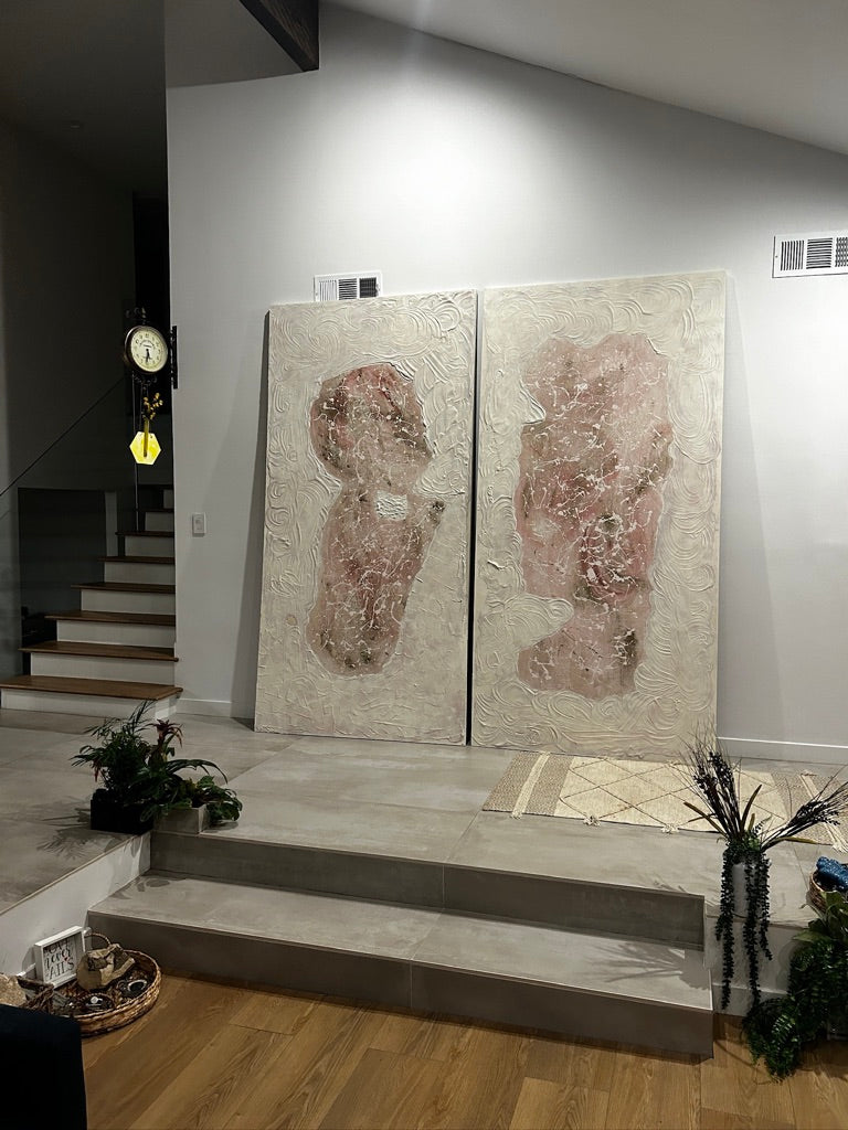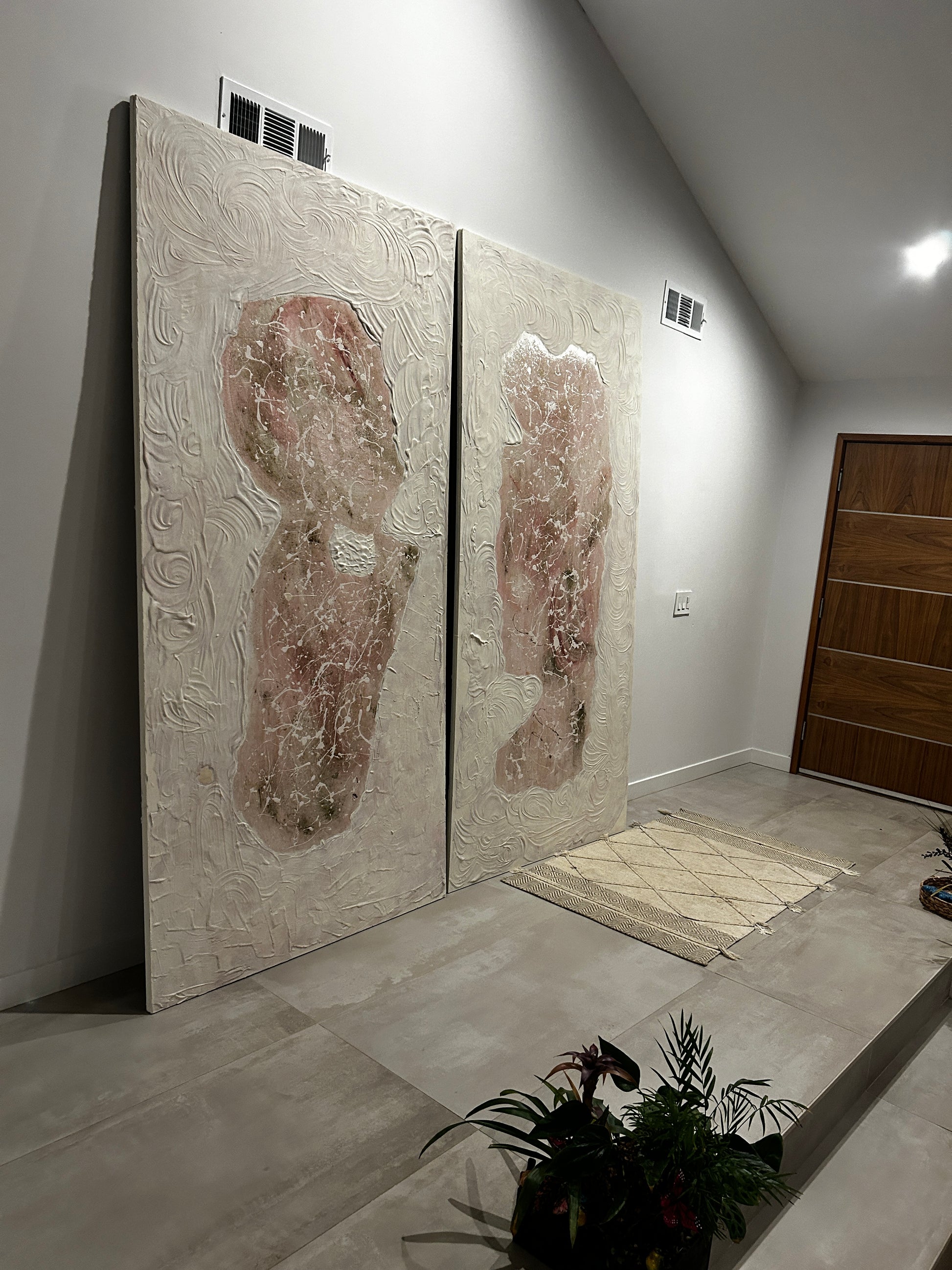 NewBorn. This set features two handmade abstract paintings crafted with plaster and acrylic on wood. Each piece measures 4' by 8', combining for a total display size of 8' by 8'. The artworks showcase metallic earth tone hues, embodying a contemporary abstract aesthetic.