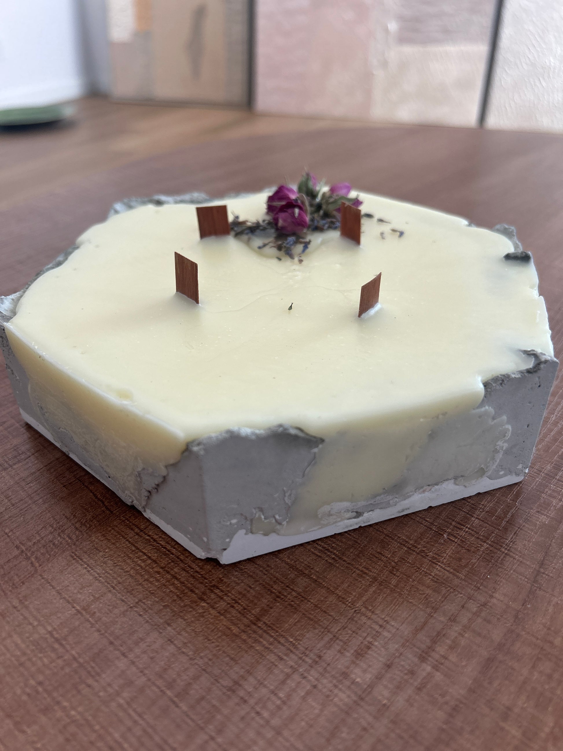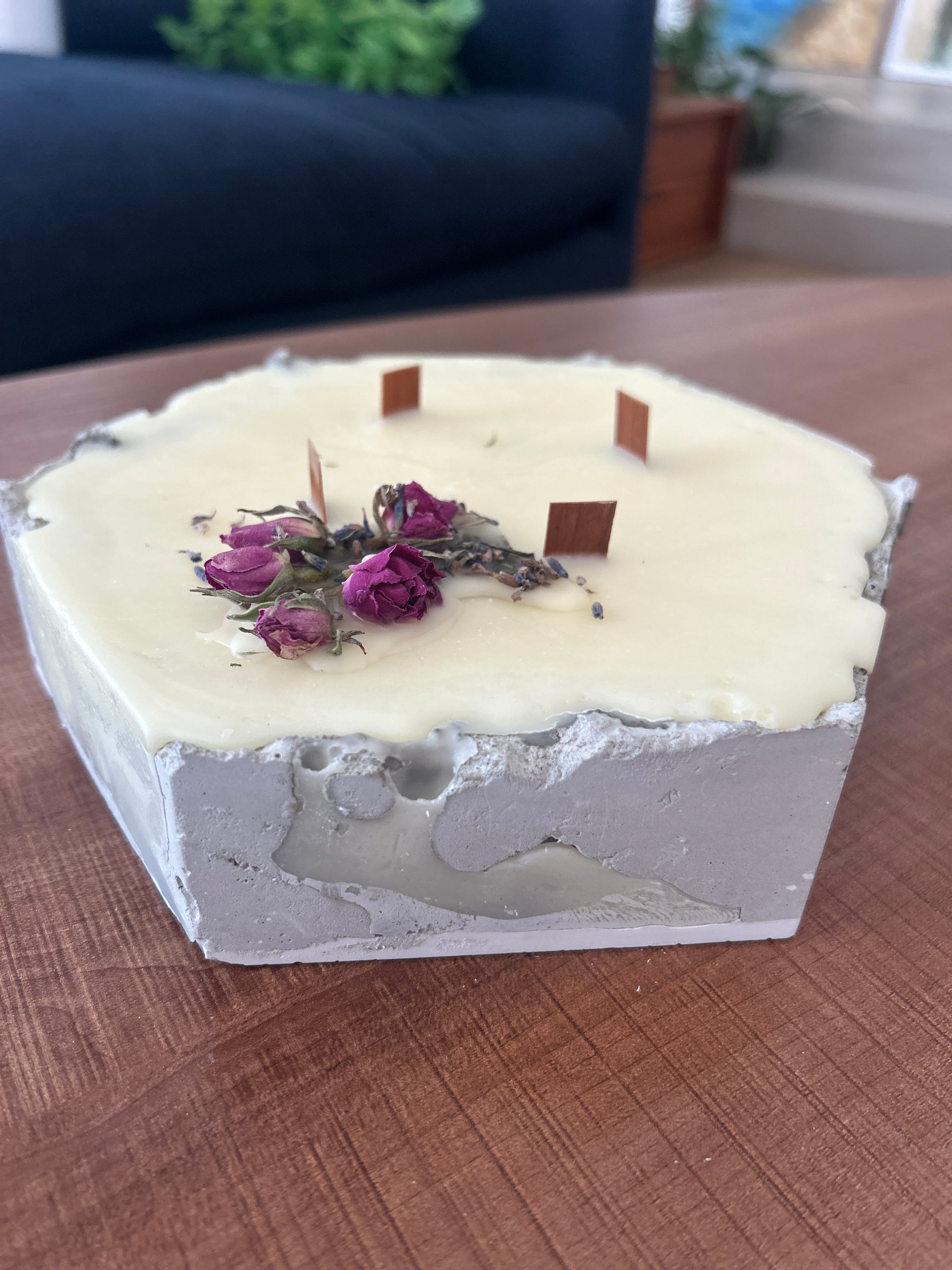This hexagon-shaped candle combines a modern concrete blend with natural dried roses, creating a refined decorative piece. Filled with clean-burning soy wax, it offers a soothing, gentle light ideal for cultivating a calm, nature-inspired atmosphere. Measuring 7"x8"x2", its sturdy design ensures lasting use while enhancing your space with understated elegance. Note: shipping is not included.