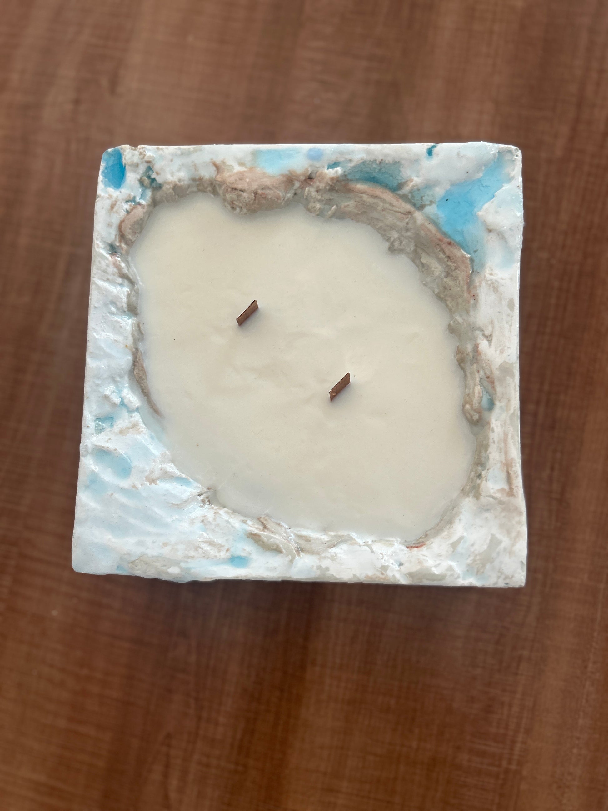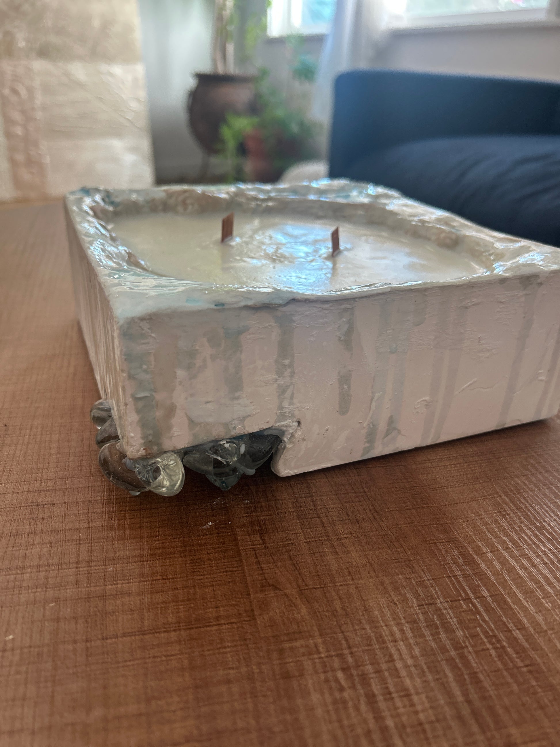 Candle River Inspiration blends concrete, epoxy, and textured glass into a modern, durable design. Filled with soy wax, it delivers a soothing light and gentle aroma. At 8"x8"x3", this candle enhances tranquil spaces with its natural, elegant presence, perfect for creating a peaceful, nature-inspired atmosphere.