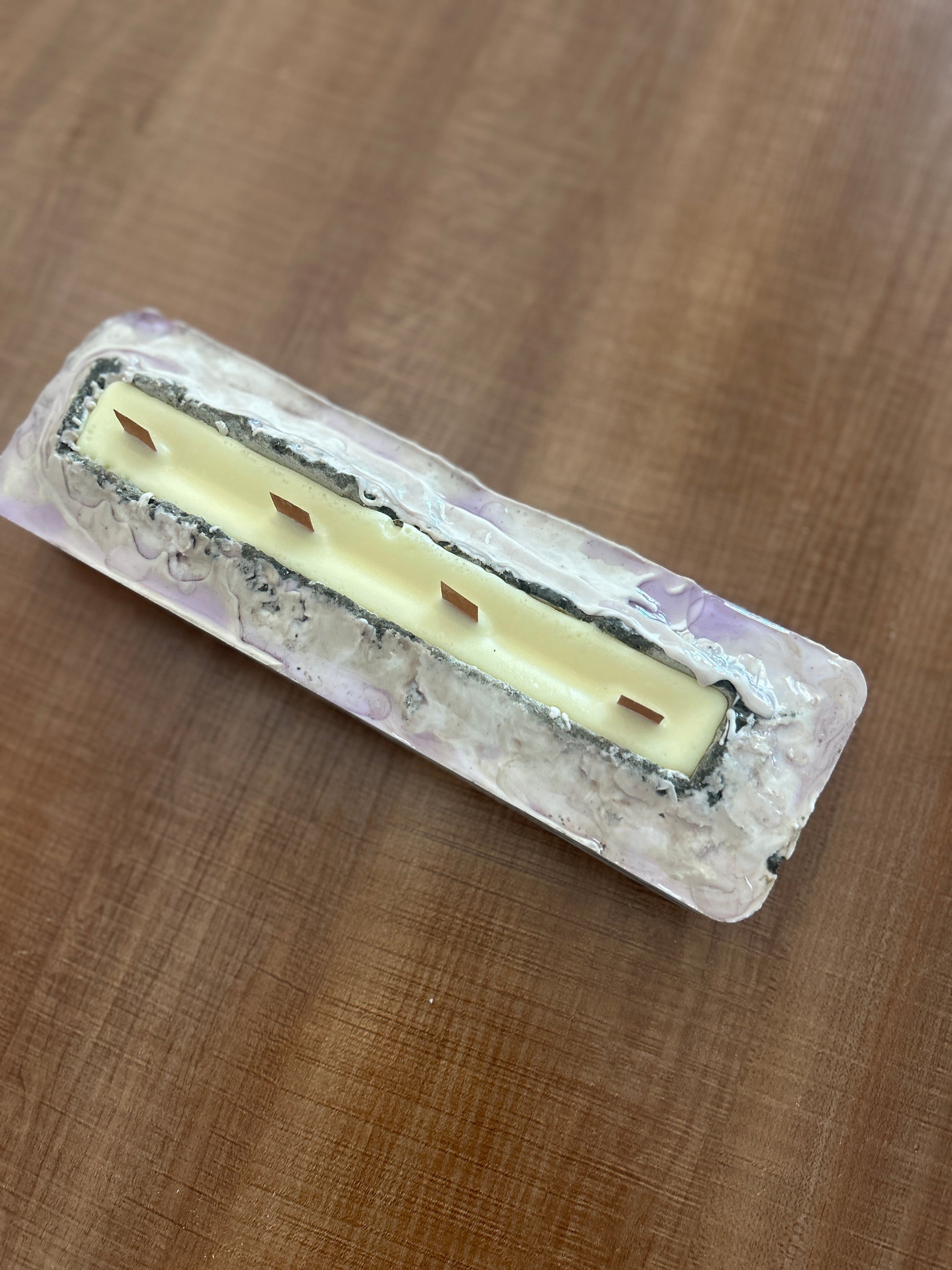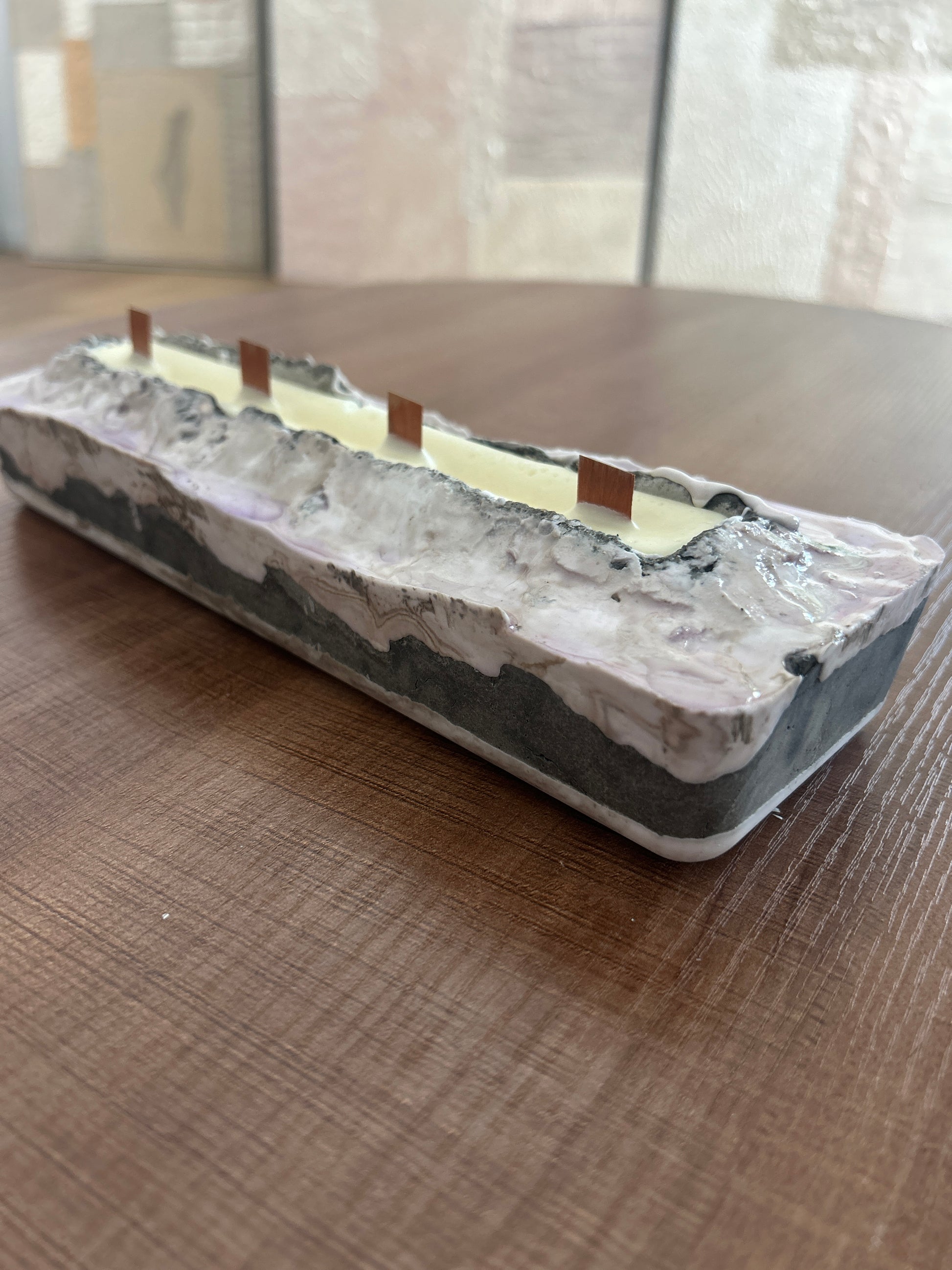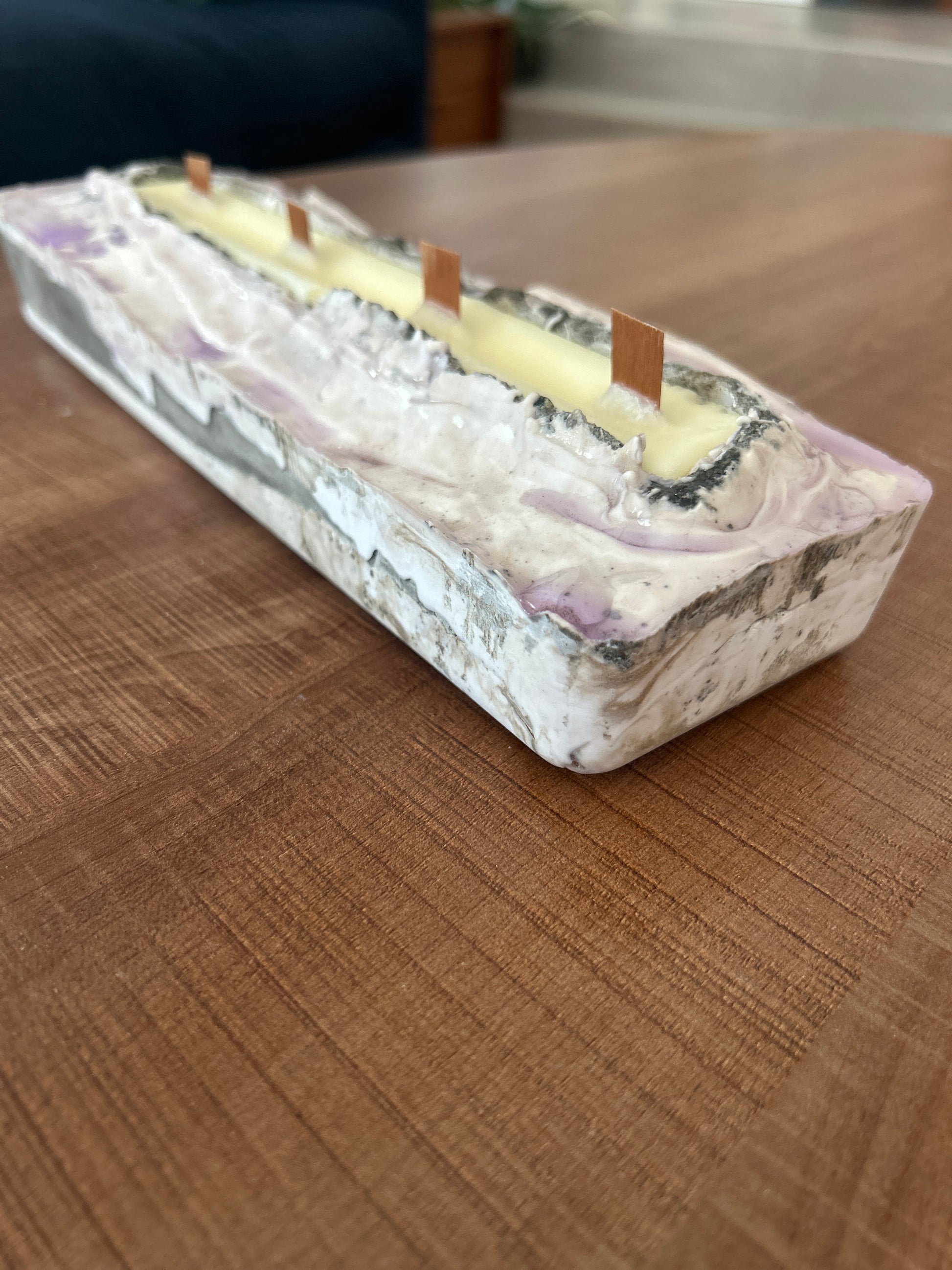 Elevate your home decor with this elegant soy candle tray, featuring a distinctive purple river design crafted from concrete and epoxy. Handmade with care, its unique blend of materials creates a striking, durable piece that beautifully complements any setting. Perfect for showcasing candles while adding a sophisticated touch, this tray also makes a thoughtful, one-of-a-kind gift. size: 10"x3"x2". Note: do not included shipping.