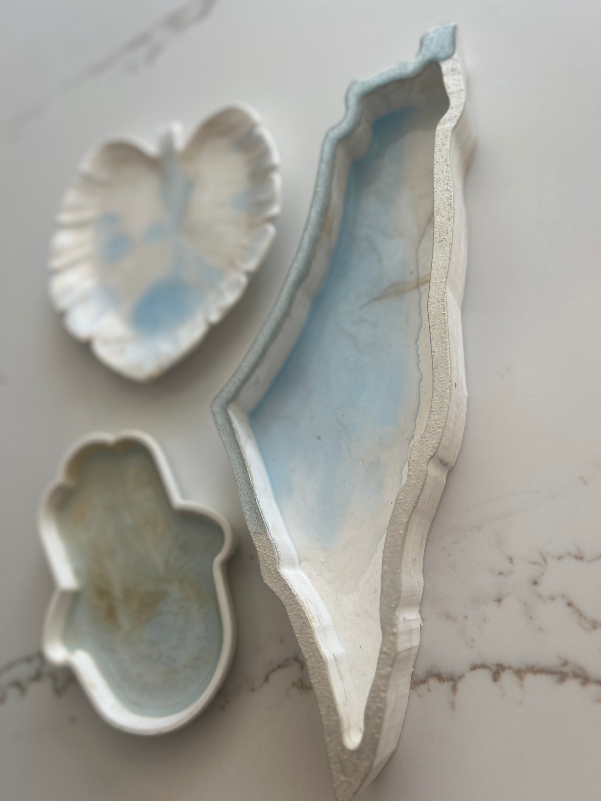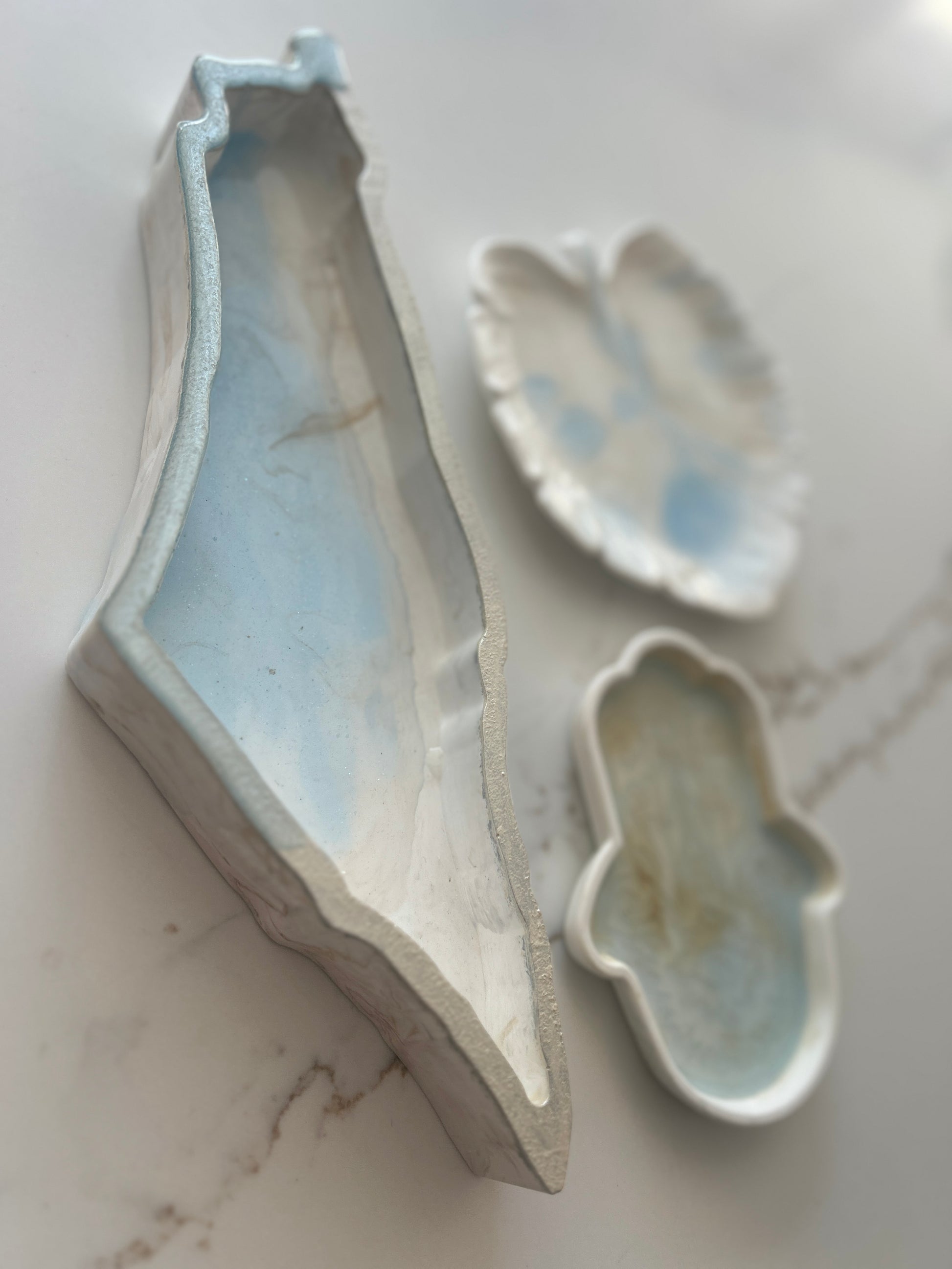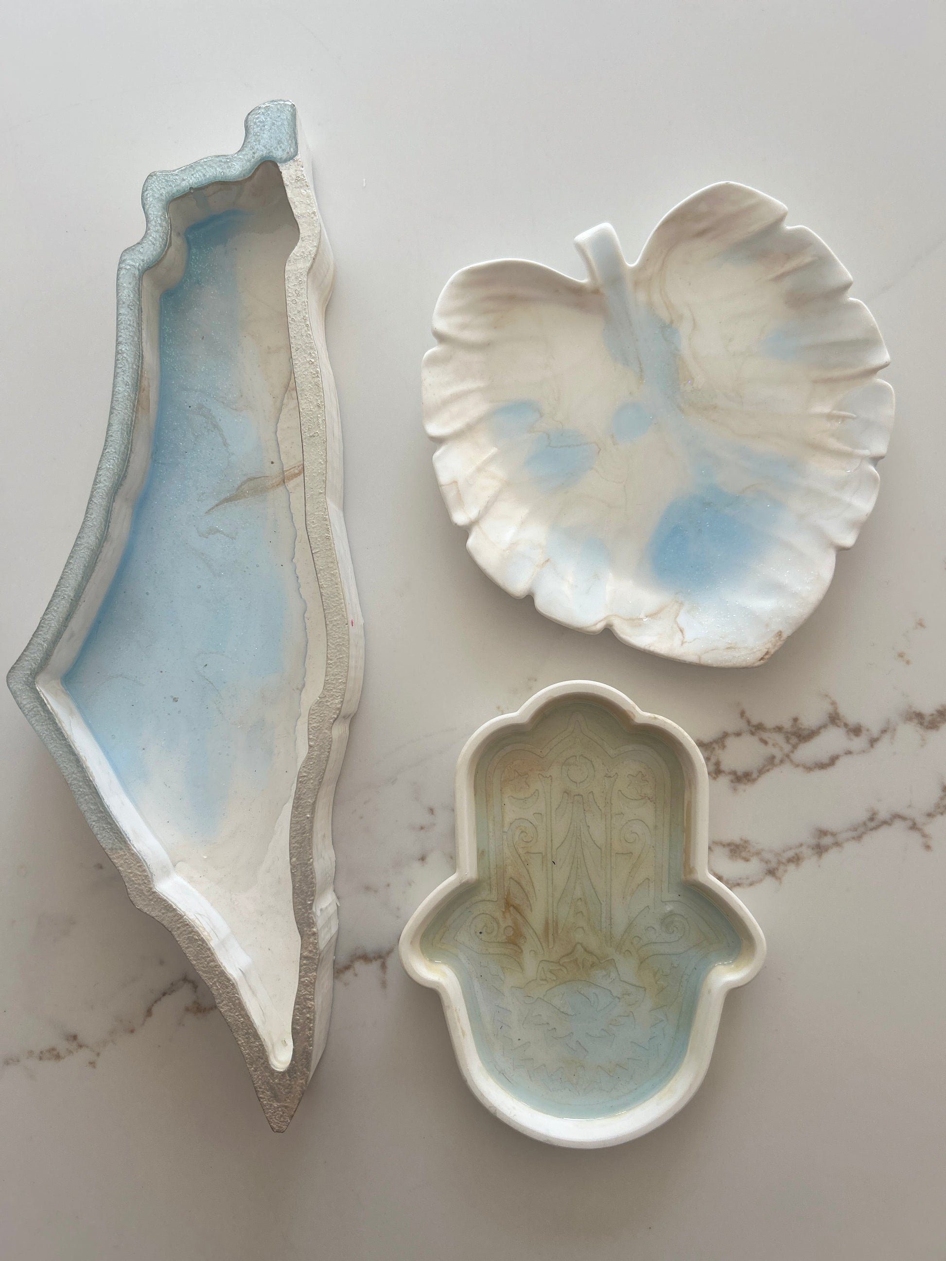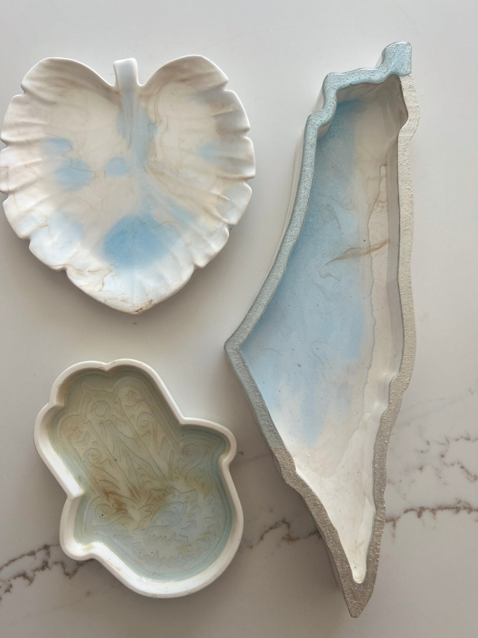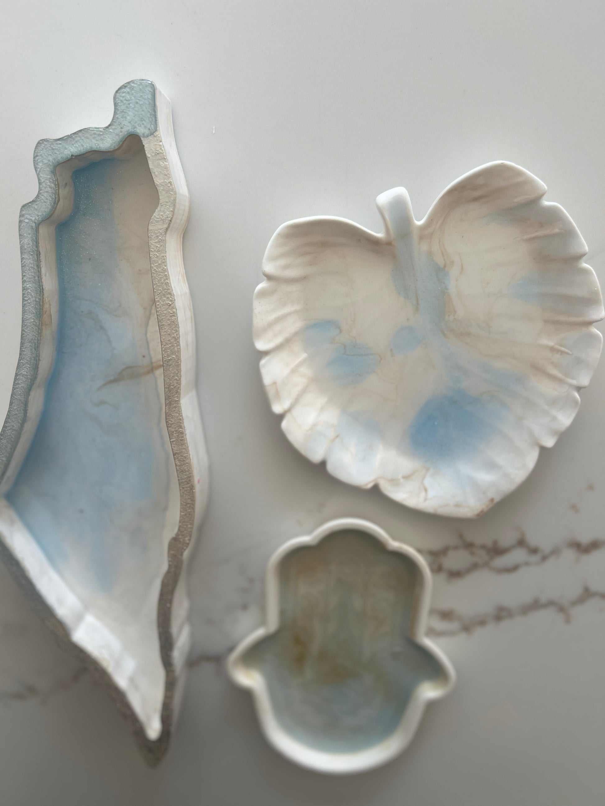 This elegant set, featuring designs inspired by the Map of Israel tray, Hamsa, and a leaf, is perfect for organizing jewelry, cosmetics, or simply enhancing your decor. Crafted from polymer and raisin, it boasts a refined white and blue water finish, (can order with your choice of custom color, options available at no extra charge). Beyond its sophisticated appeal, the set offers a calming presence. The dimensions are approximately: tray 12" x 4" x 1", Hamsa 6" x 4", Leaf 6" x 6". An exceptional gift for those who appreciate art and a connection to Israel, with shipping included.