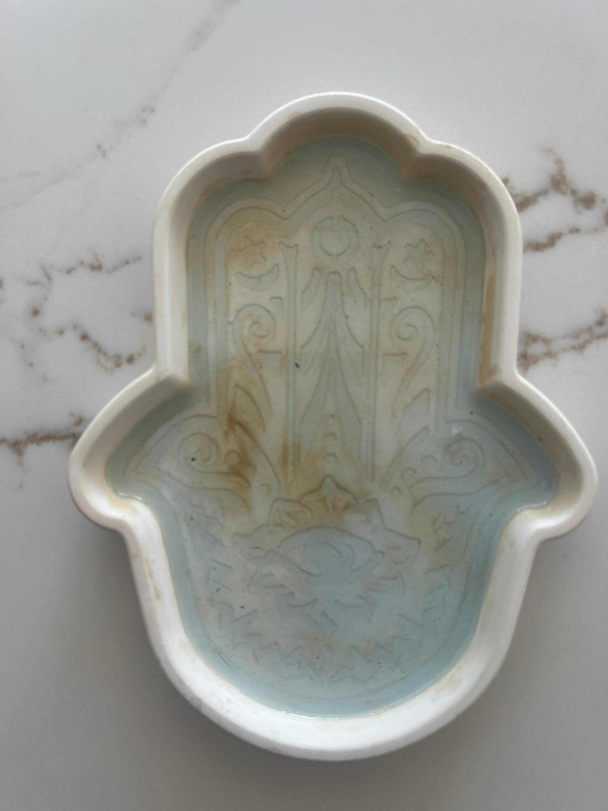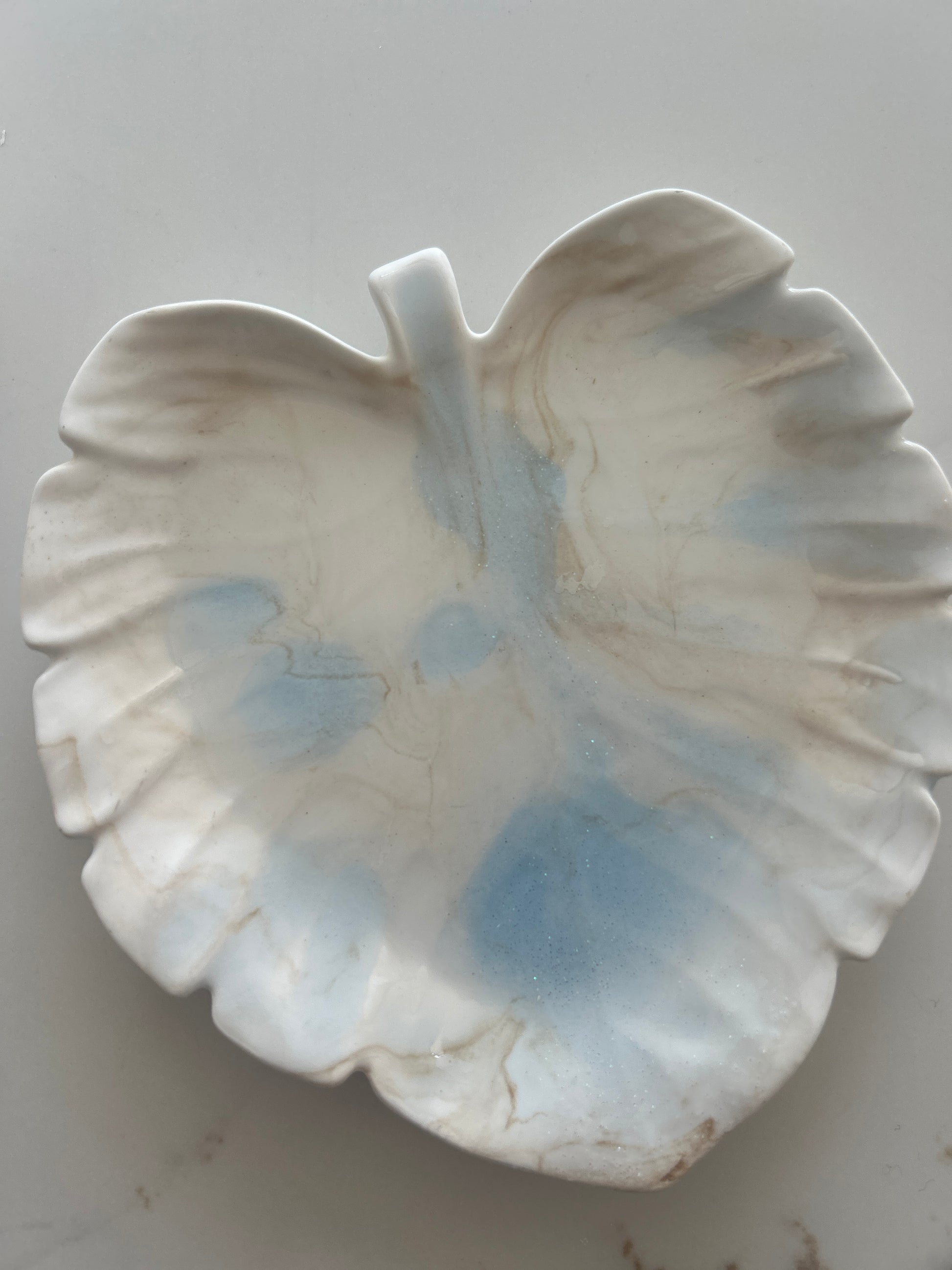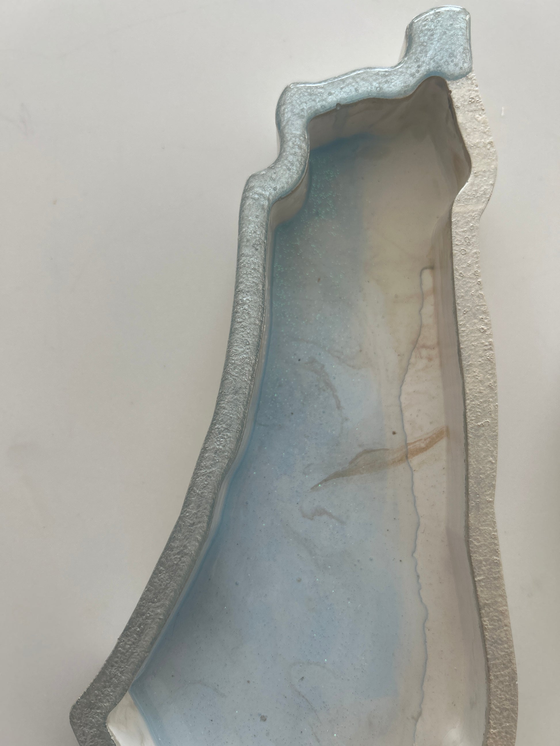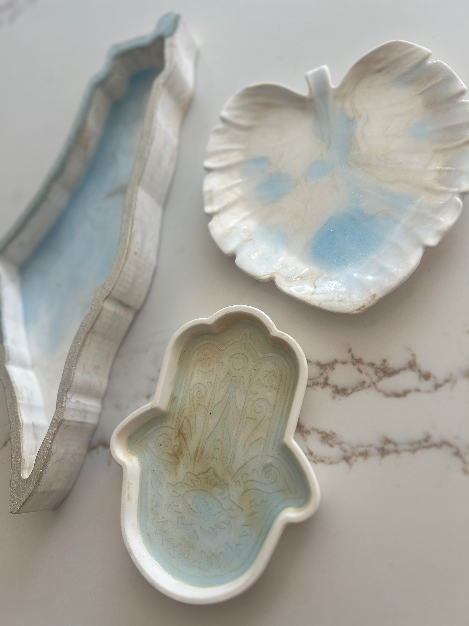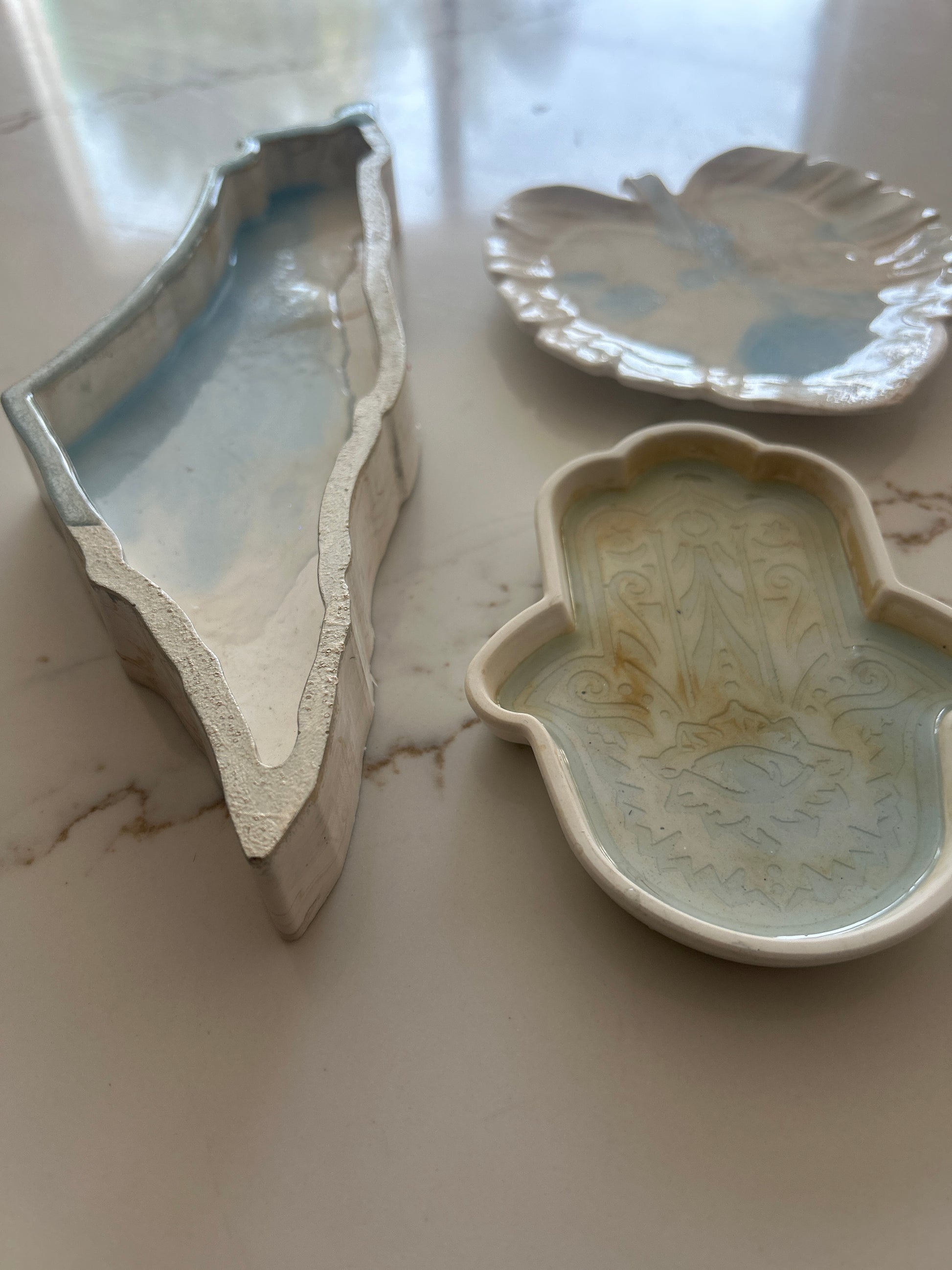 This elegant set, featuring designs inspired by the Map of Israel tray, Hamsa, and a leaf, is perfect for organizing jewelry, cosmetics, or simply enhancing your decor. Crafted from polymer and raisin, it boasts a refined white and blue water finish, (can order with your choice of custom color, options available at no extra charge). Beyond its sophisticated appeal, the set offers a calming presence. The dimensions are approximately: tray 12" x 4" x 1", Hamsa 6" x 4", Leaf 6" x 6". An exceptional gift for those who appreciate art and a connection to Israel, with shipping included.