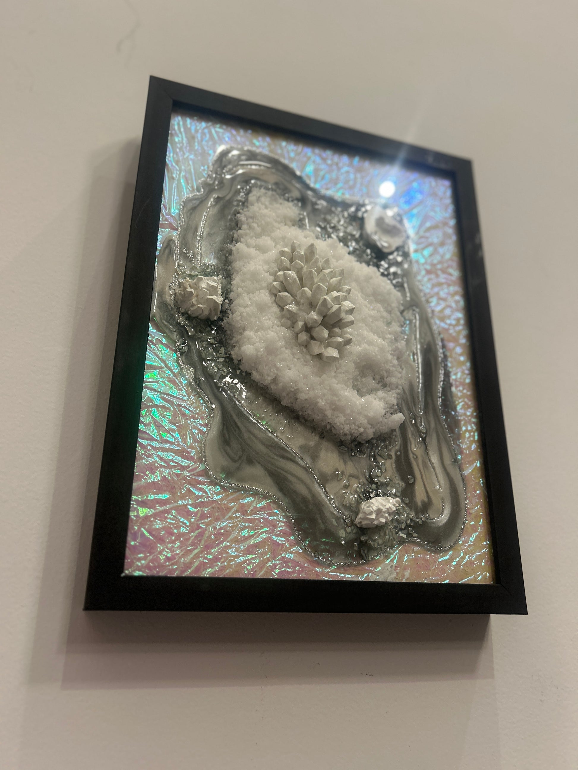 The Geode Gray River Inspiration Handmade Artwork combines glass and epoxy layered over a vibrant background. Creating a captivating piece that brings tranquility to any space. Measuring 12" x 16" x2" with a wood frame. This artwork offers a serene and sophisticated visual experience. Customizable in your choice of colors at no additional cost, it seamlessly adapts to your décor. A way to enhance your environment with both elegance and calm. Price is not includes shipping.