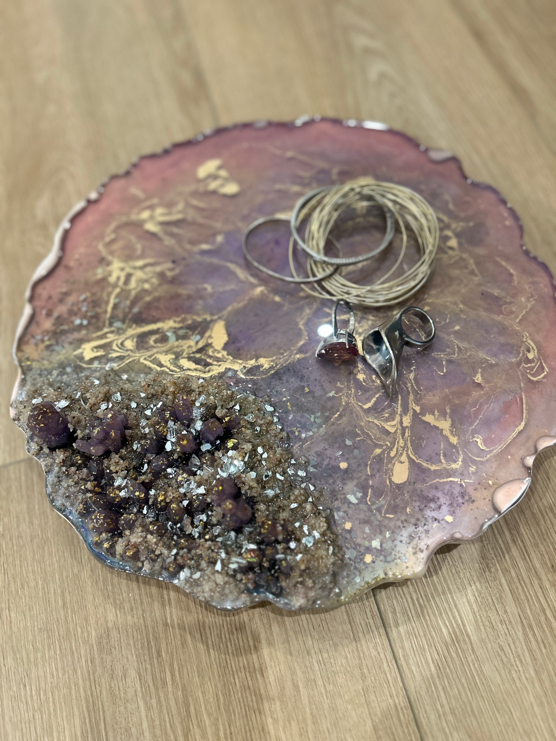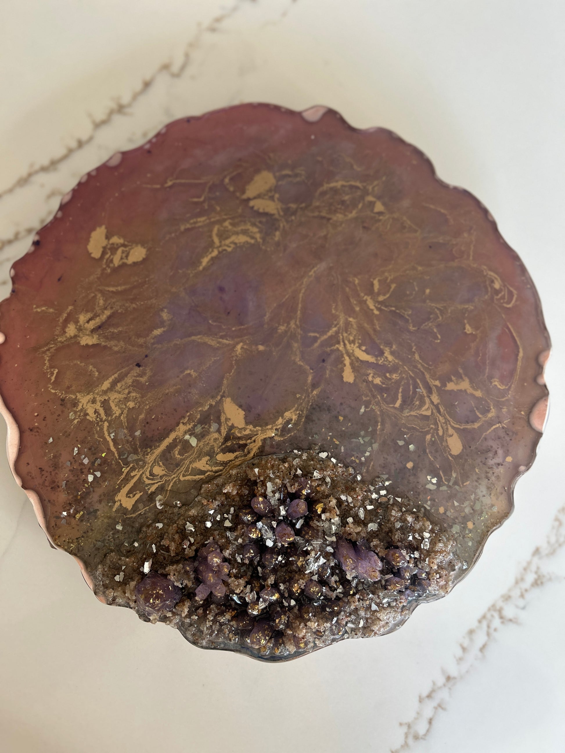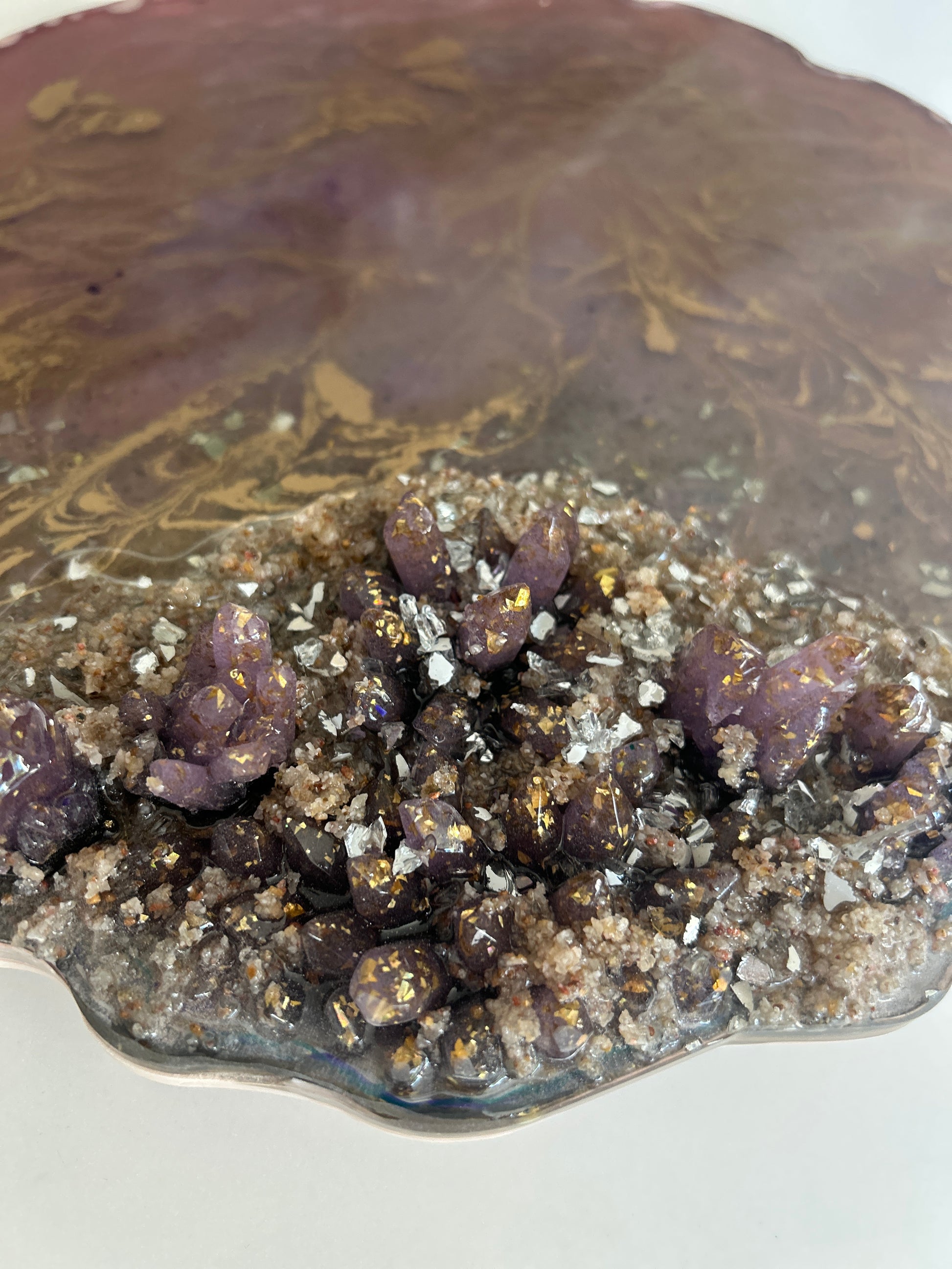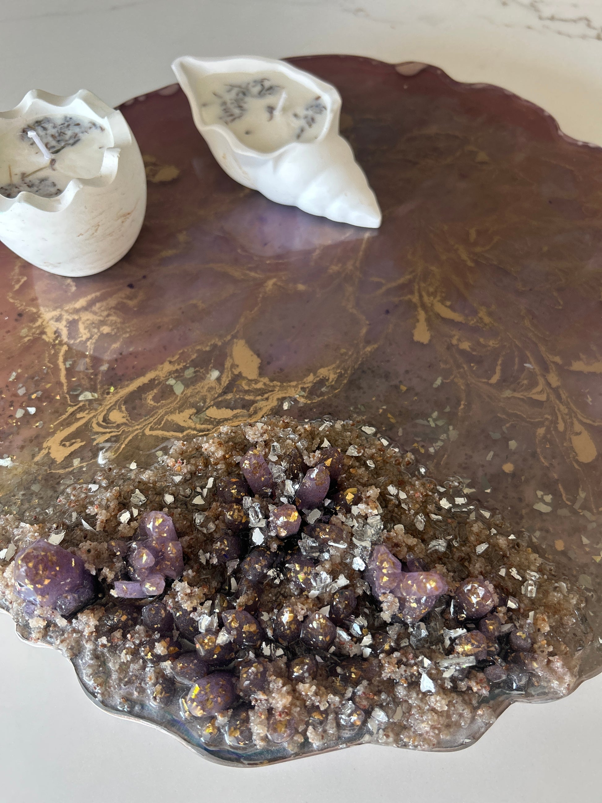 This exquisite handmade Geode Inspiration raised Tray features a striking blend of Gold and Purple epoxy, accented with crystals and glass. Its distinctive ocean waves pattern and geode design create a captivating centerpiece for your home. Perfect for candle lighting, or organizing jewelry and cosmetics. Measuring 13". Shipping costs are included in the price. Accessories in the photo are not included.