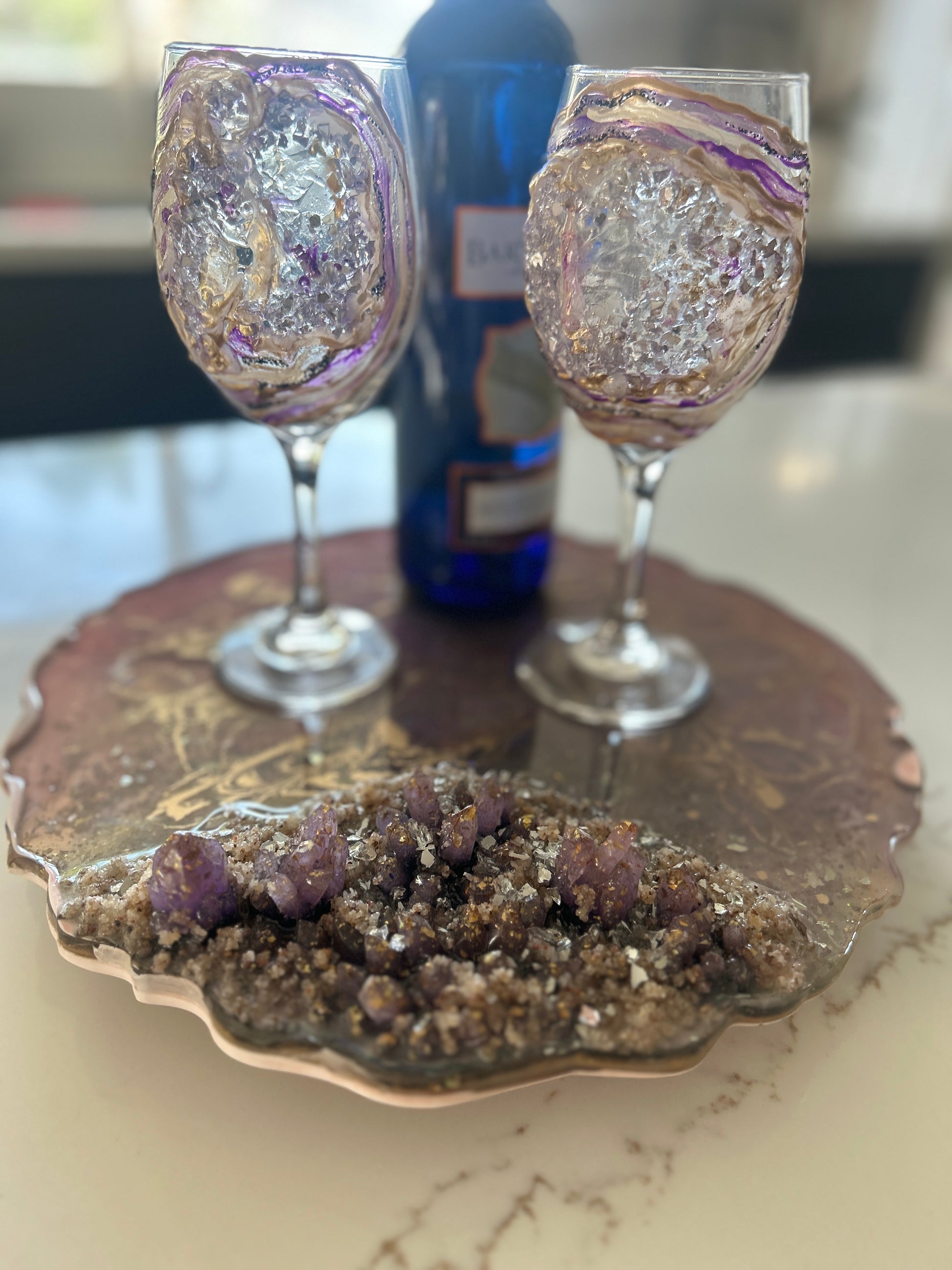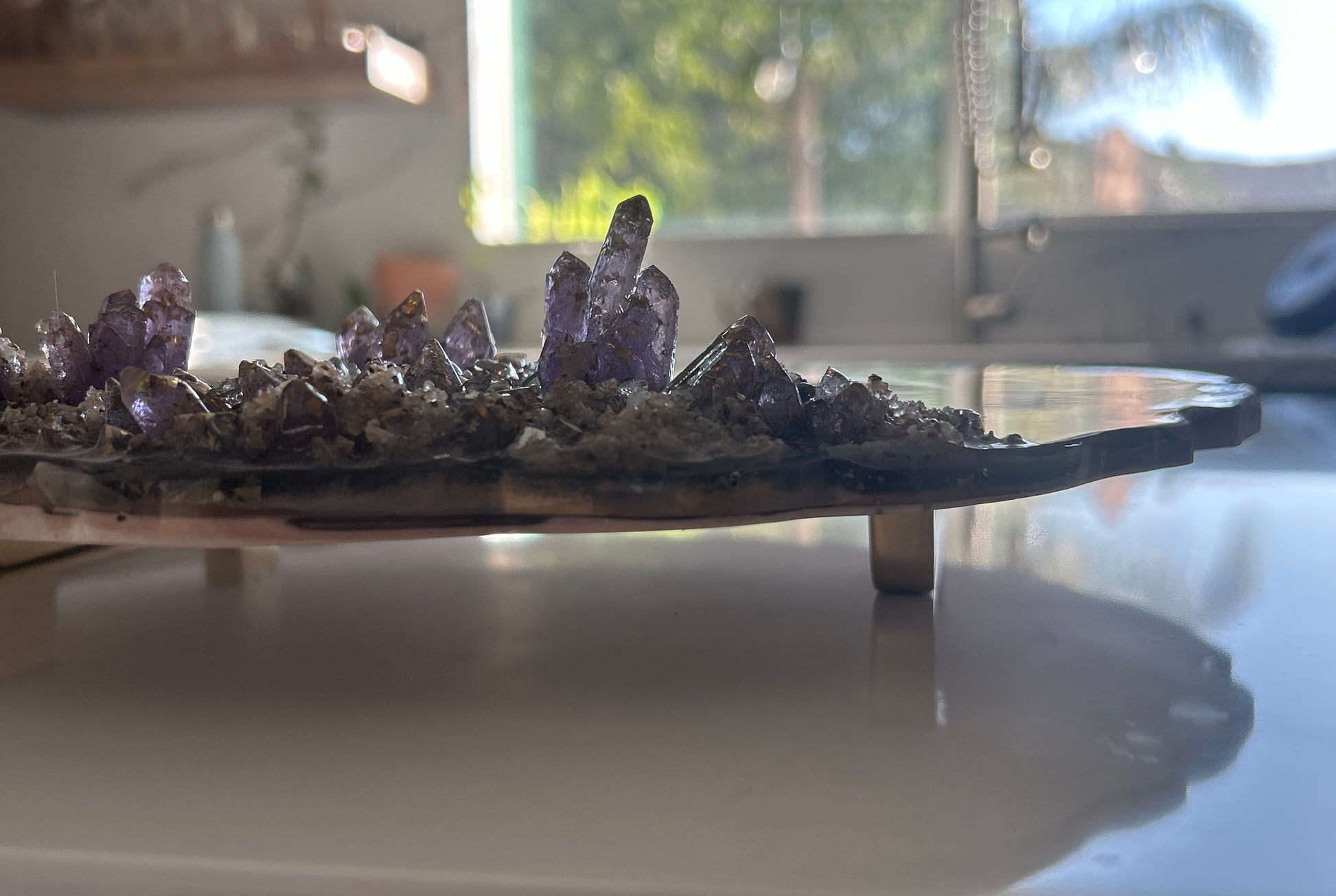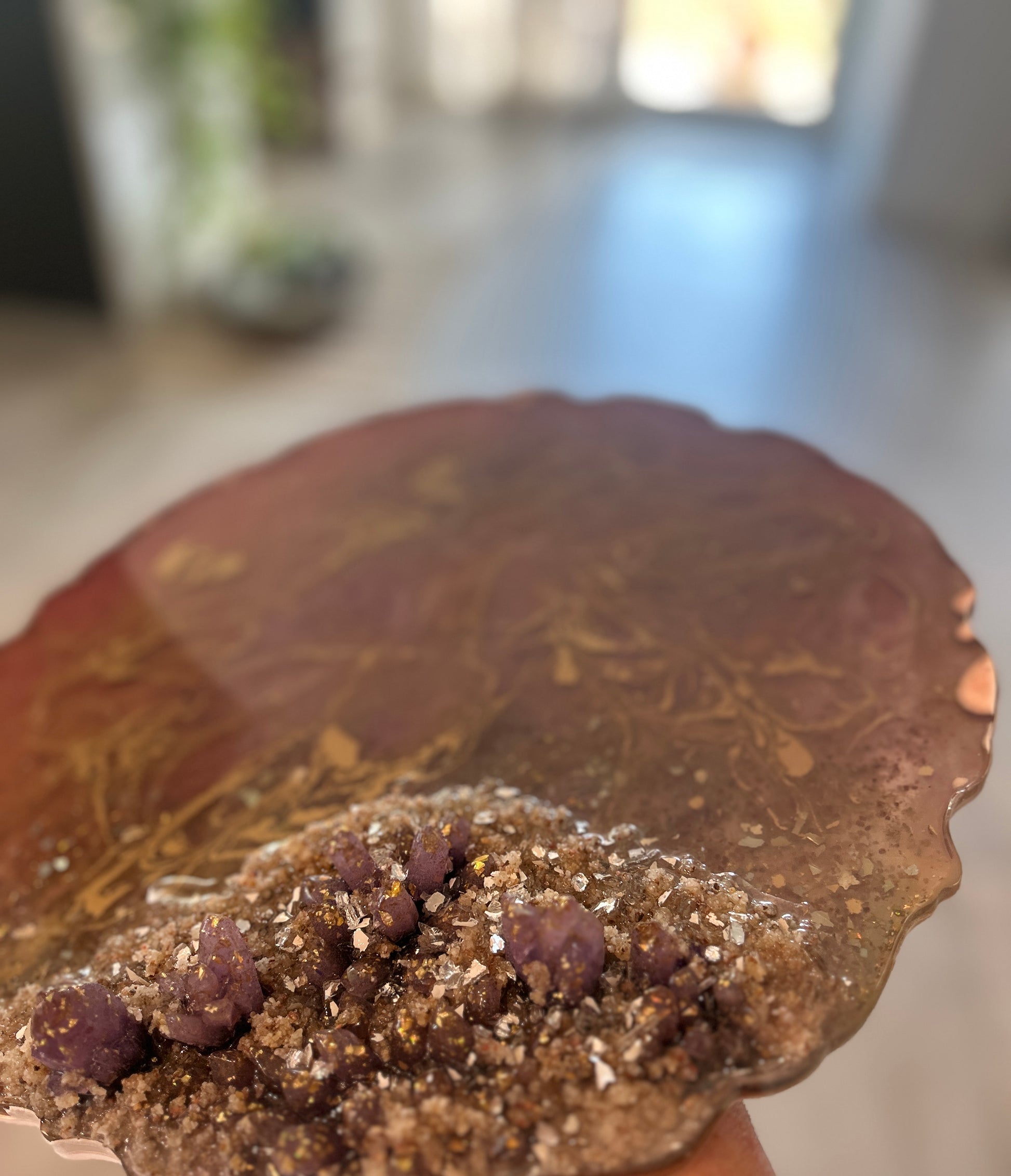 This exquisite handmade Geode Inspiration raised Tray features a striking blend of Gold and Purple epoxy, accented with crystals and glass. Its distinctive ocean waves pattern and geode design create a captivating centerpiece for your home. Perfect for candle lighting, or organizing jewelry and cosmetics. Measuring 13". Shipping costs are included in the price. Accessories in the photo are not included.