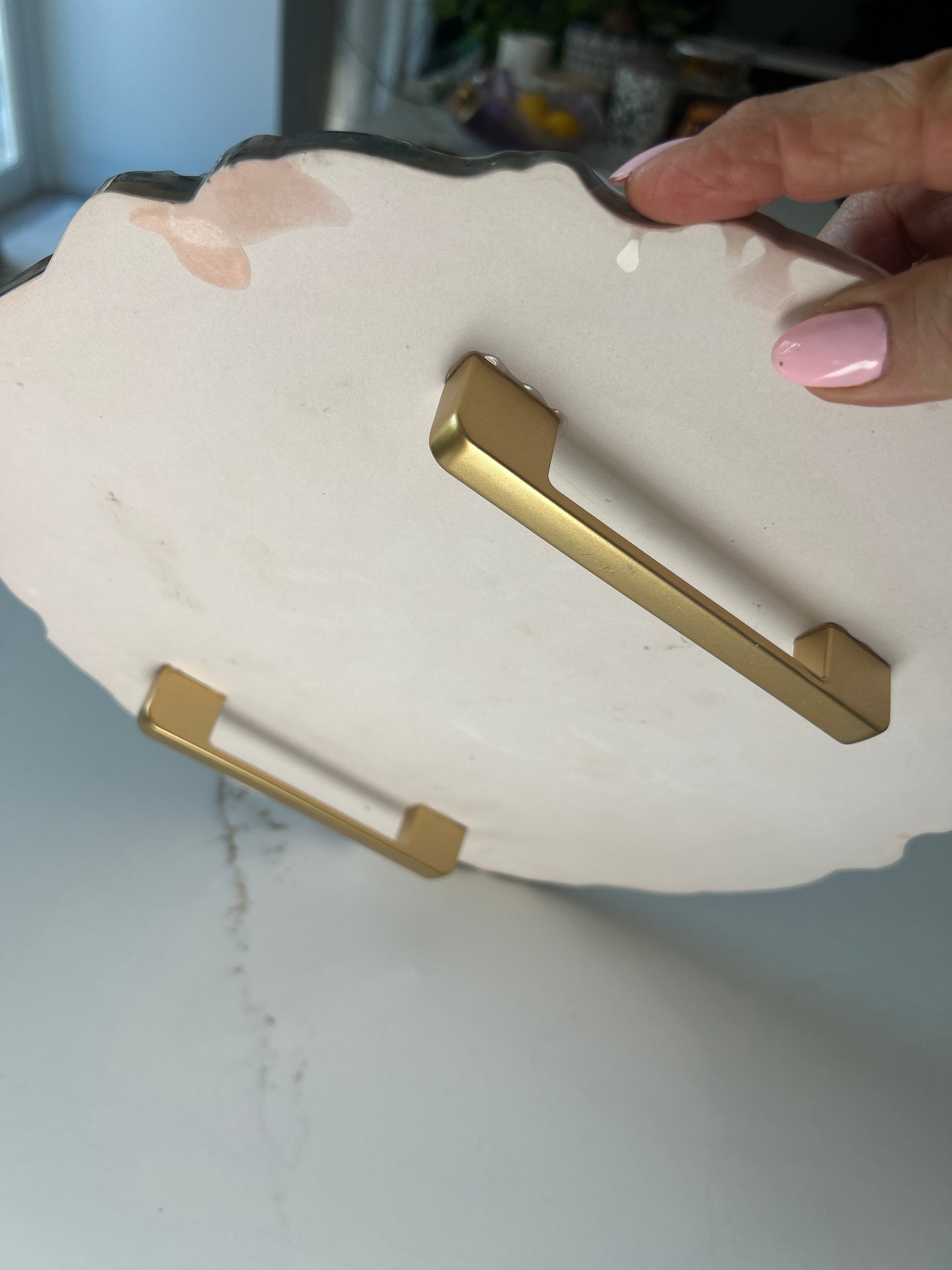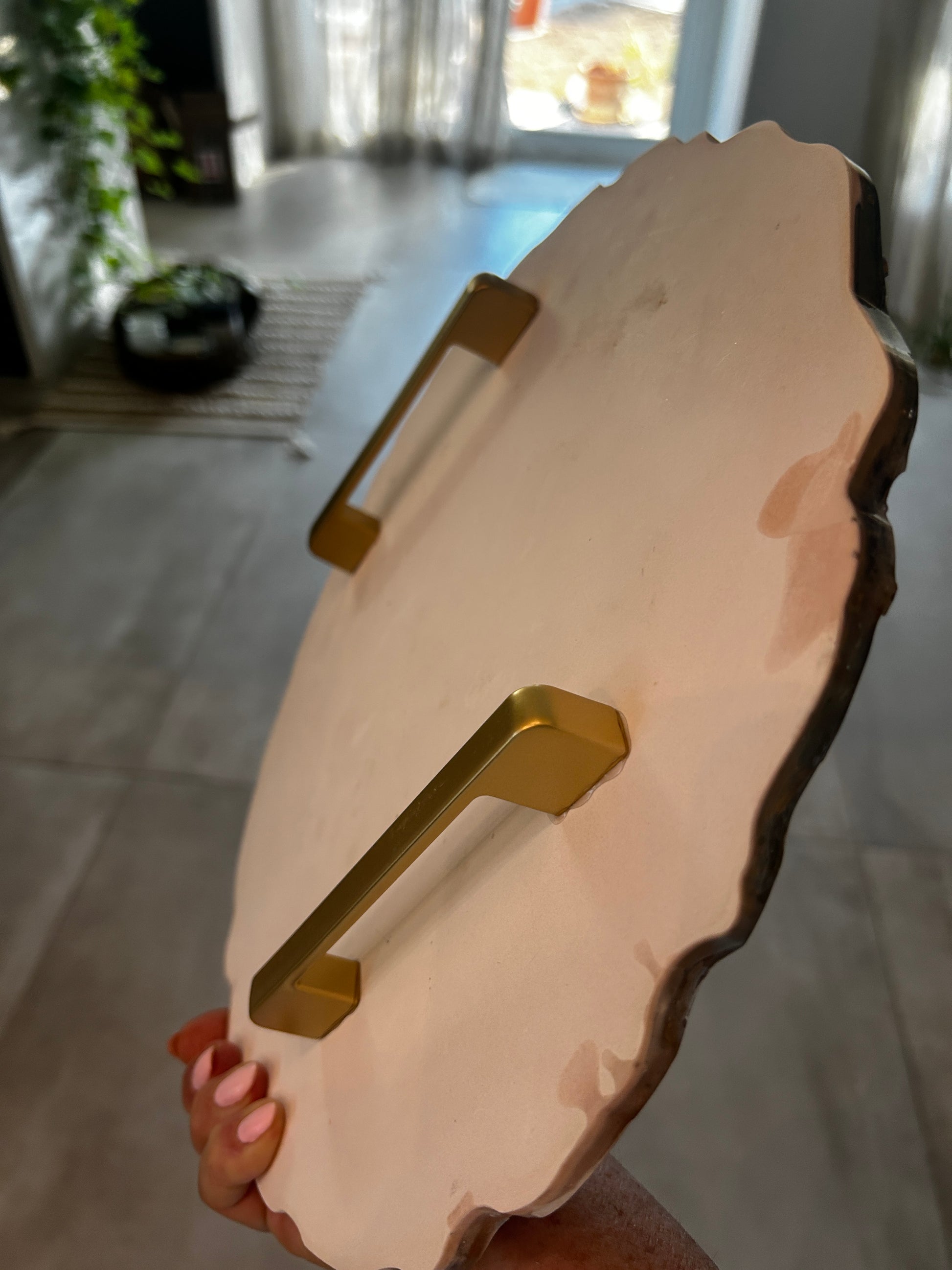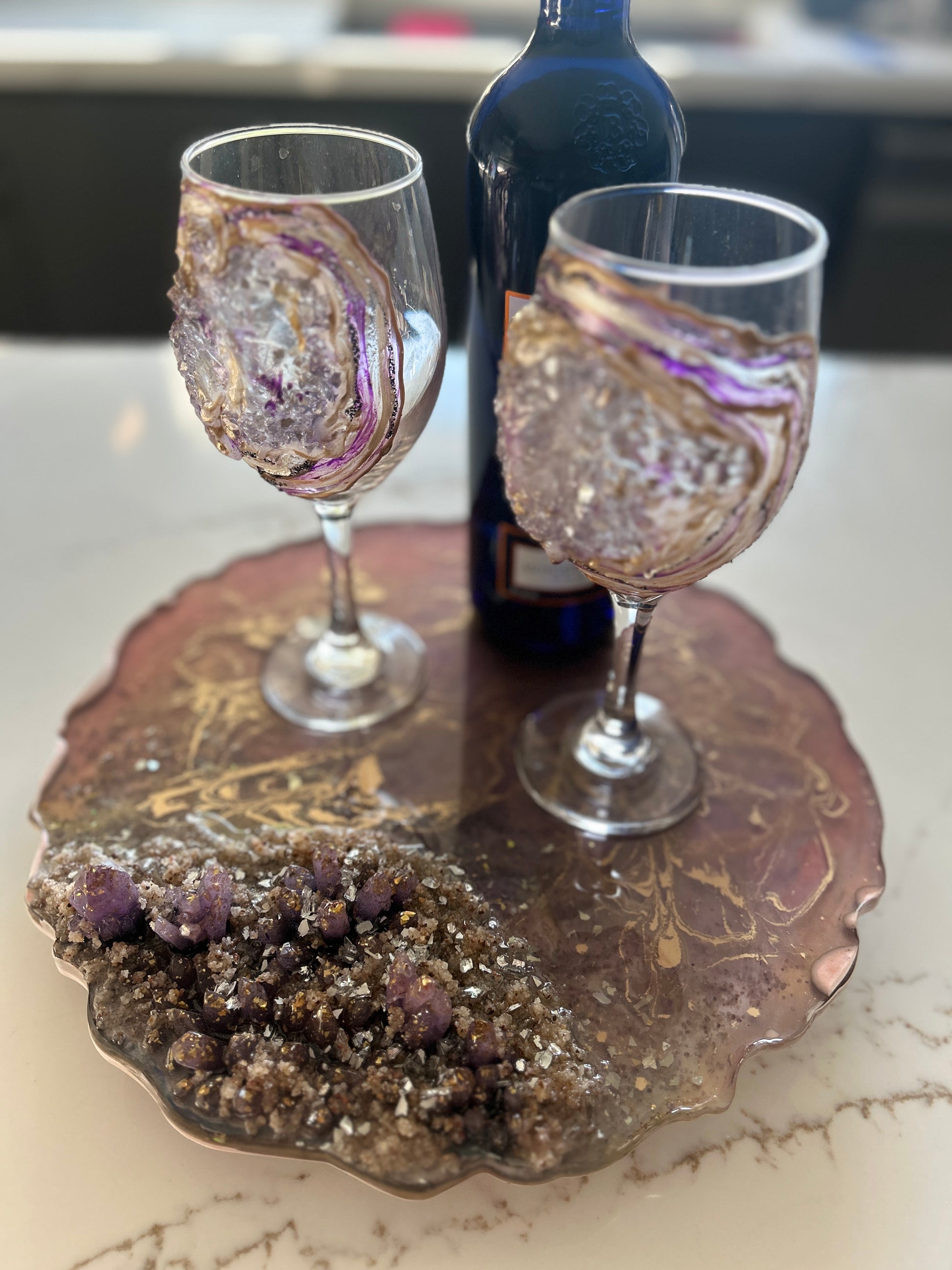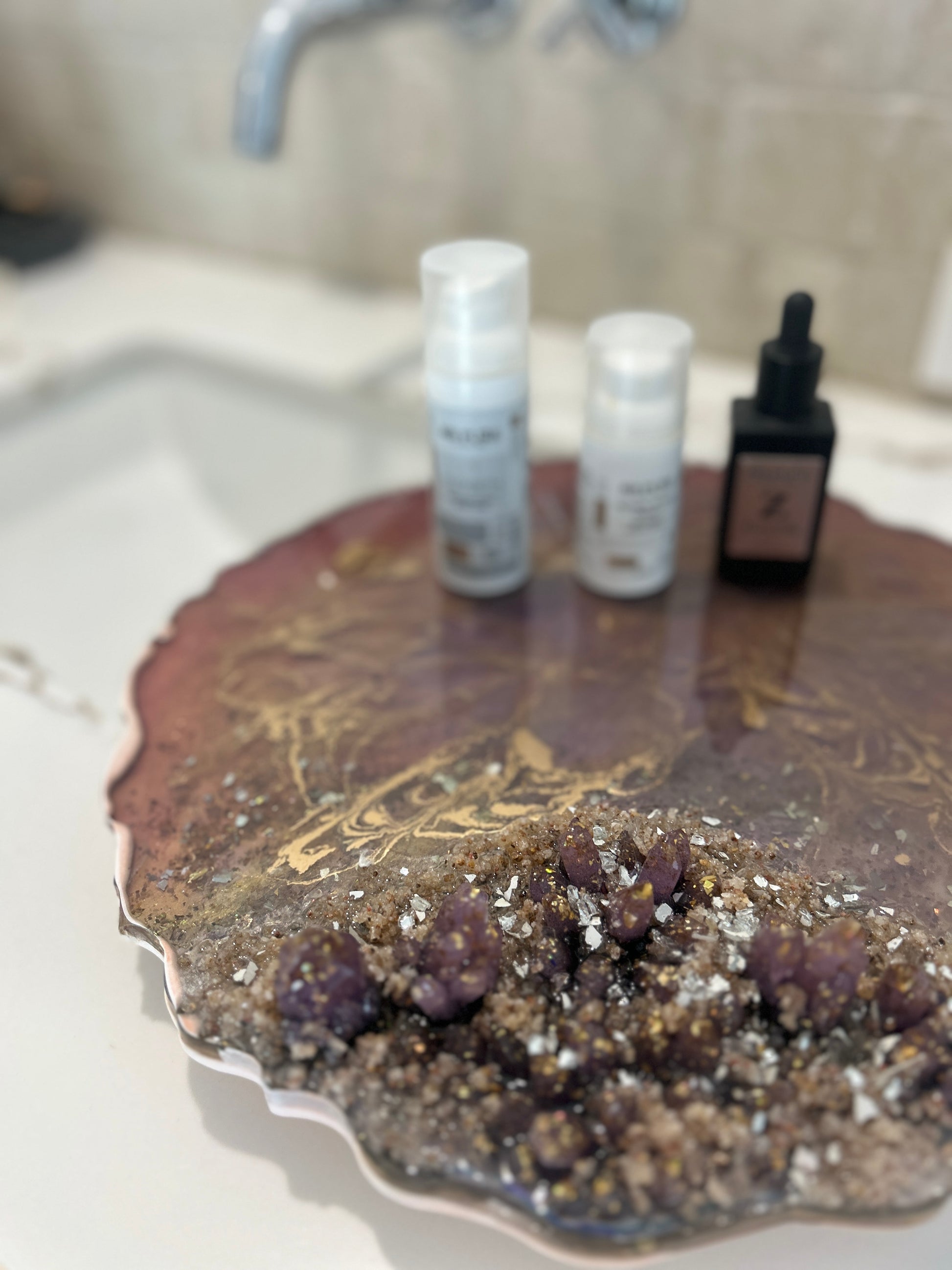 This exquisite handmade Geode Inspiration raised Tray features a striking blend of Gold and Purple epoxy, accented with crystals and glass. Its distinctive ocean waves pattern and geode design create a captivating centerpiece for your home. Perfect for candle lighting, or organizing jewelry and cosmetics. Measuring 13". Shipping costs are included in the price. Accessories in the photo are not included.