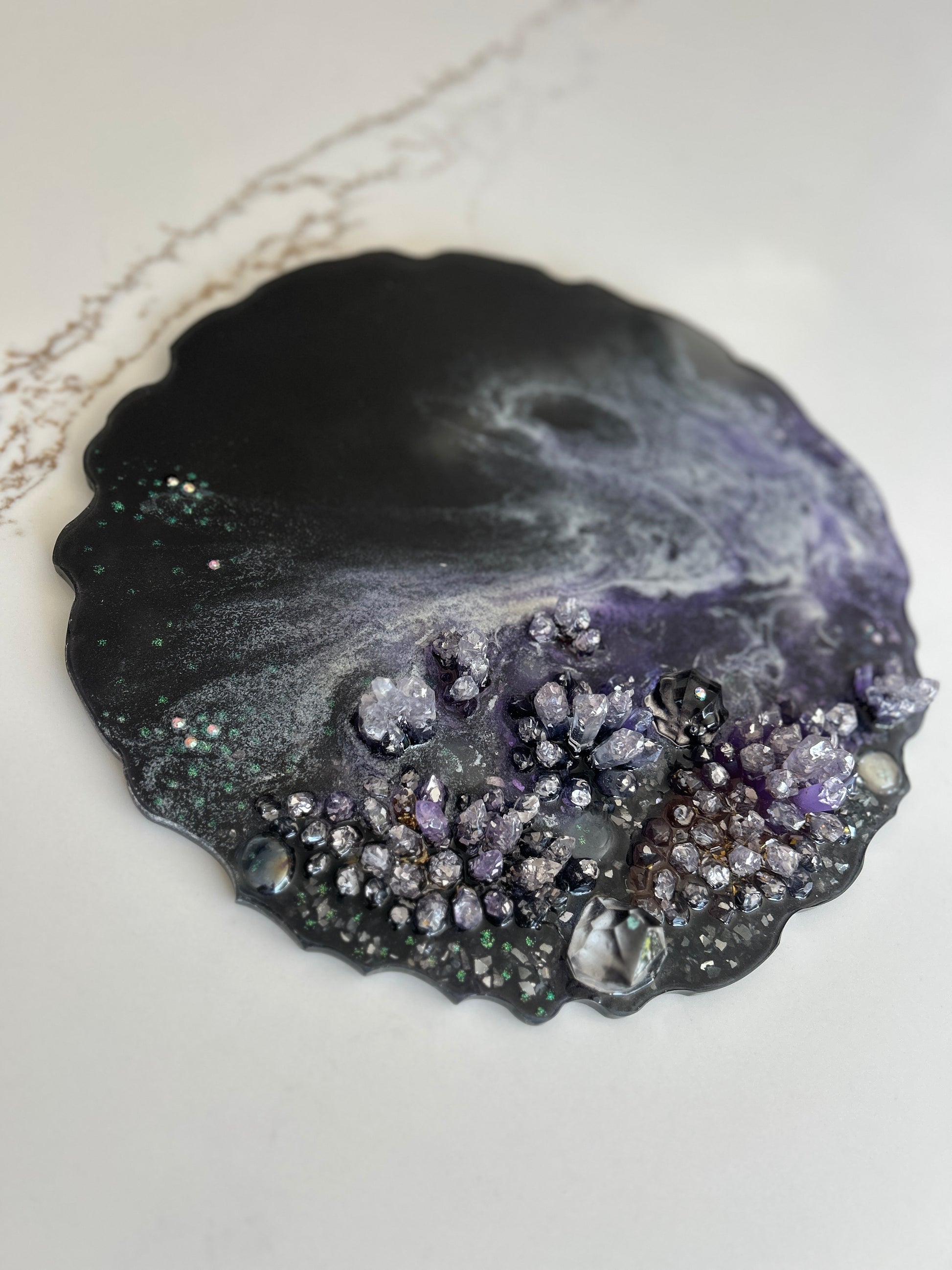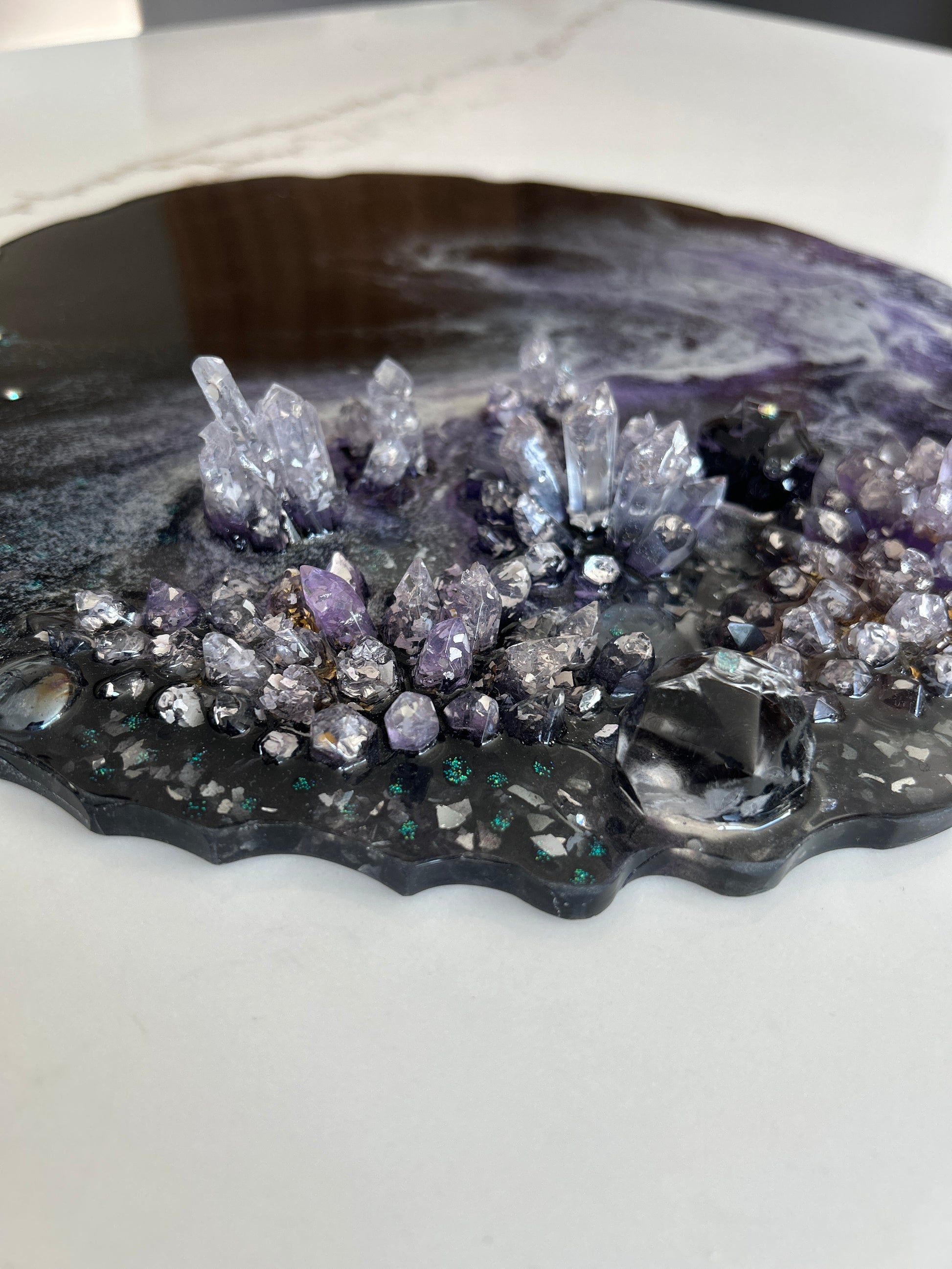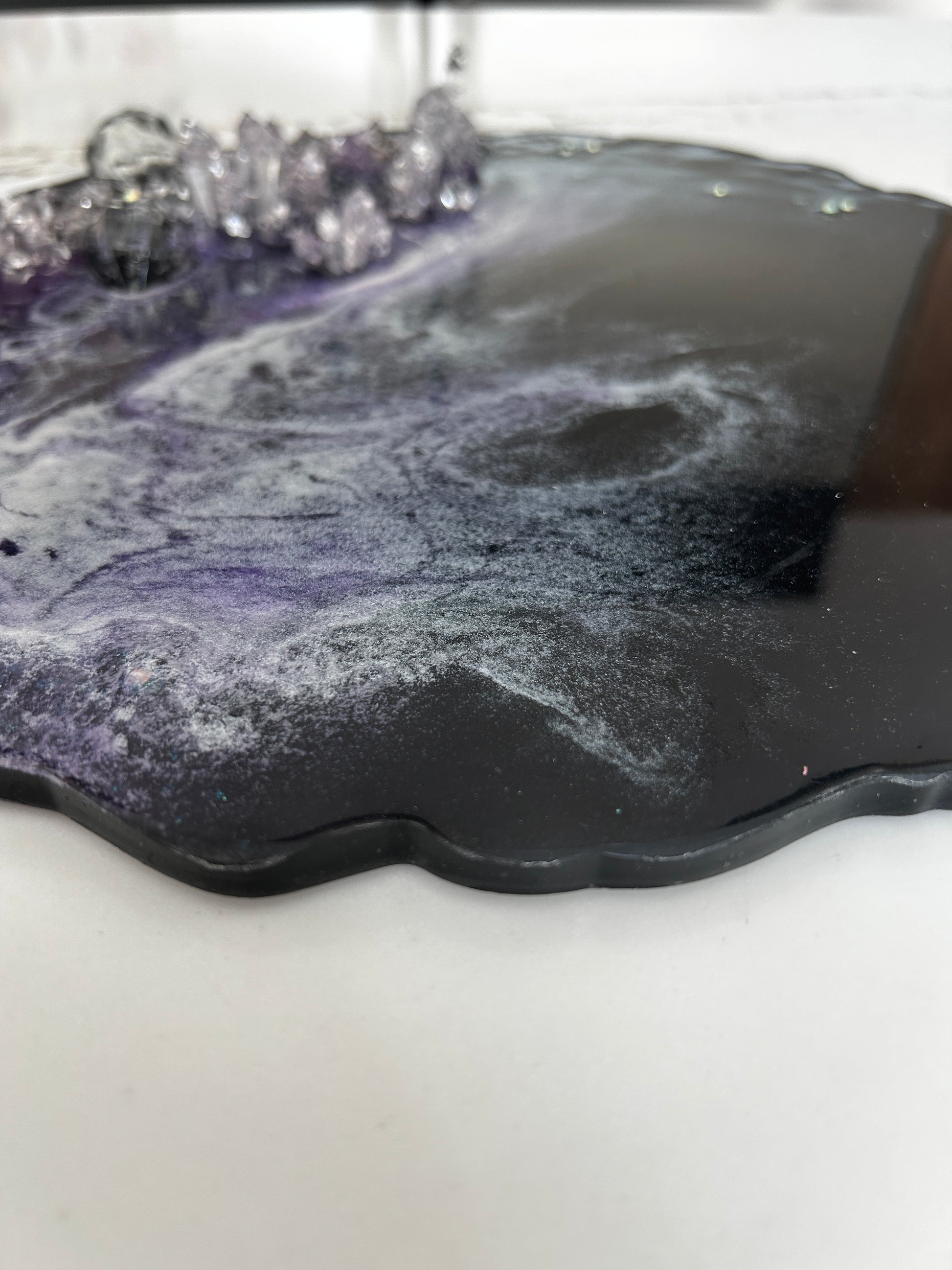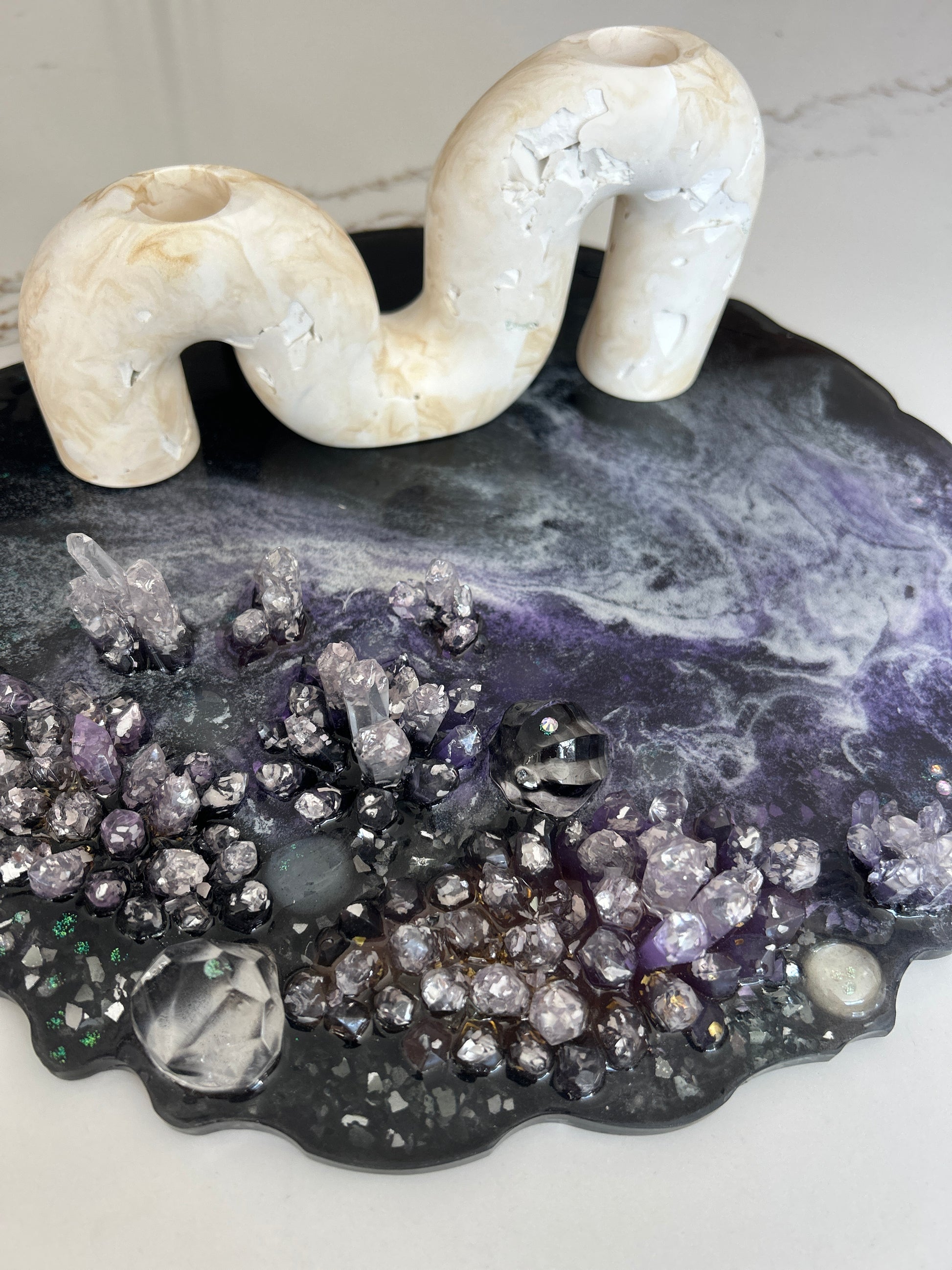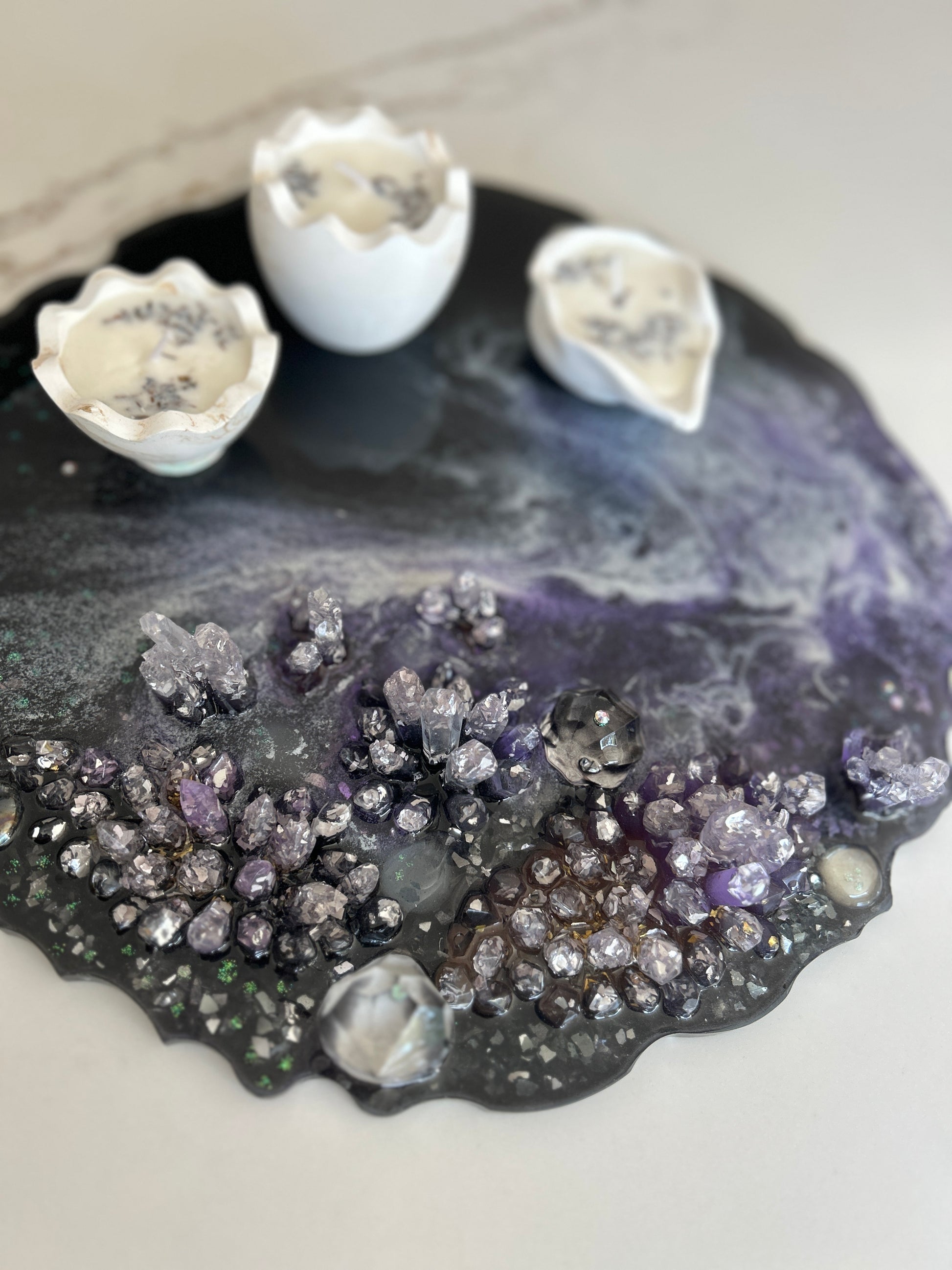 This exquisite handmade Geode Inspiration Tray features a striking blend of black and purple epoxy, accented with Swarovski crystals and glass. Its distinctive purple ocean wave pattern and geode design create a captivating centerpiece for your home. Perfect for Shabbat, candle lighting, or organizing jewelry and cosmetics. Measuring 13". Shipping costs are included in the price. Accessories in the photo are not included.