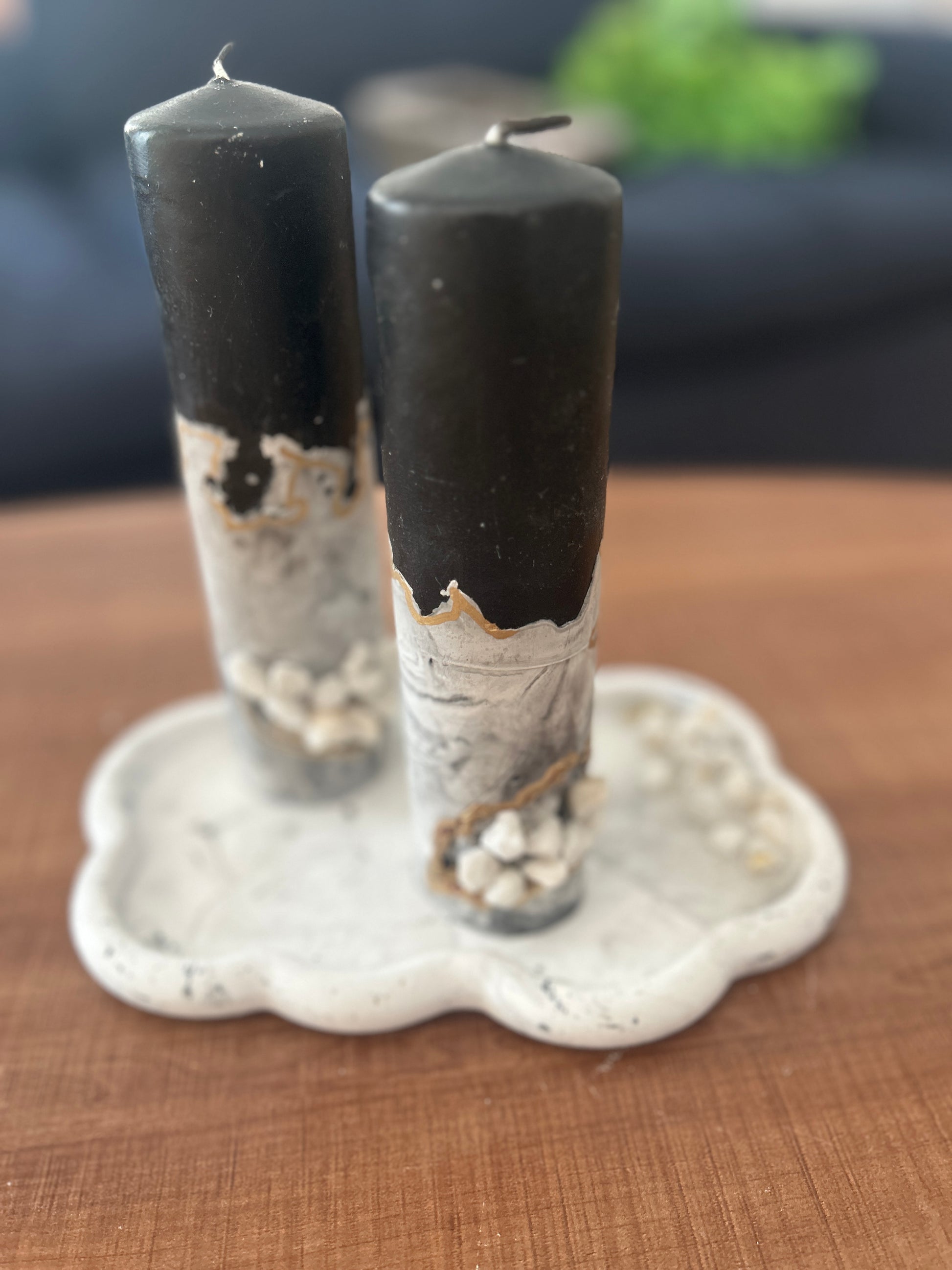 This Geode Inspiration Candle Set includes two elegant pillar candles and a coordinating tray measuring about 9"x6", accented with touches of gold and silver. Meticulously handcrafted using a marble-inspired mix of concrete, epoxy, acrylic, and natural stones, it brings refined sophistication and warmth to any environment. Each candle is roughly 7"x2" in size, making this set both a decorative centerpiece and a thoughtful gift. Note that shipping fees are excluded.