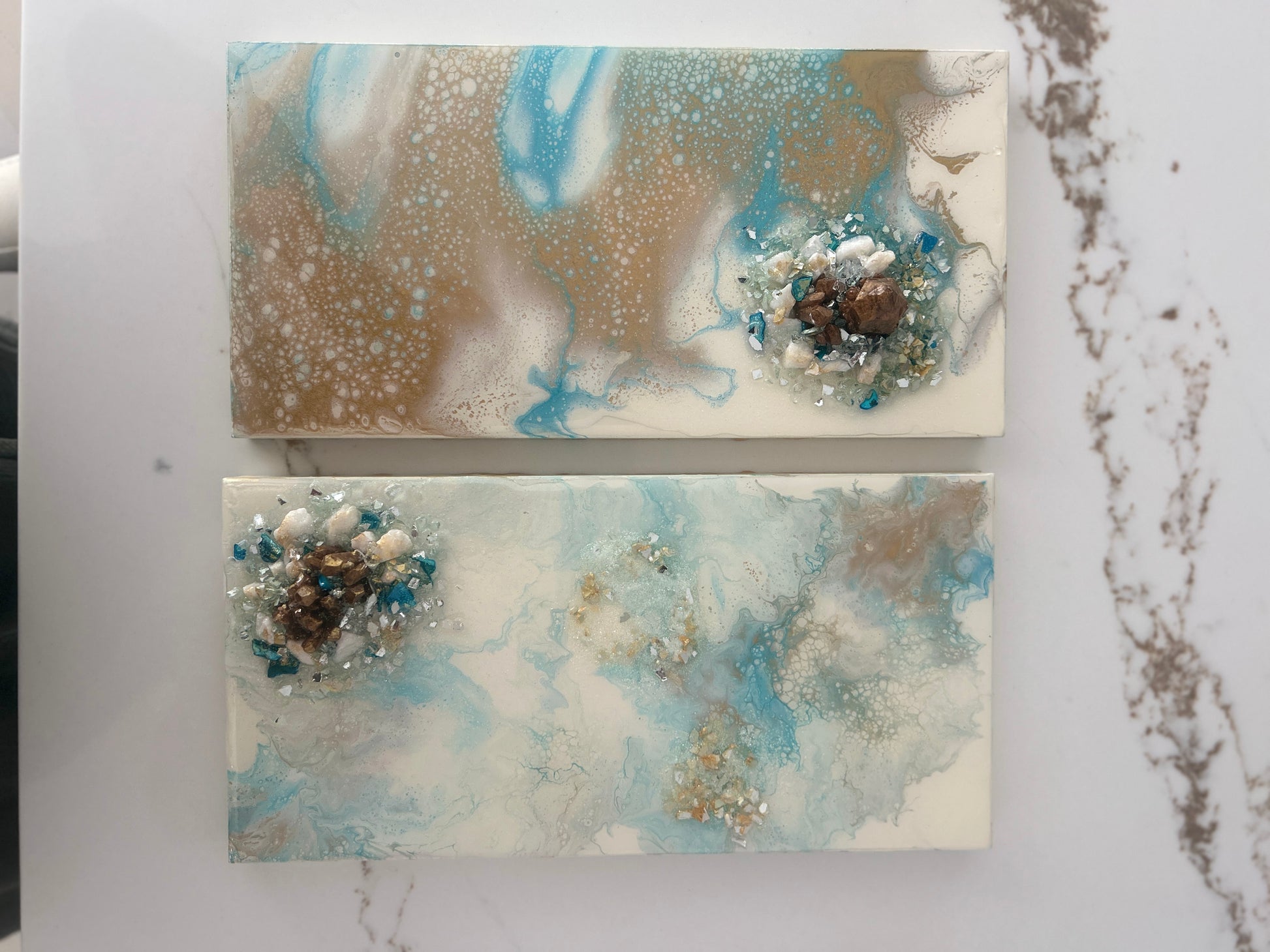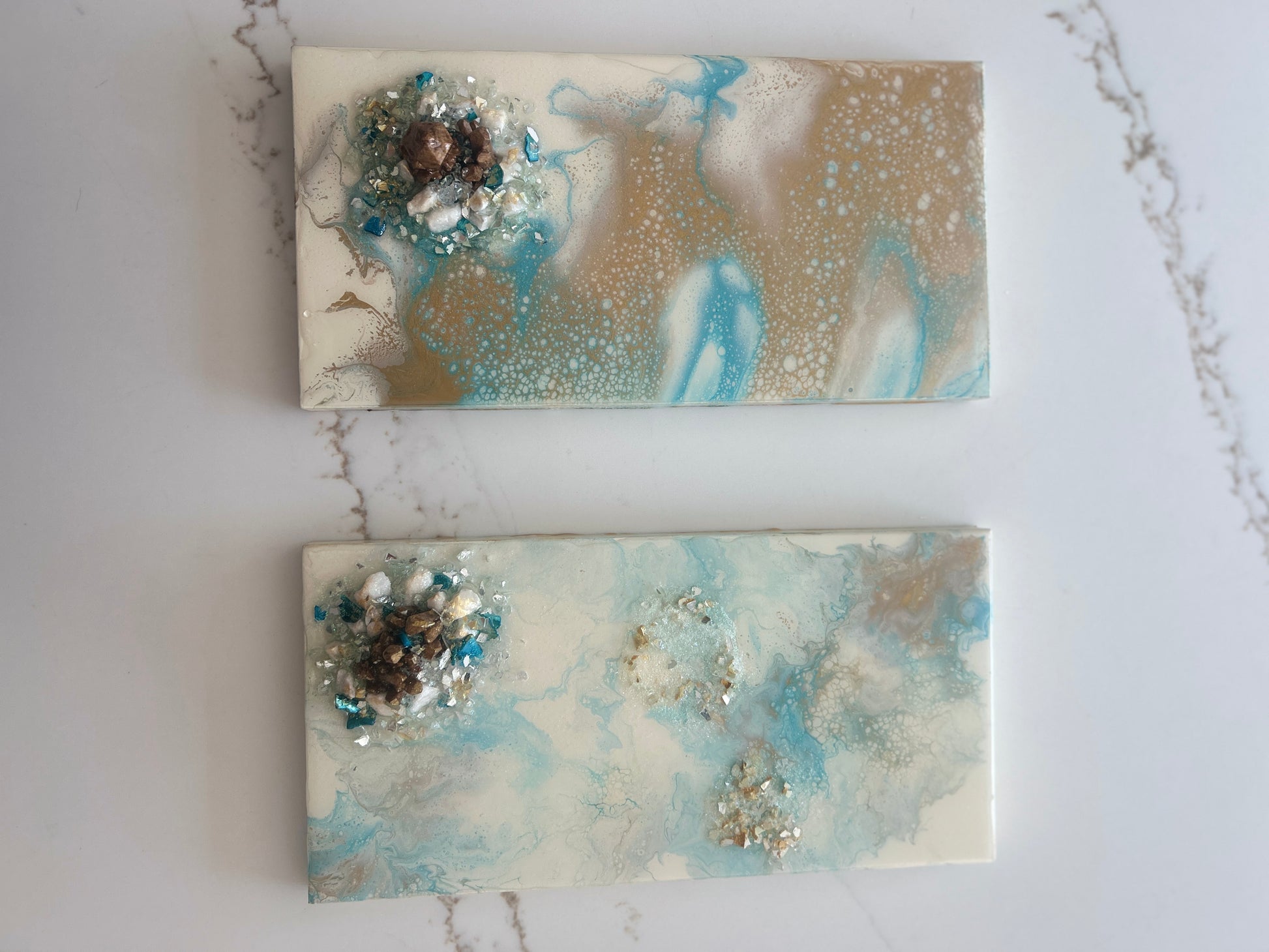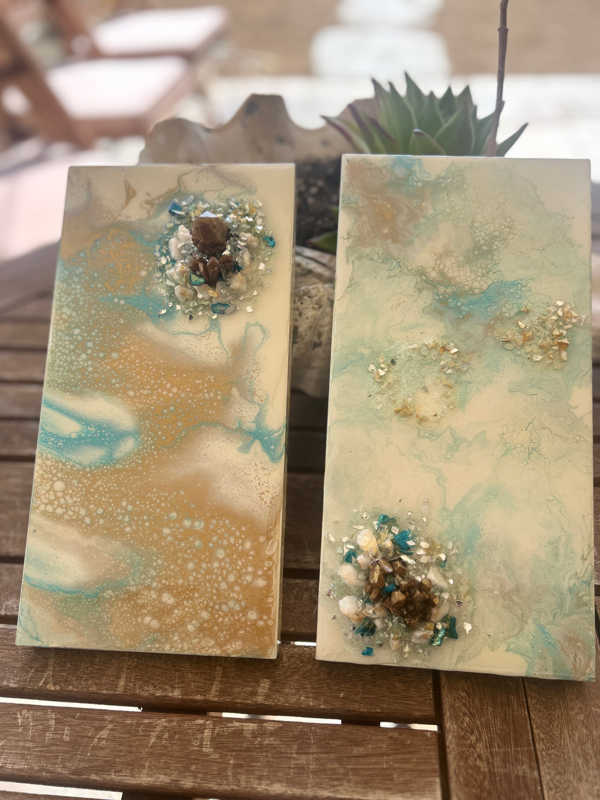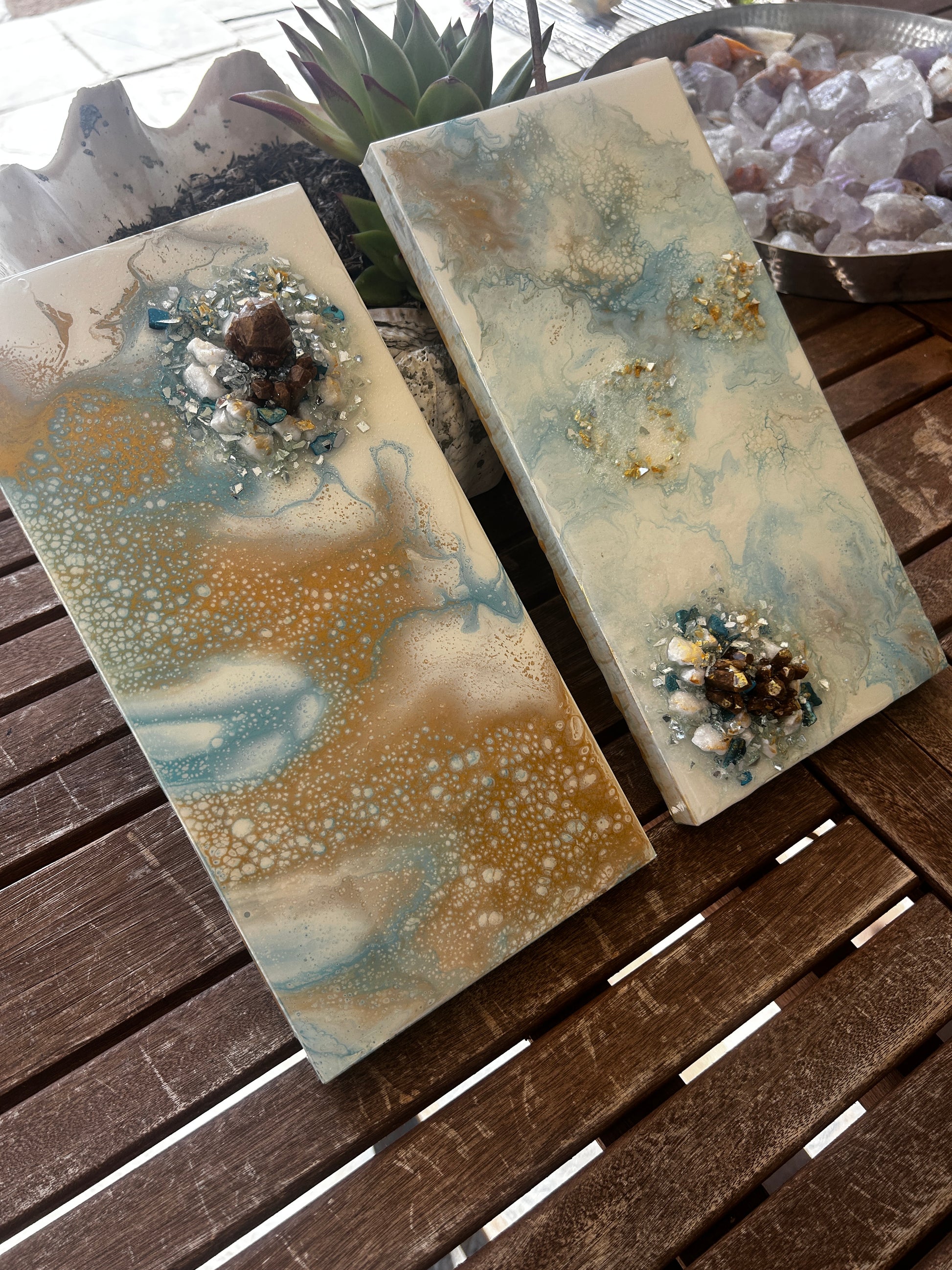 Enhance your decor with the "Geode Vibe set of two," a refined handmade art piece showcasing subtle hues paired with gleaming gold highlights. Each panel, crafted carefully using acrylic and epoxy on wood, features an intricate lacing background. Measuring 6"x 12"x 3/4", this elegant set brings a touch of sophistication to any room. Shipping is included for a seamless purchase experience.