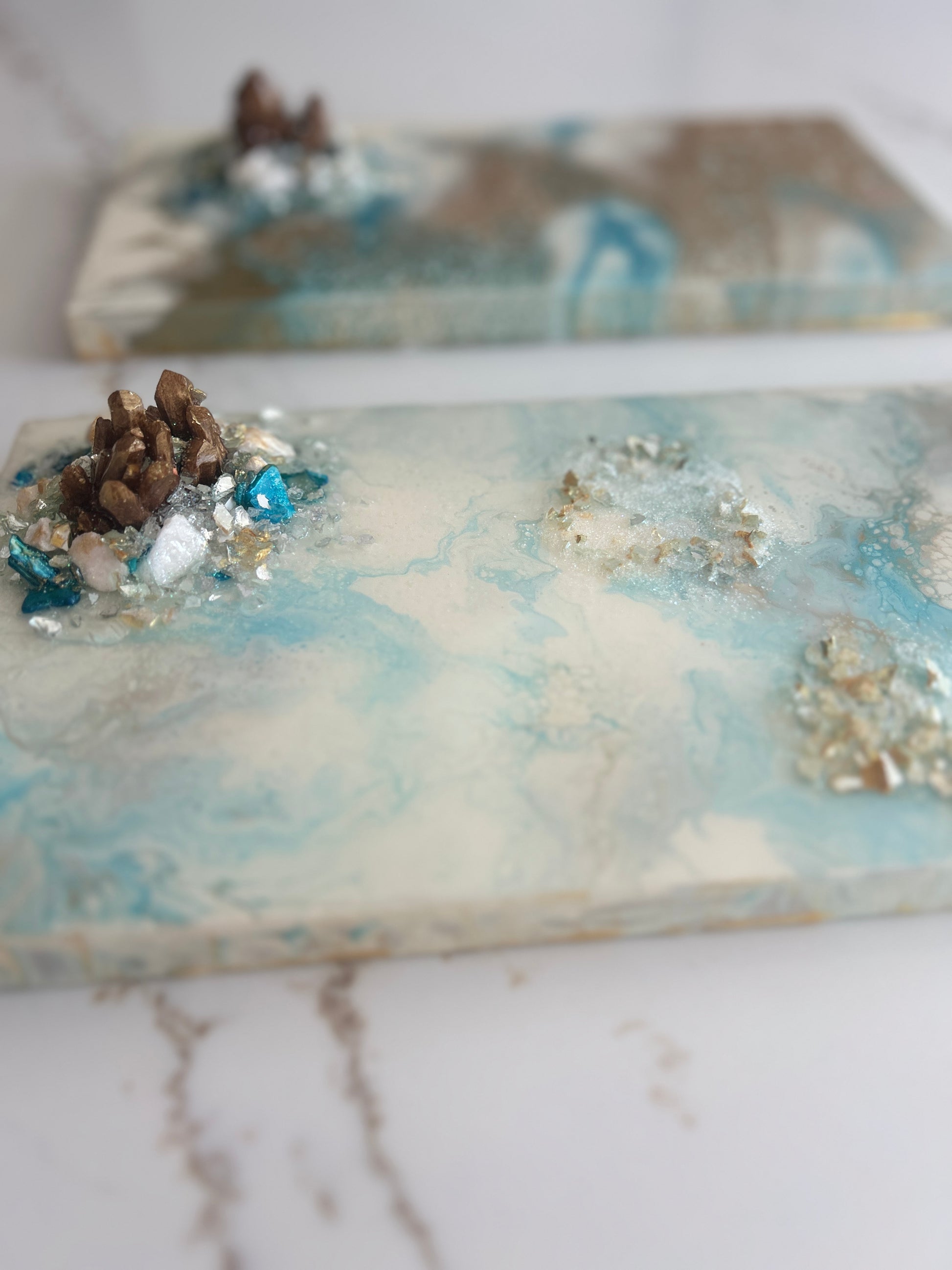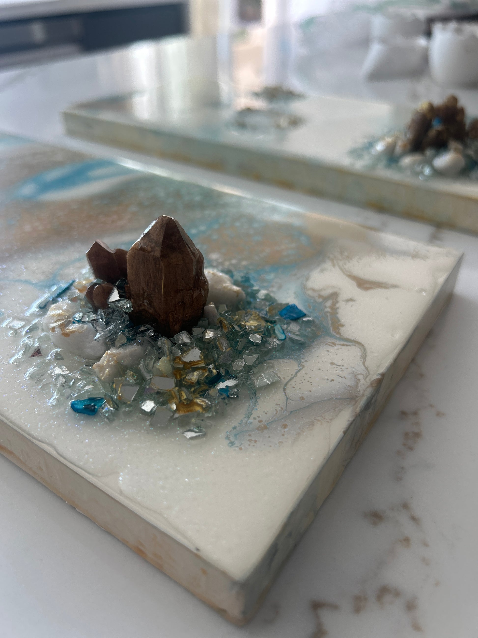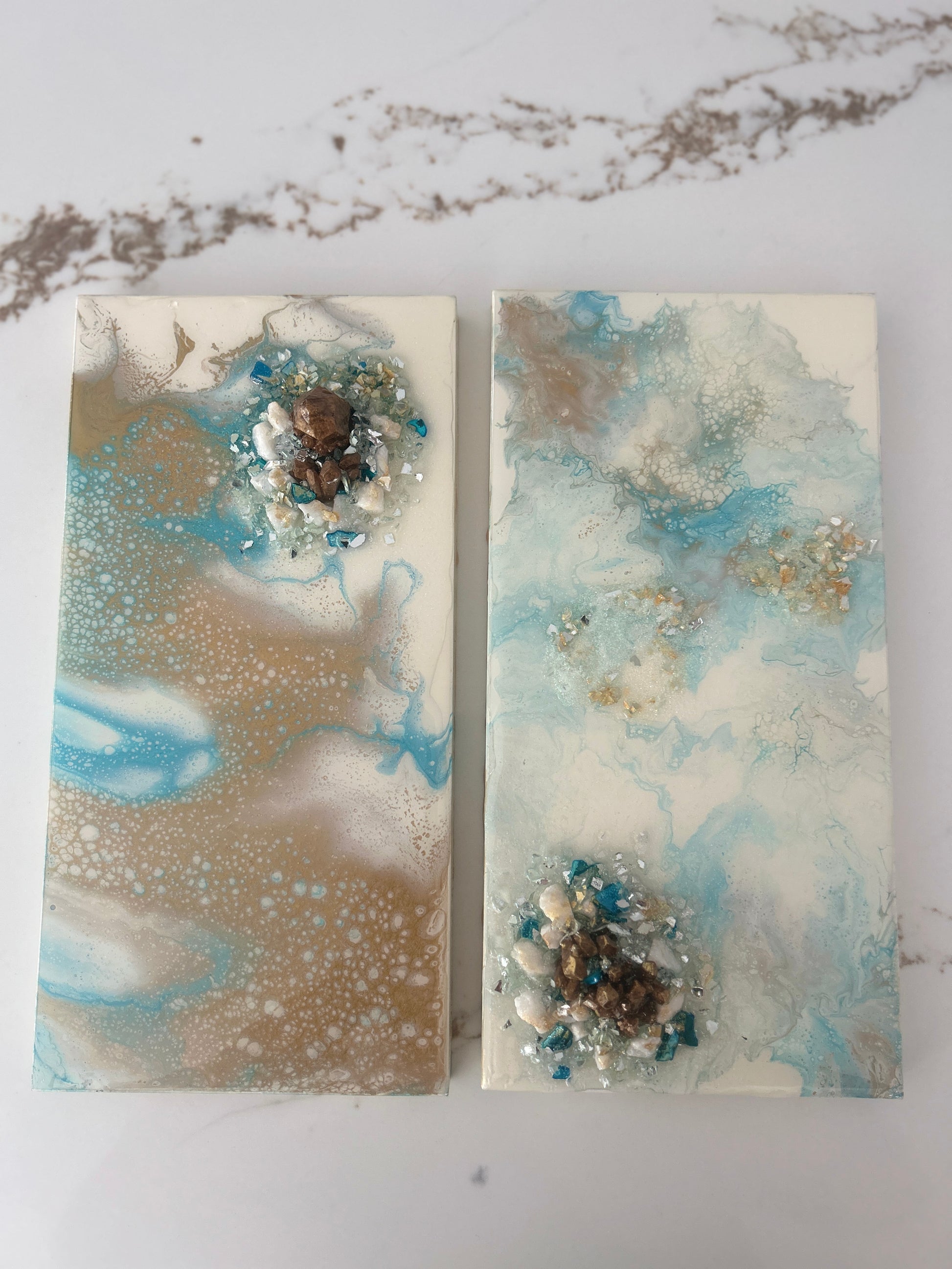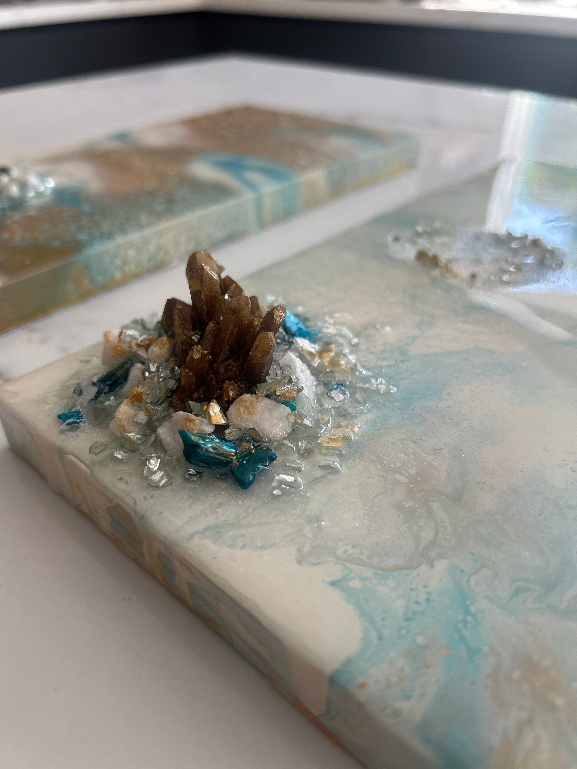 Enhance your decor with the "Geode Vibe set of two," a refined handmade art piece showcasing subtle hues paired with gleaming gold highlights. Each panel, crafted carefully using acrylic and epoxy on wood, features an intricate lacing background. Measuring 6"x 12"x 3/4", this elegant set brings a touch of sophistication to any room. Shipping is included for a seamless purchase experience.