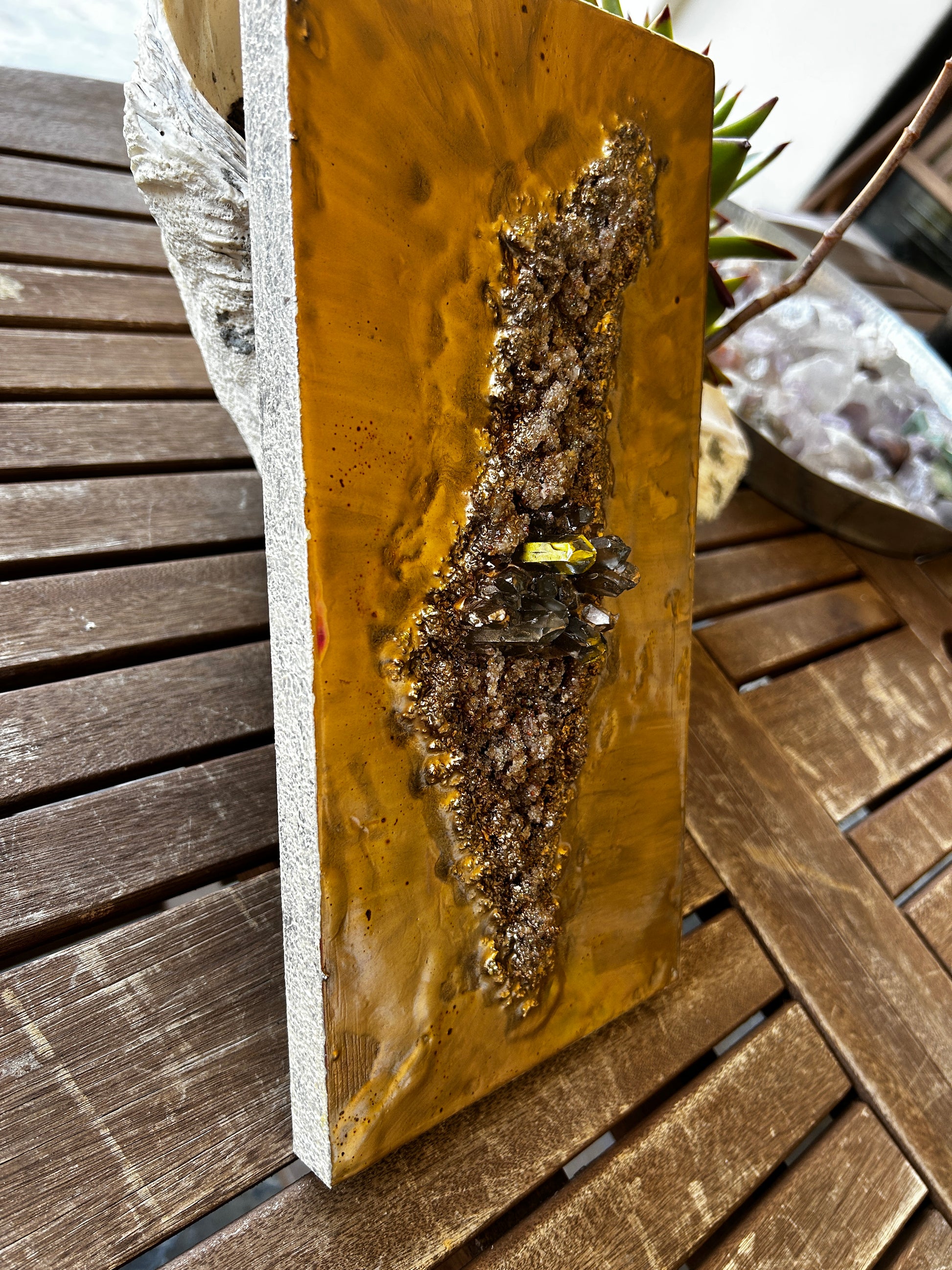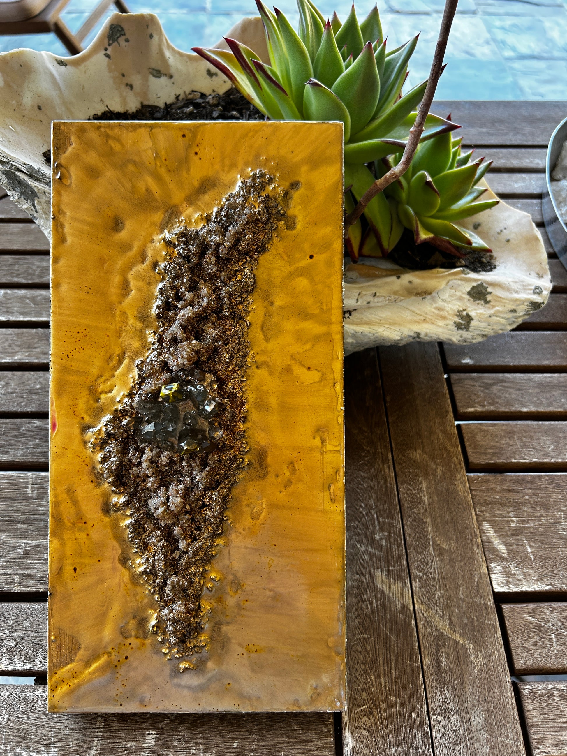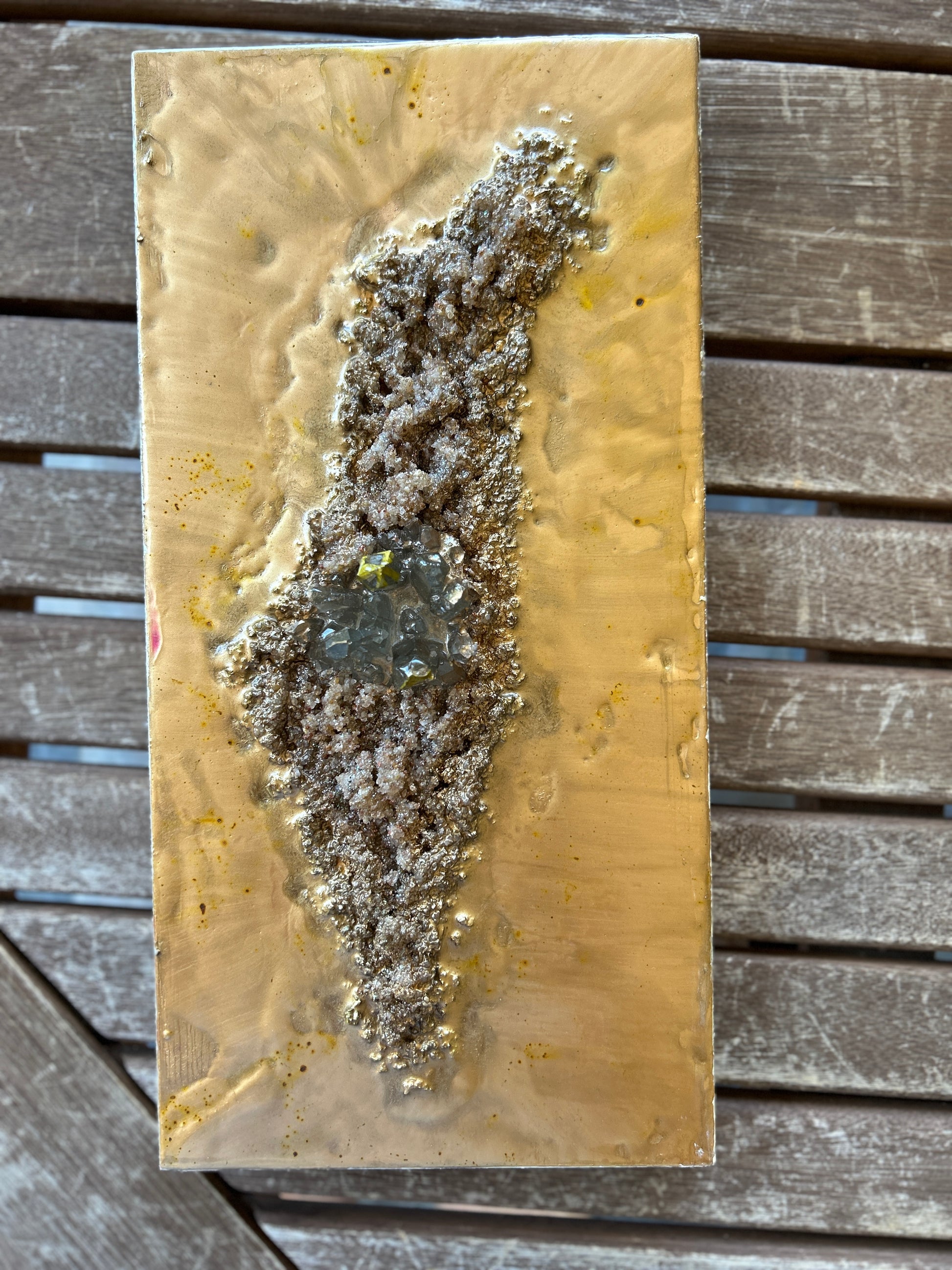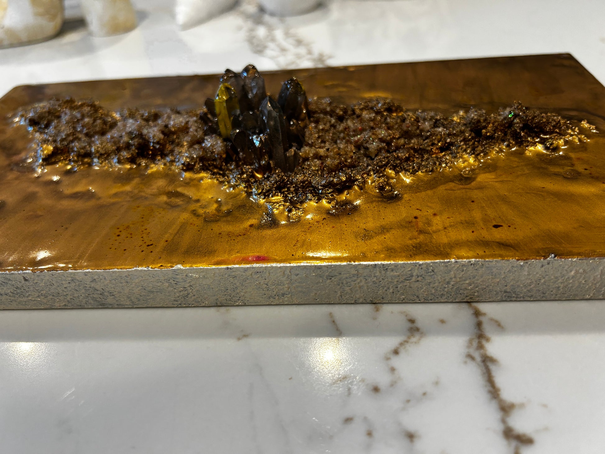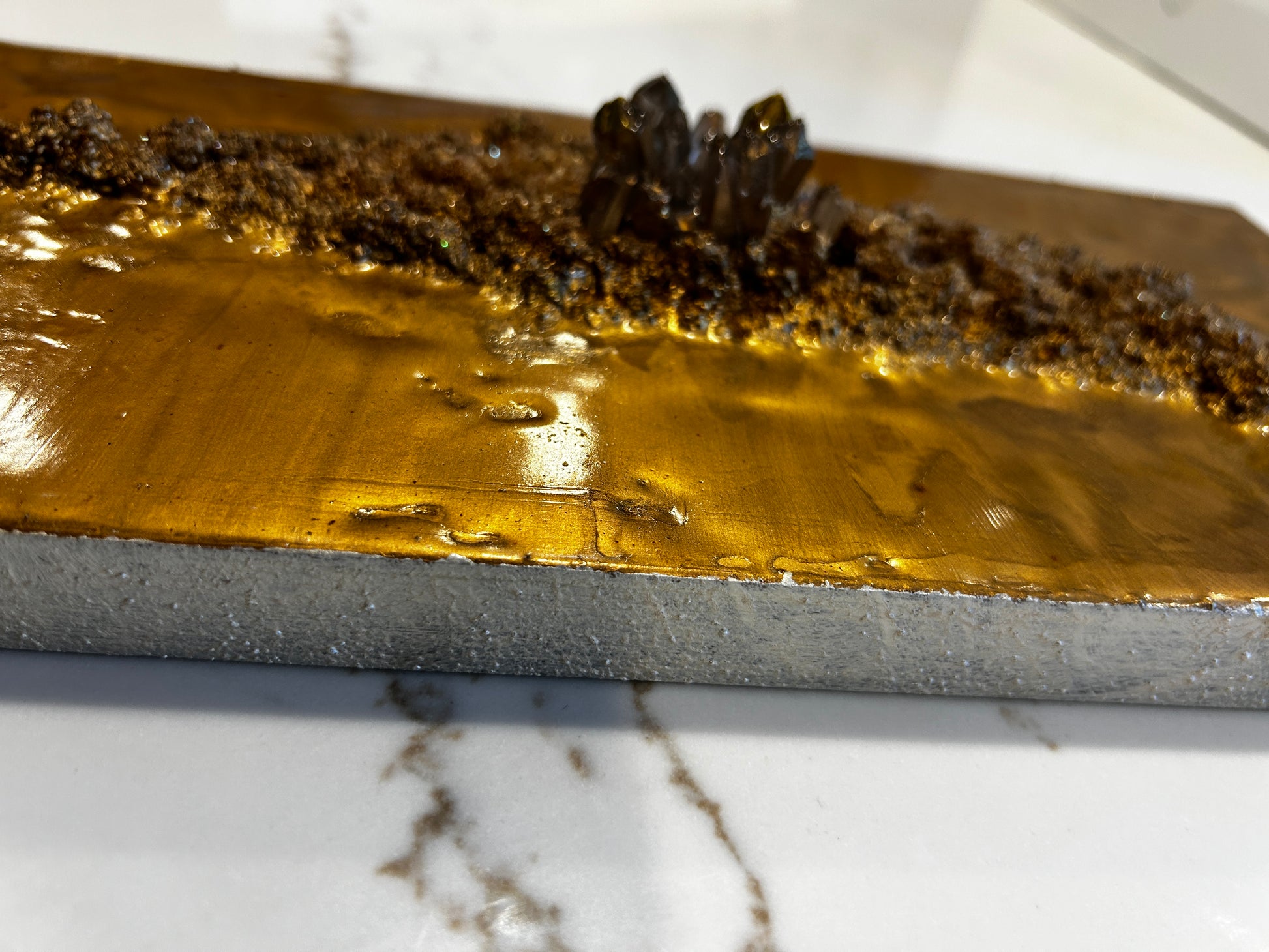 The Painting Israel Chrome Geode Vibe is a sophisticated handmade artwork combining subtle tones with striking chrome highlights. Meticulously crafted using acrylic and epoxy on wood, it features a detailed, textured background that adds depth and elegance. Measuring 6" x 12" x 3/4", this piece elevates any space with its refined presence. Enjoy complimentary shipping for a convenient and effortless acquisition.