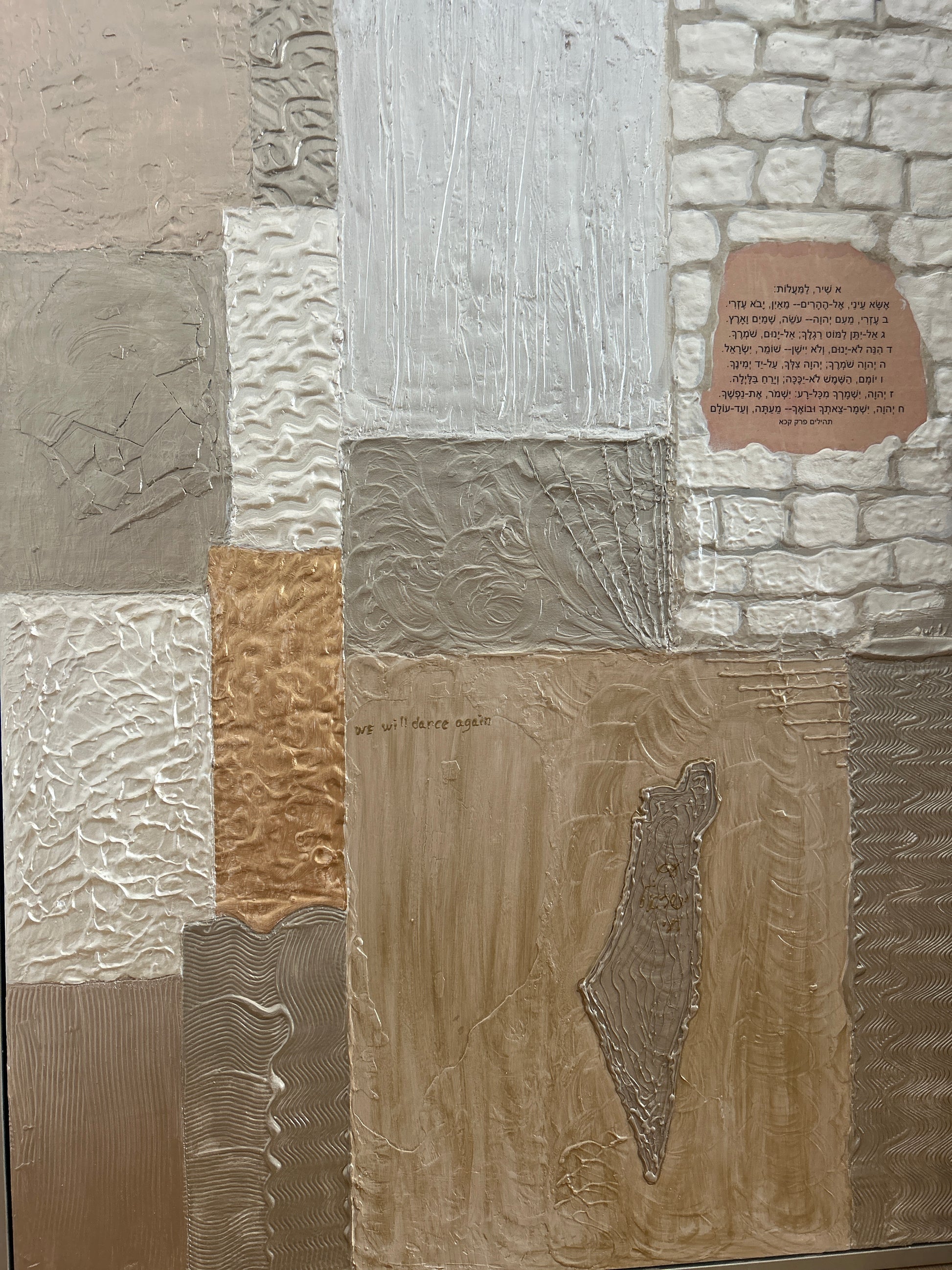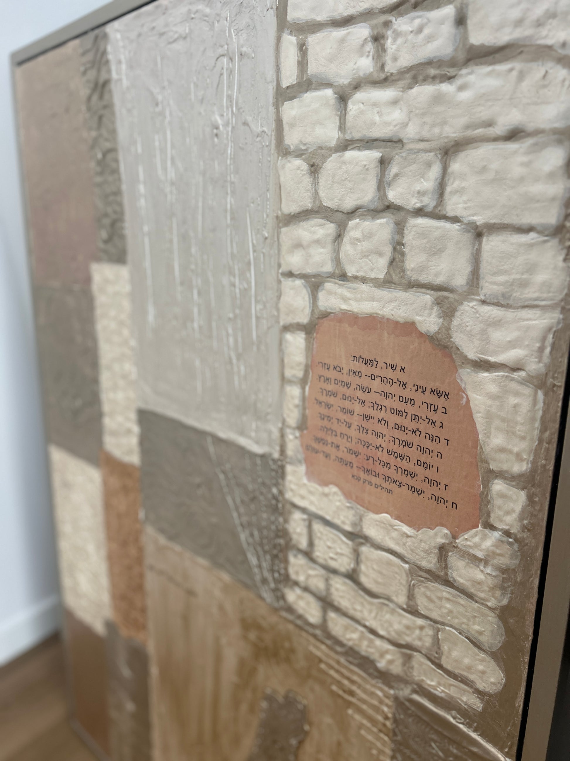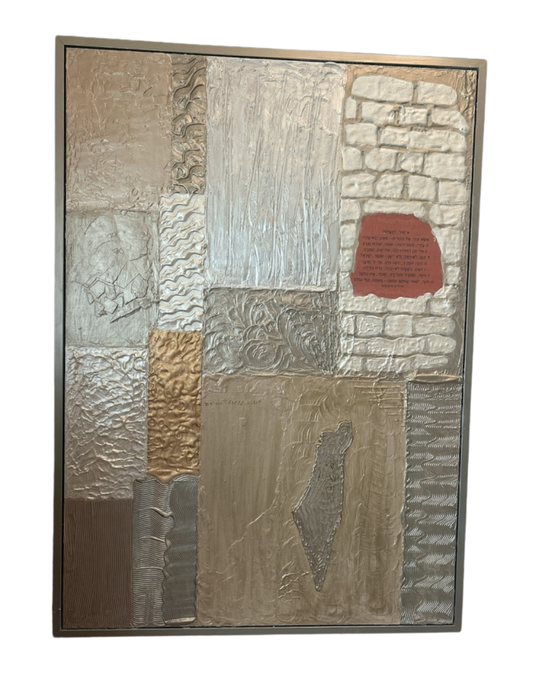 This abstract artwork combines handmade plaster and acrylic on canvas, featuring symbolic elements such as the blessing from Psalms chapter 121 ("A Song of Ascents" Shir La Maalot), the outline of Israel's borders, and the phrase "we will dance again." The piece serves as a meaningful and unique gift for supporters of Israel, blending spiritual inspiration with contemporary design. Its textured layers and thoughtful composition invite reflection and connection through art. Size 39"x55"