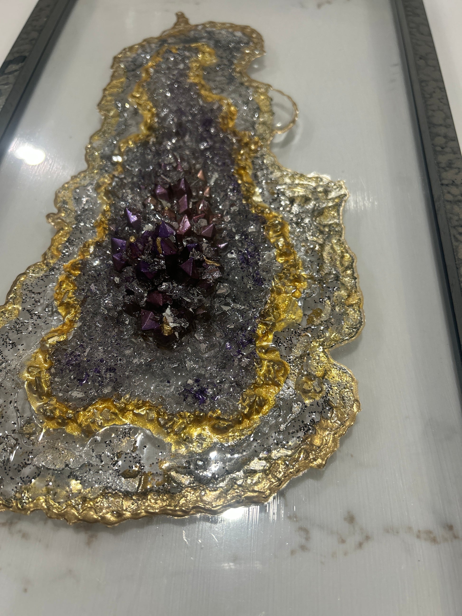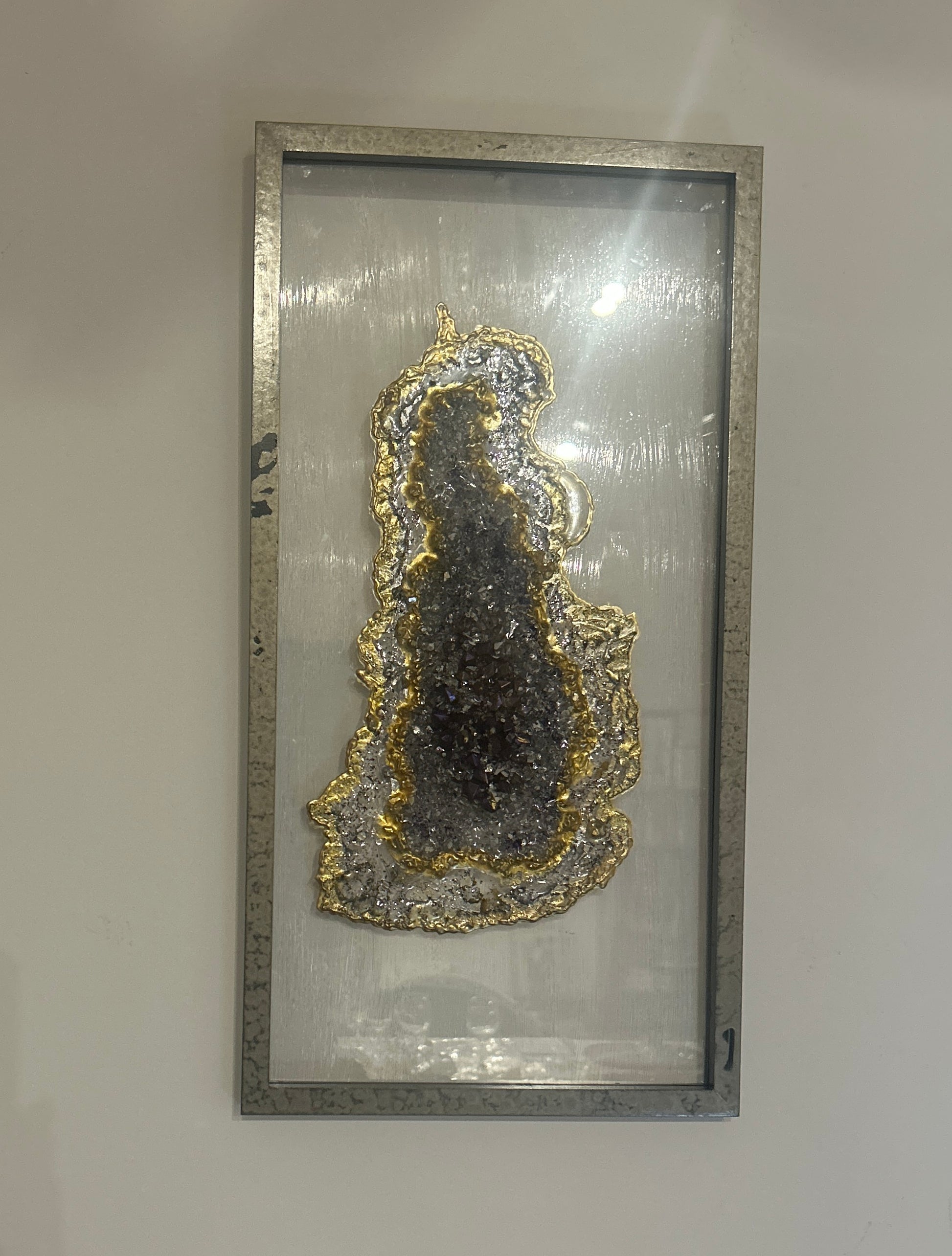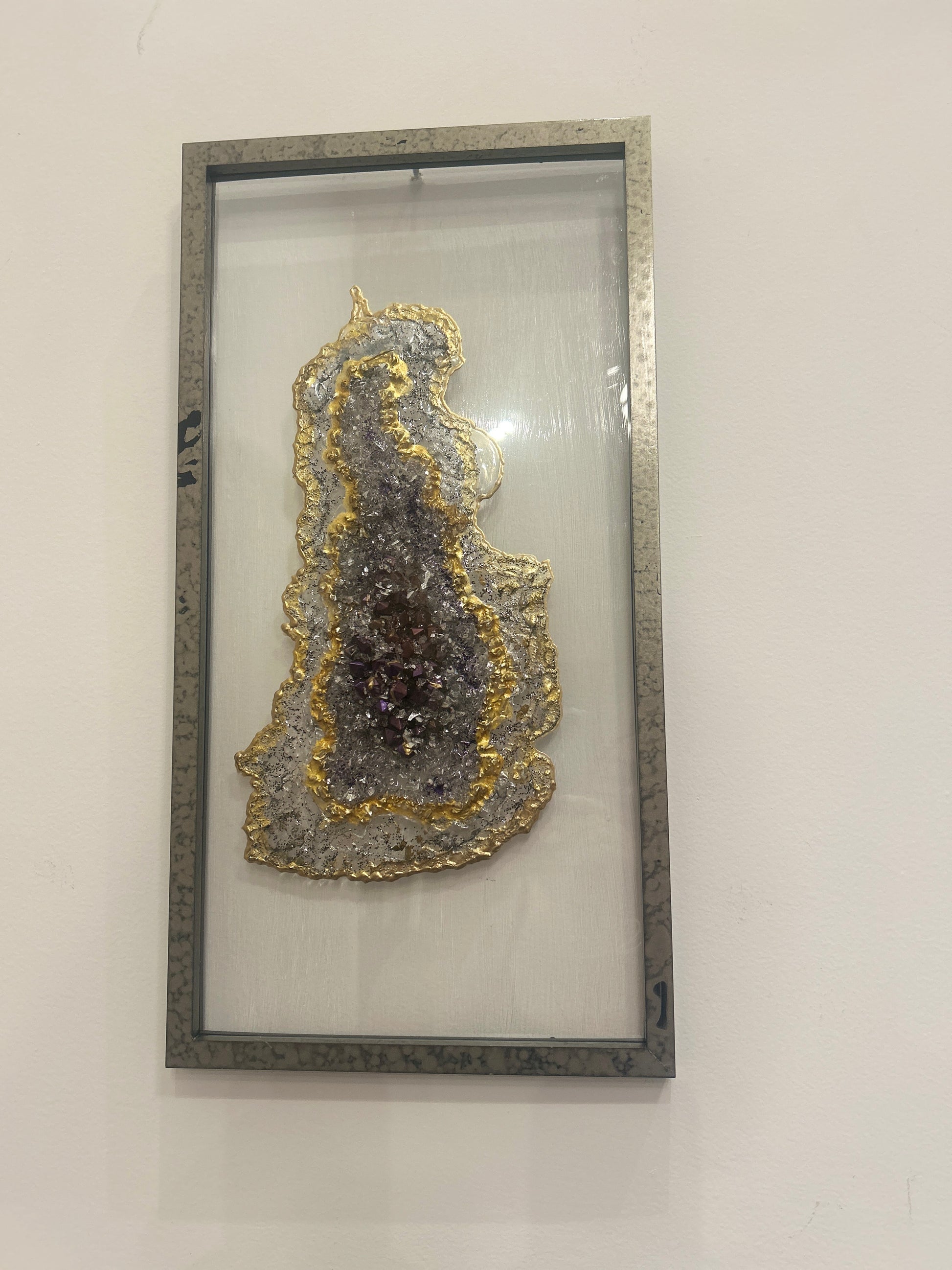 This Geode Inspiration artwork blends glass and epoxy over a clear background, creating a unique piece designed to evoke tranquility. Measuring 11"x21", it offers a serene visual experience that can be customized with your preferred colors to match your space. Perfect for those seeking both beauty and calm in their environment. Can be ordered with the color of your choice. Price is included shipping.