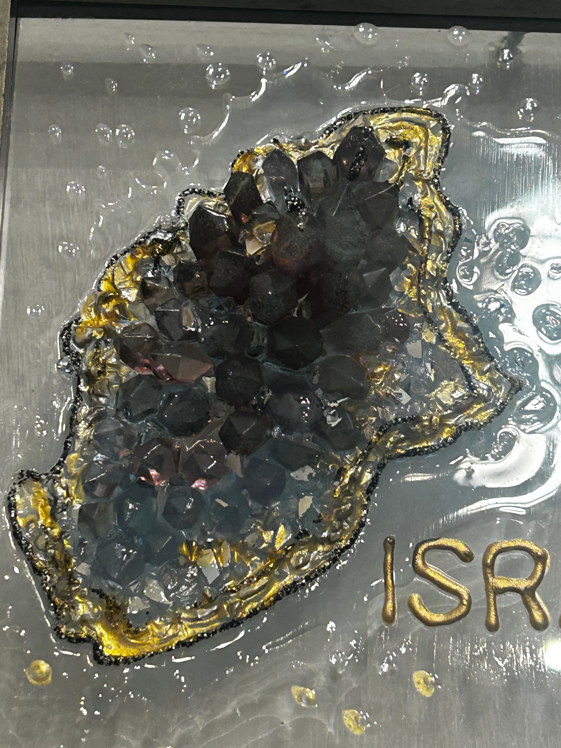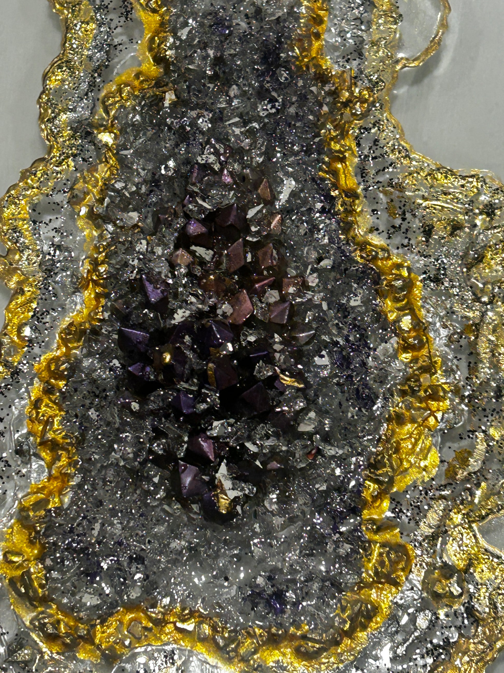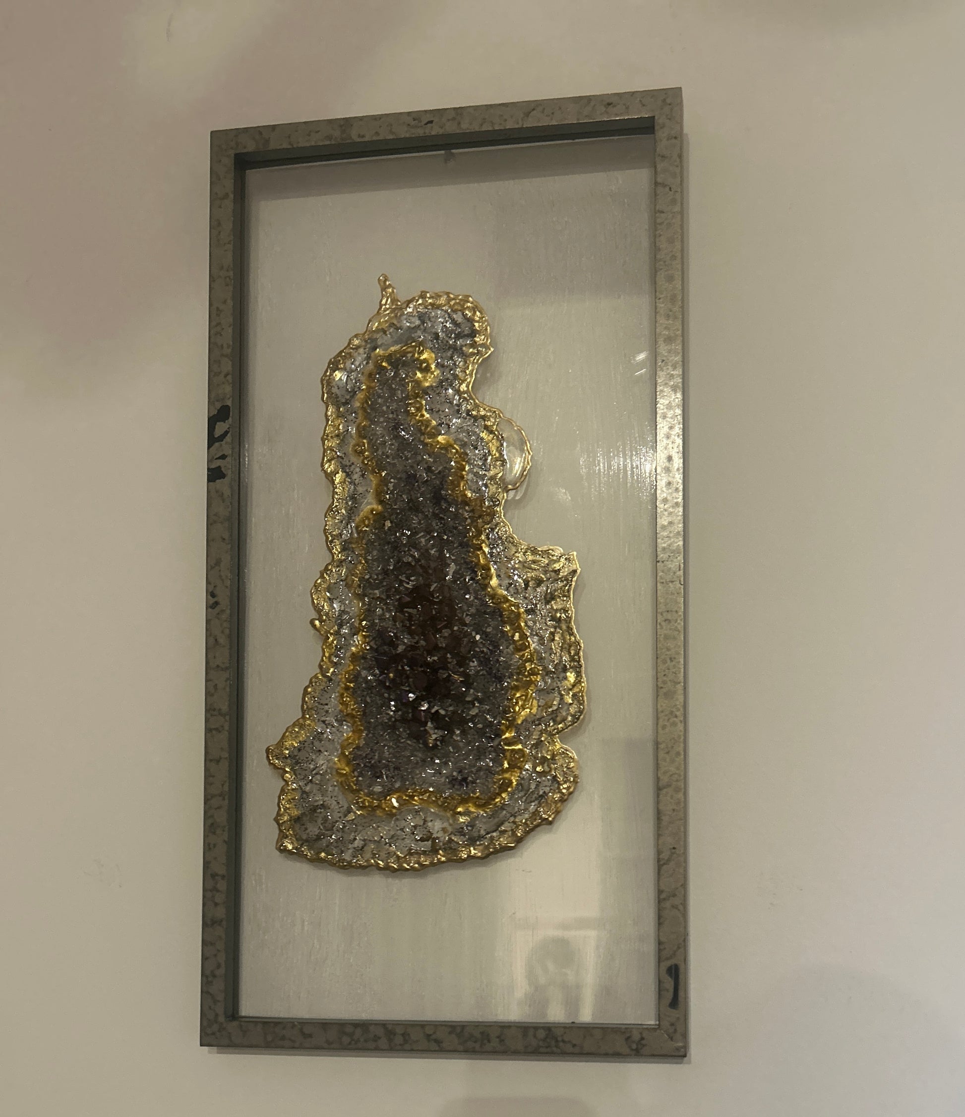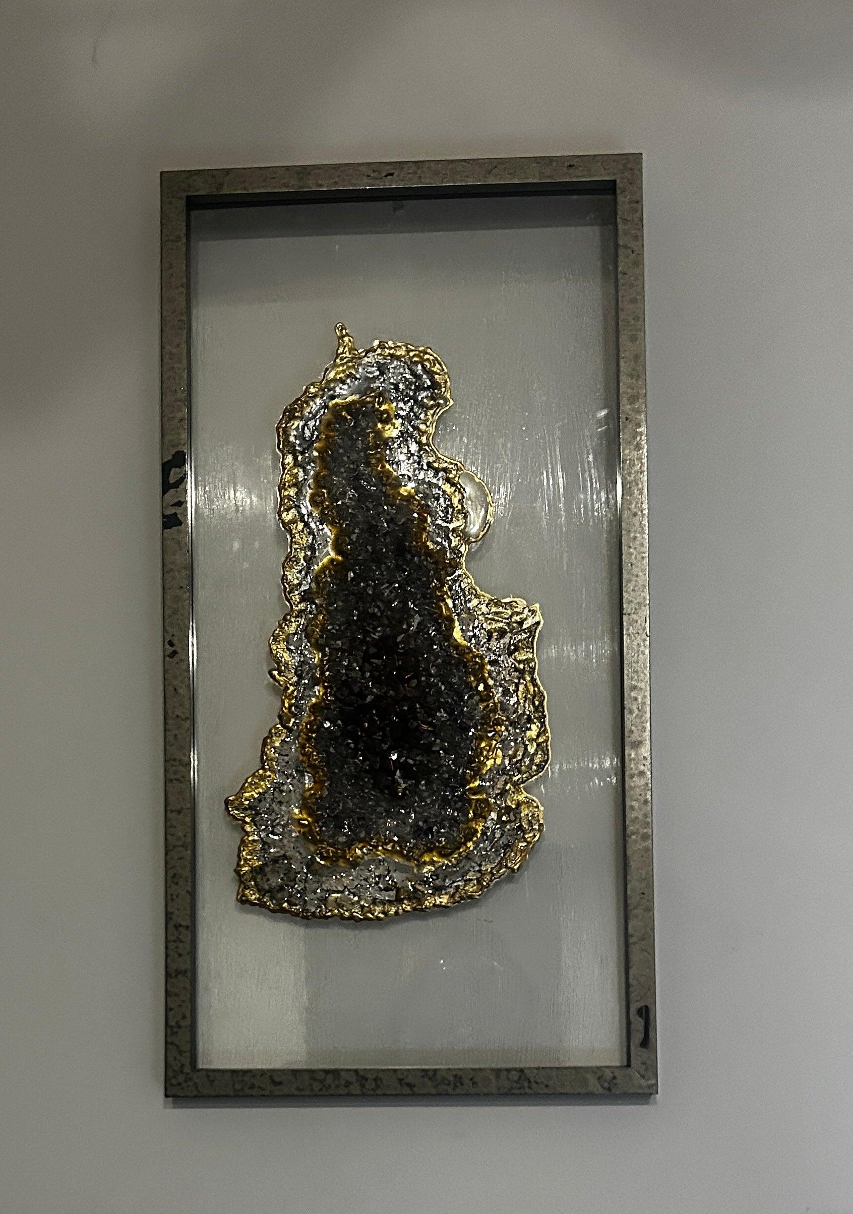 This Geode Inspiration artwork blends glass and epoxy over a clear background, creating a unique piece designed to evoke tranquility. Measuring 11"x21", it offers a serene visual experience that can be customized with your preferred colors to match your space. Perfect for those seeking both beauty and calm in their environment. Can be ordered with the color of your choice. Price is included shipping.