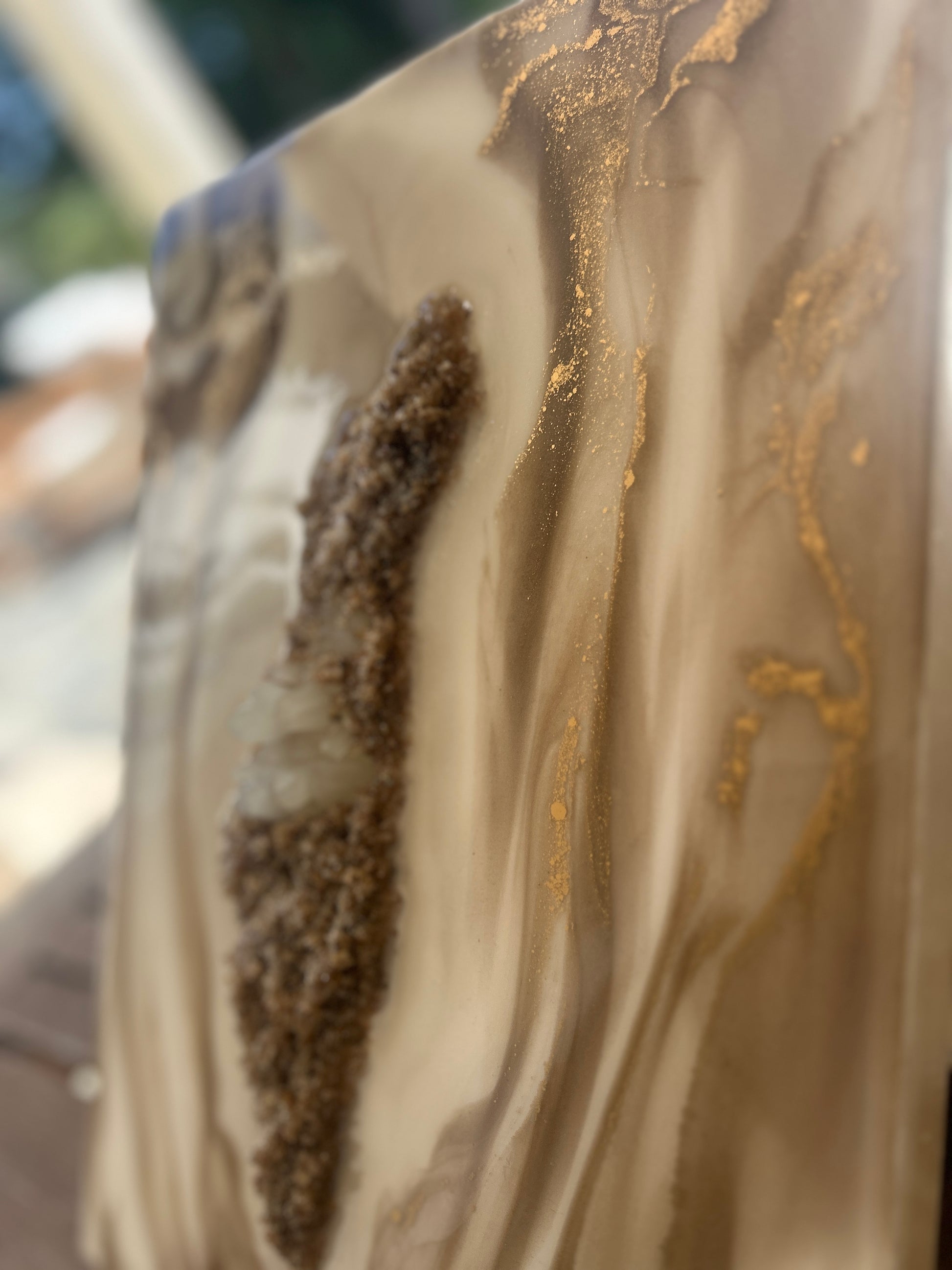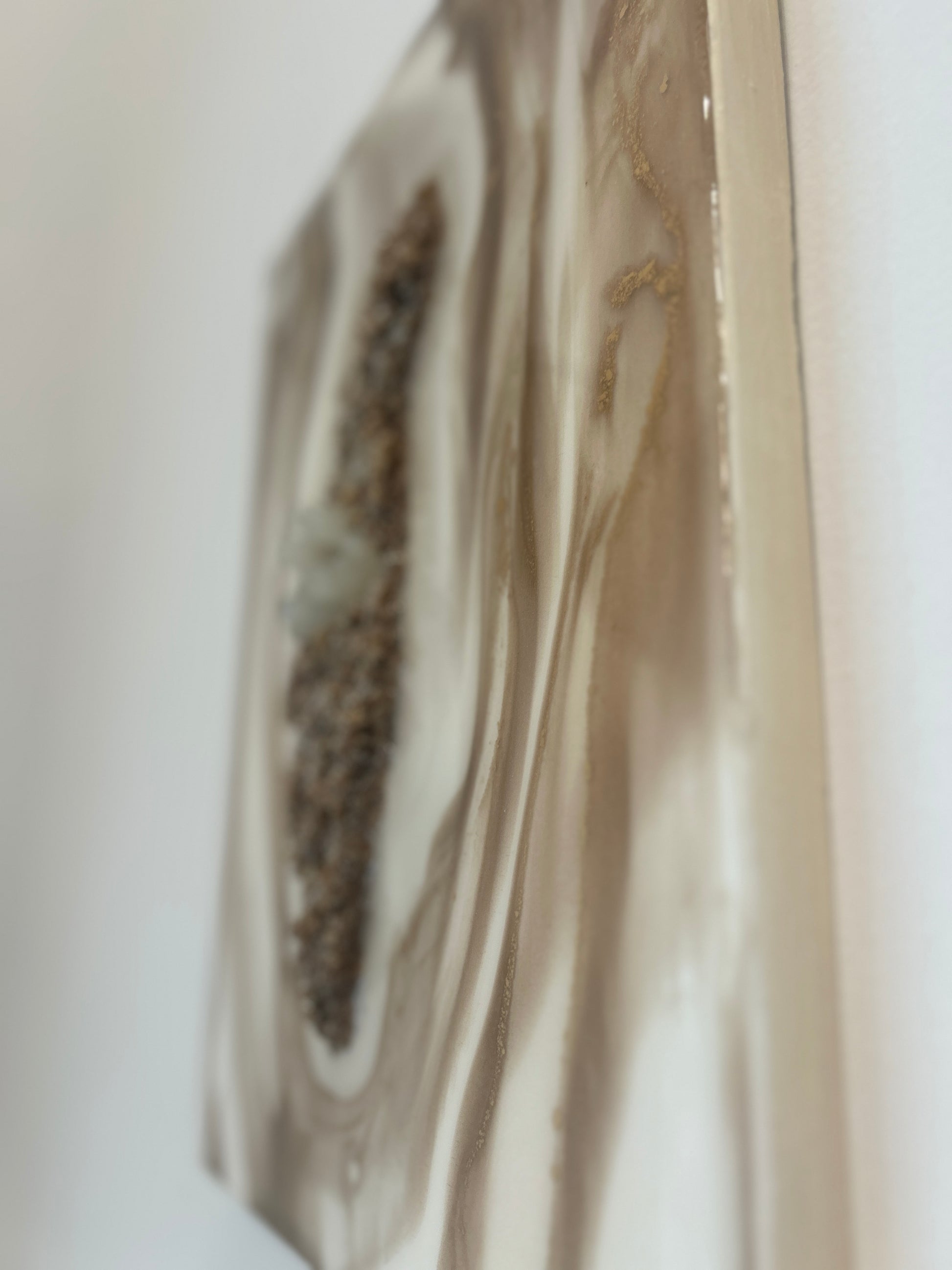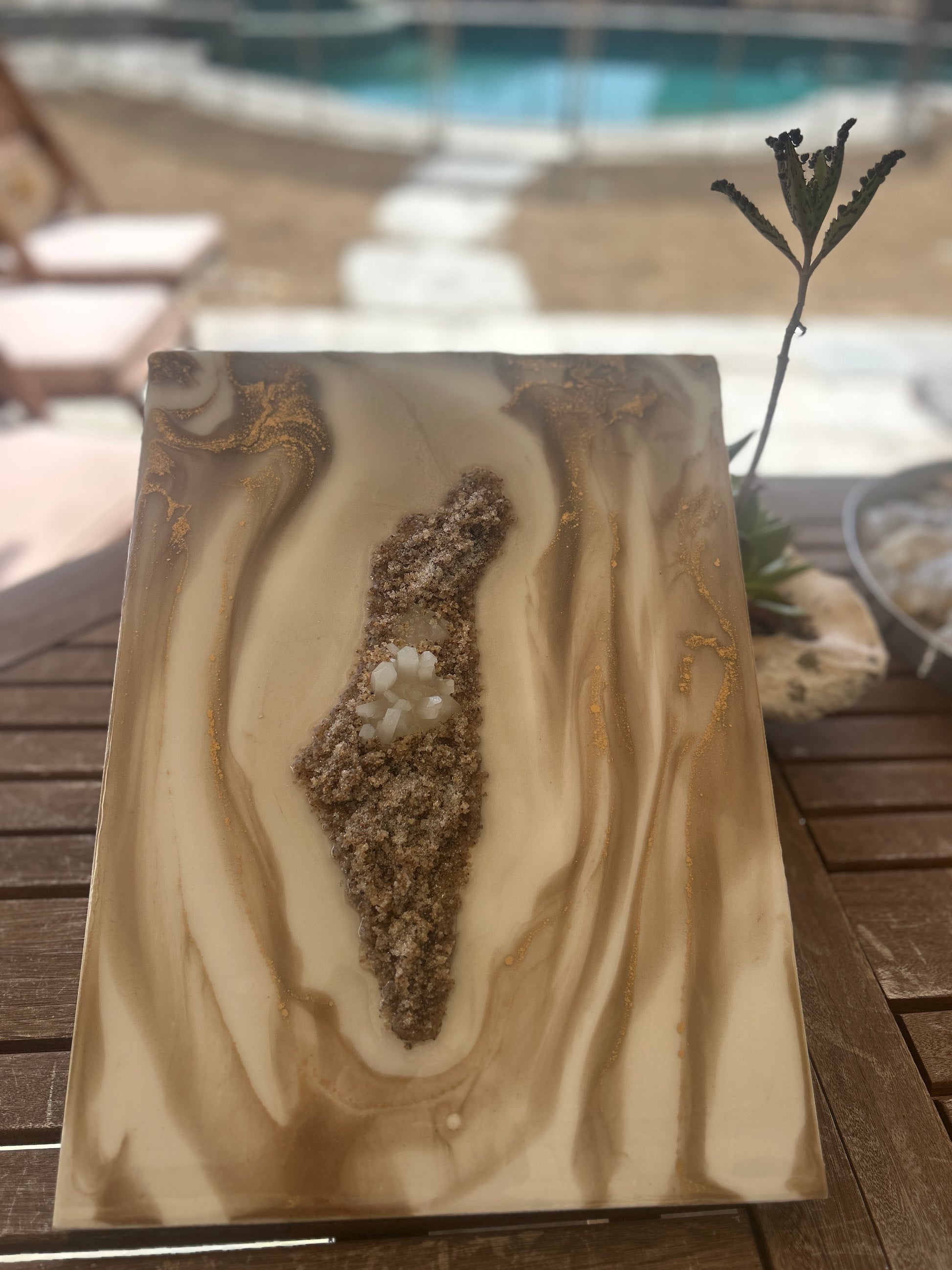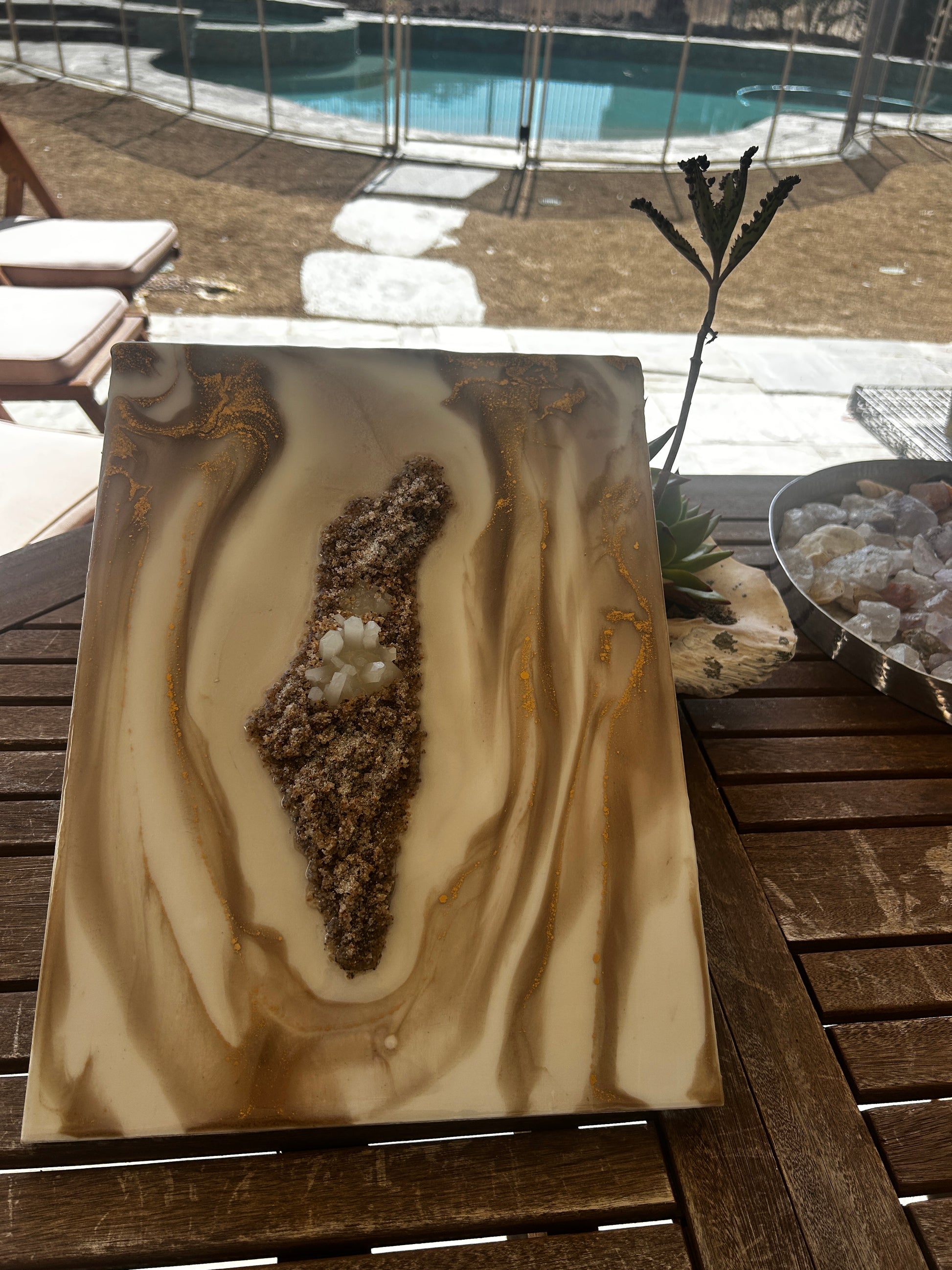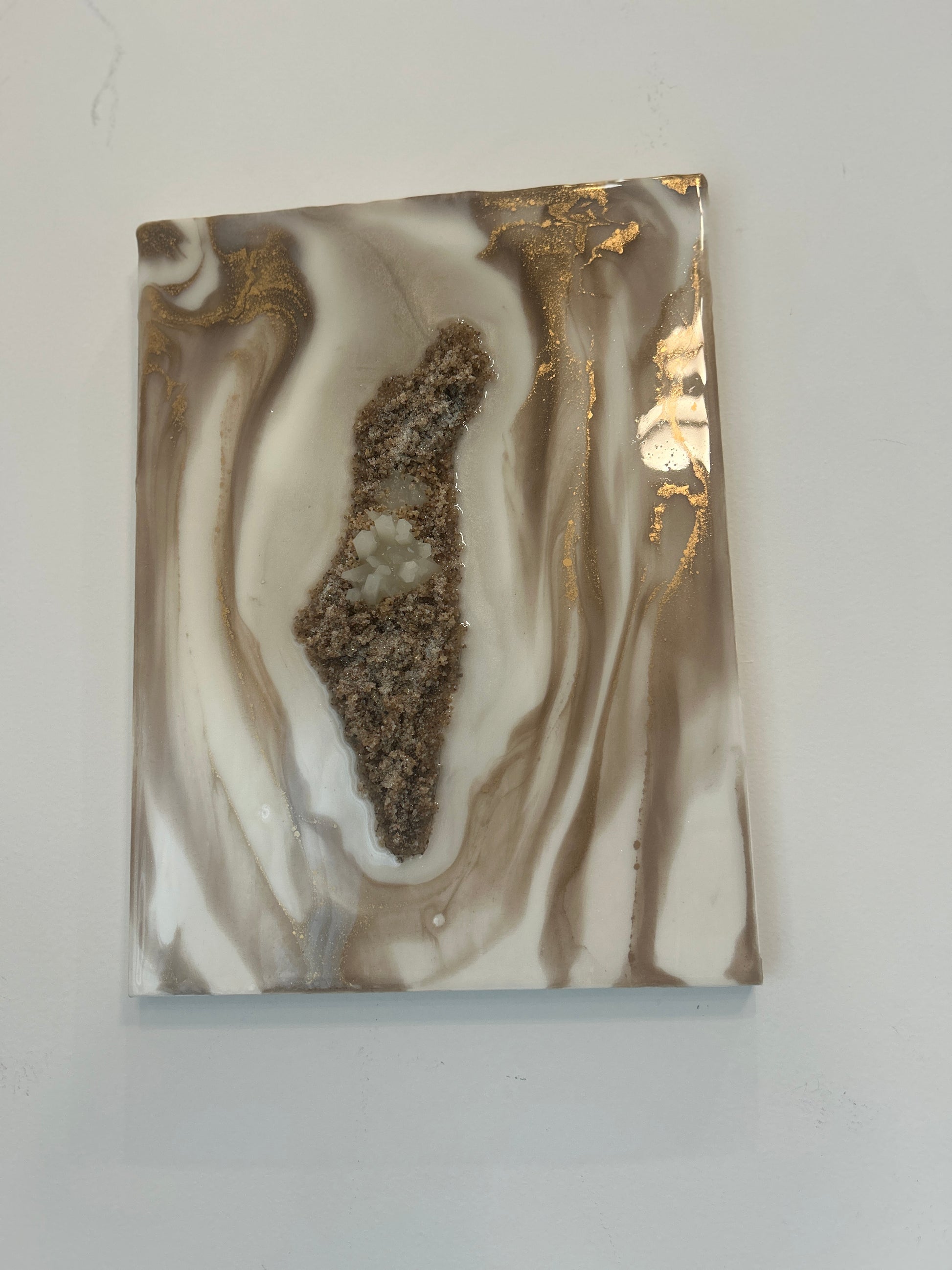 Elevate your space with "Israel Geode," a sophisticated handmade artwork that features elegant earth tones and shimmering gold accents. At its center, a captivating geode symbolizes our shared origins, making this piece a distinguished tribute for supporters of Israel. Crafted meticulously with epoxy on wood canvas, this refined artwork measures 12" x 16" and enriches any home with meaning and grace. Shipping is included in the price for your convenience.