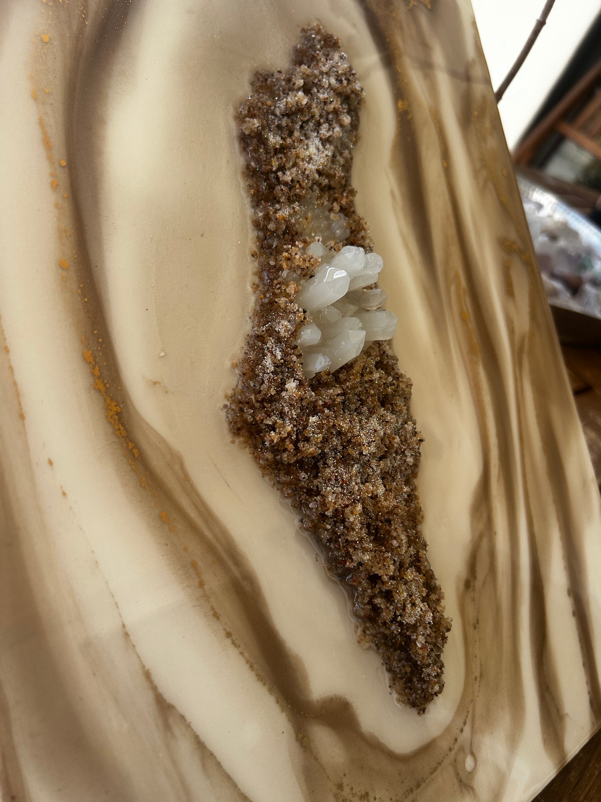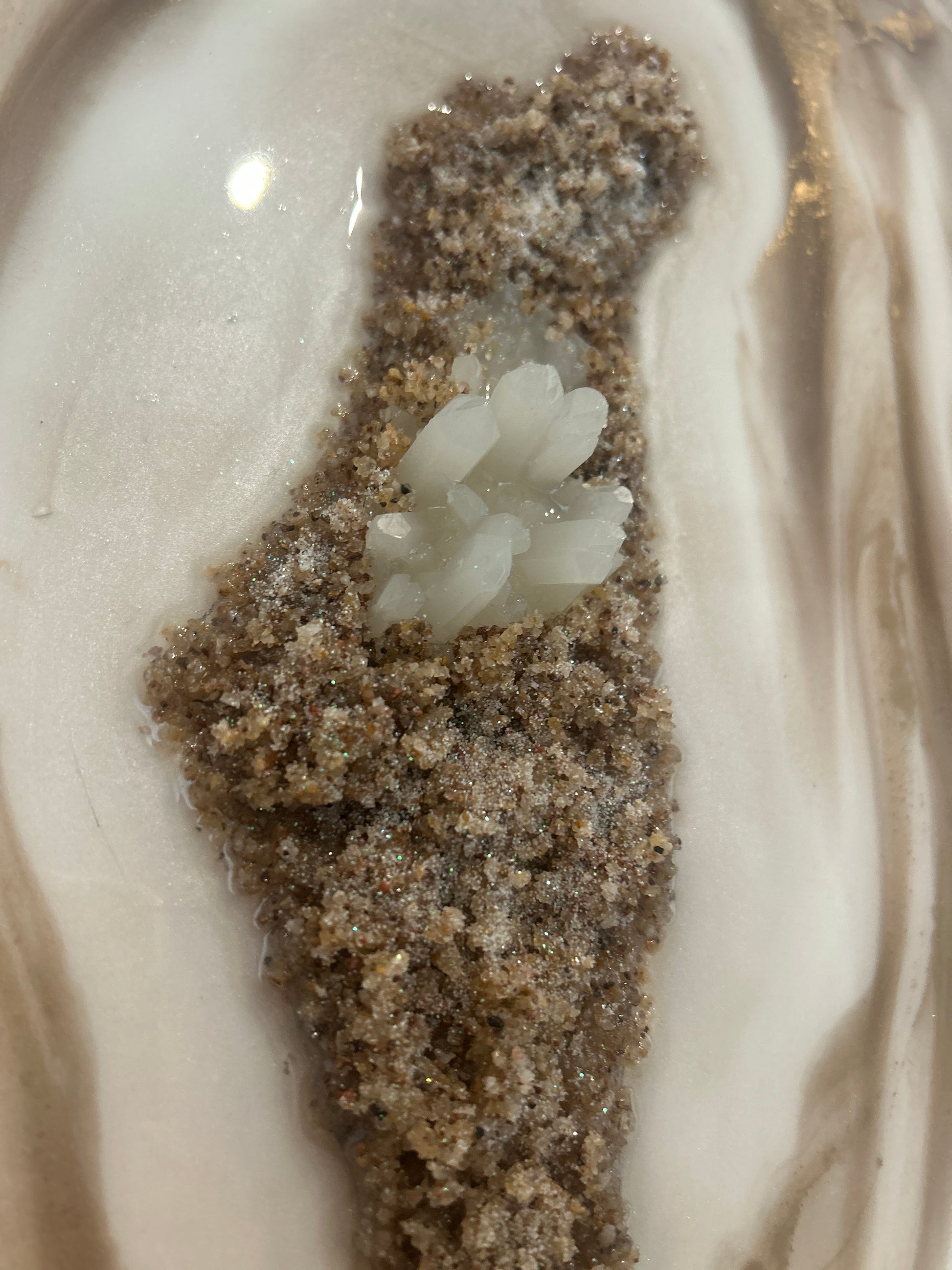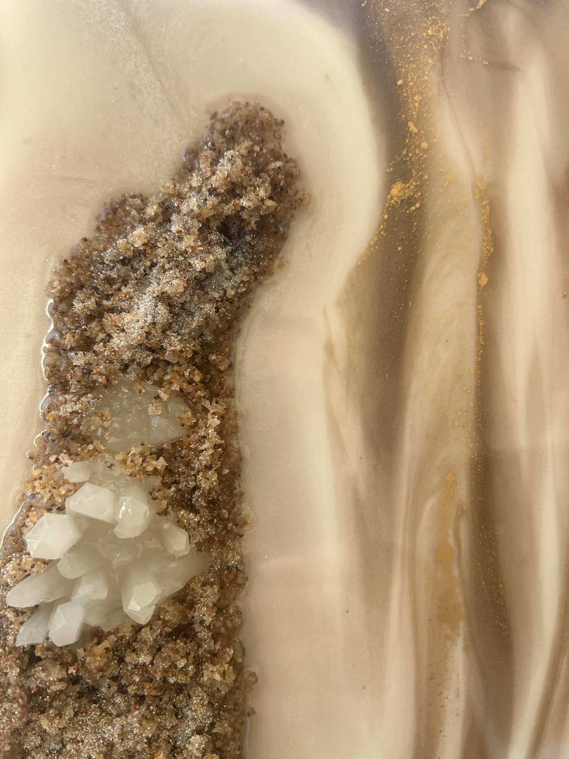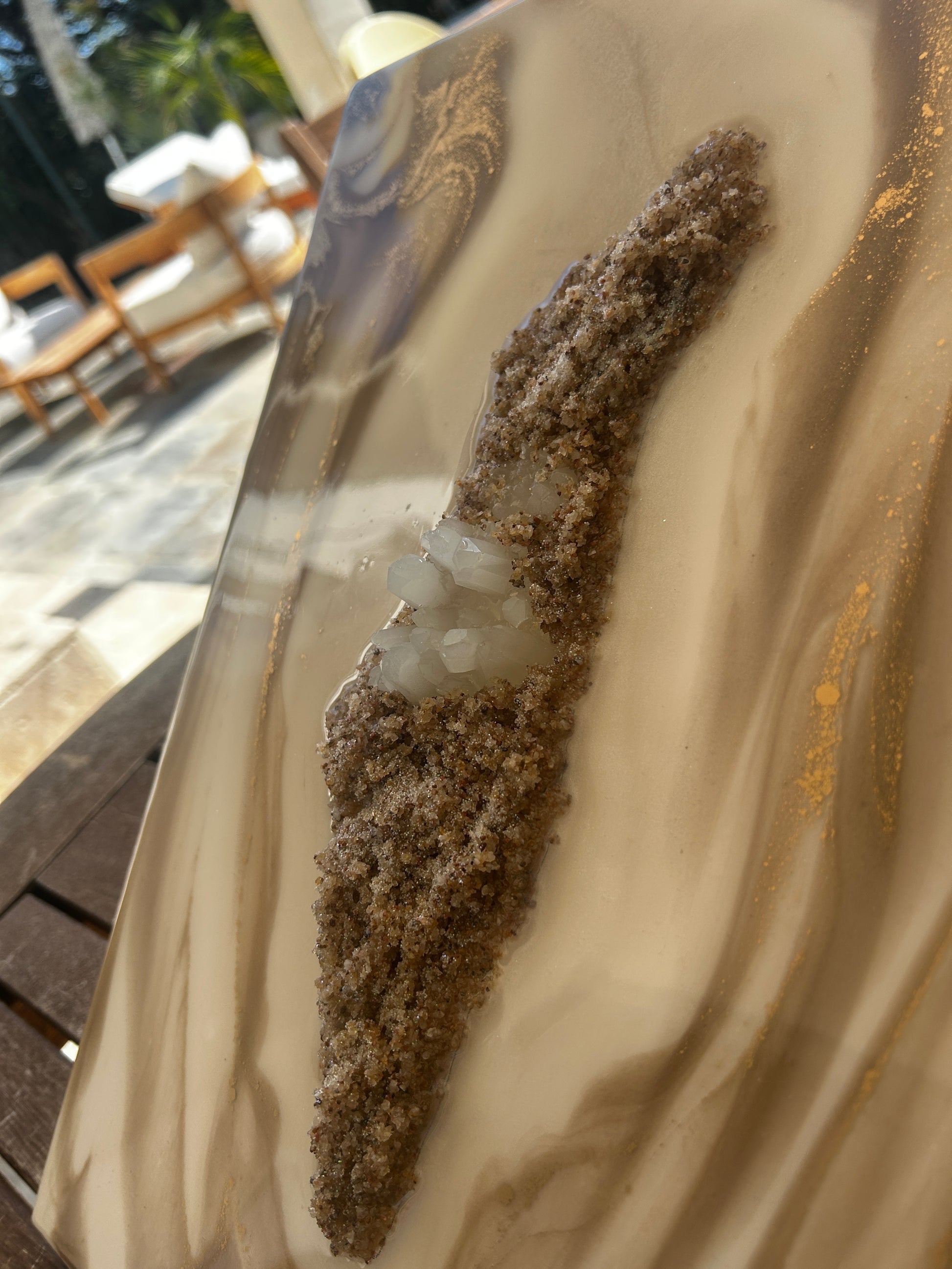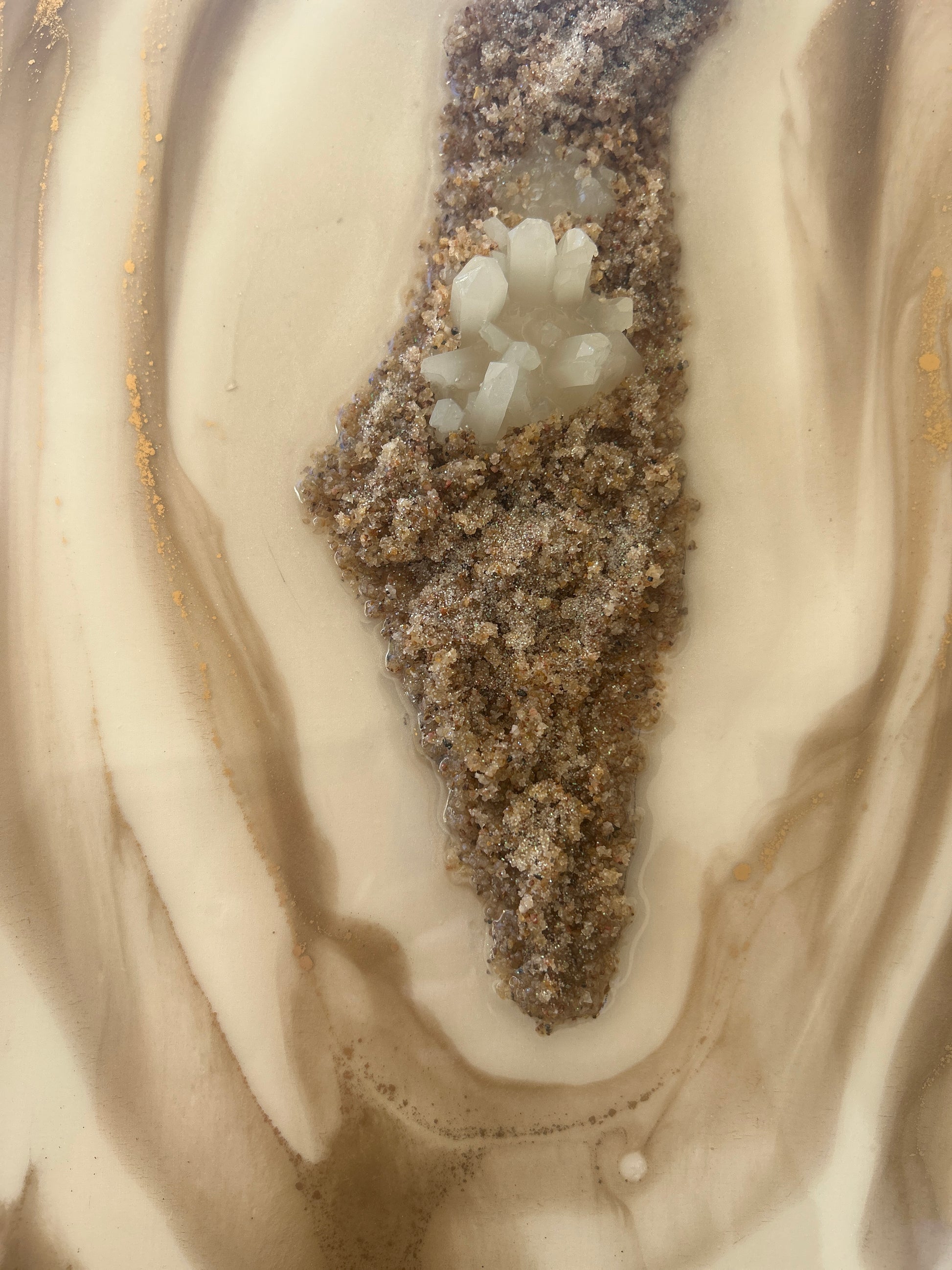Elevate your space with "Israel Geode," a sophisticated handmade artwork that features elegant earth tones and shimmering gold accents. At its center, a captivating geode symbolizes our shared origins, making this piece a distinguished tribute for supporters of Israel. Crafted meticulously with epoxy on wood canvas, this refined artwork measures 12" x 16" and enriches any home with meaning and grace. Shipping is included in the price for your convenience.