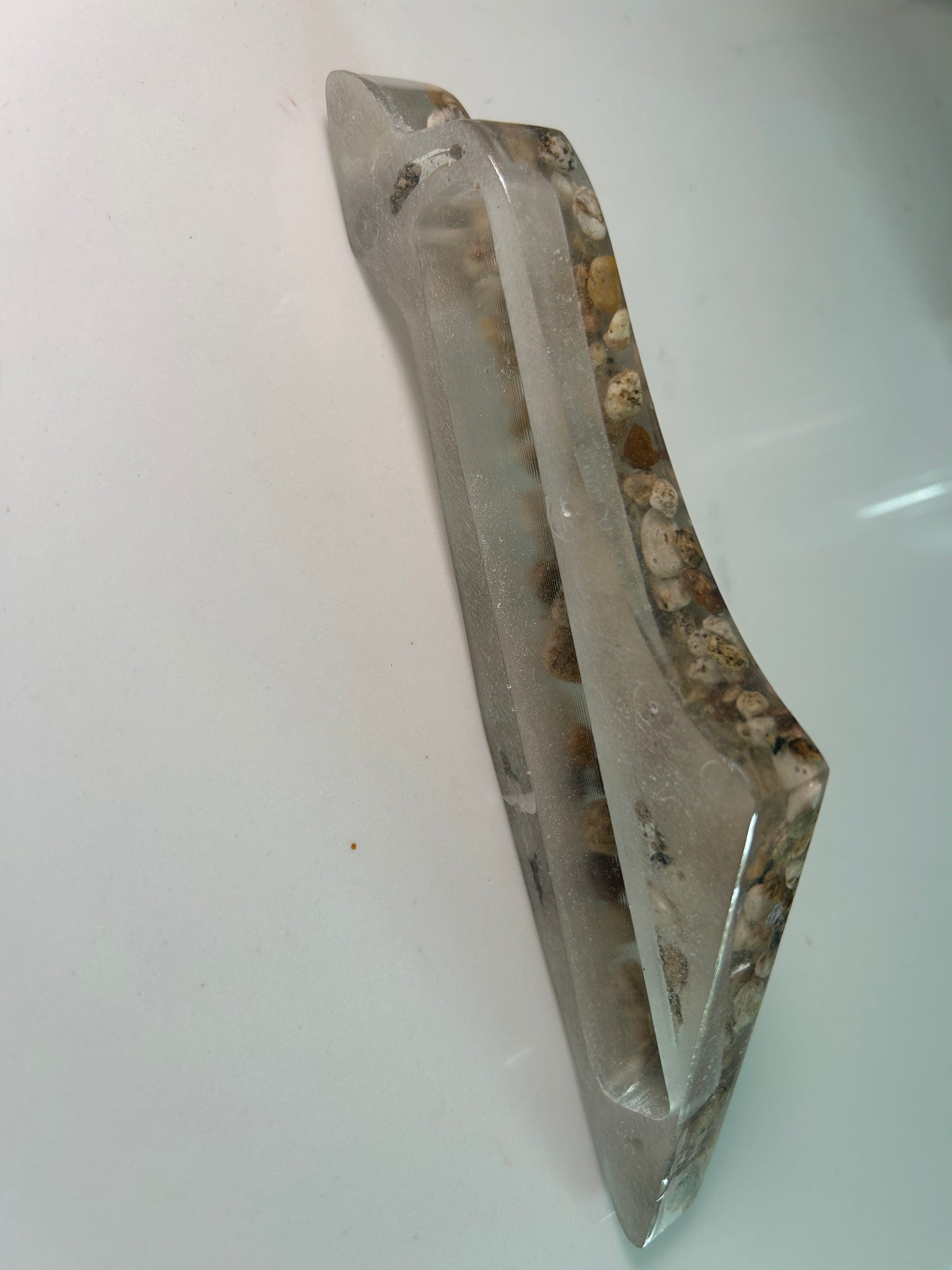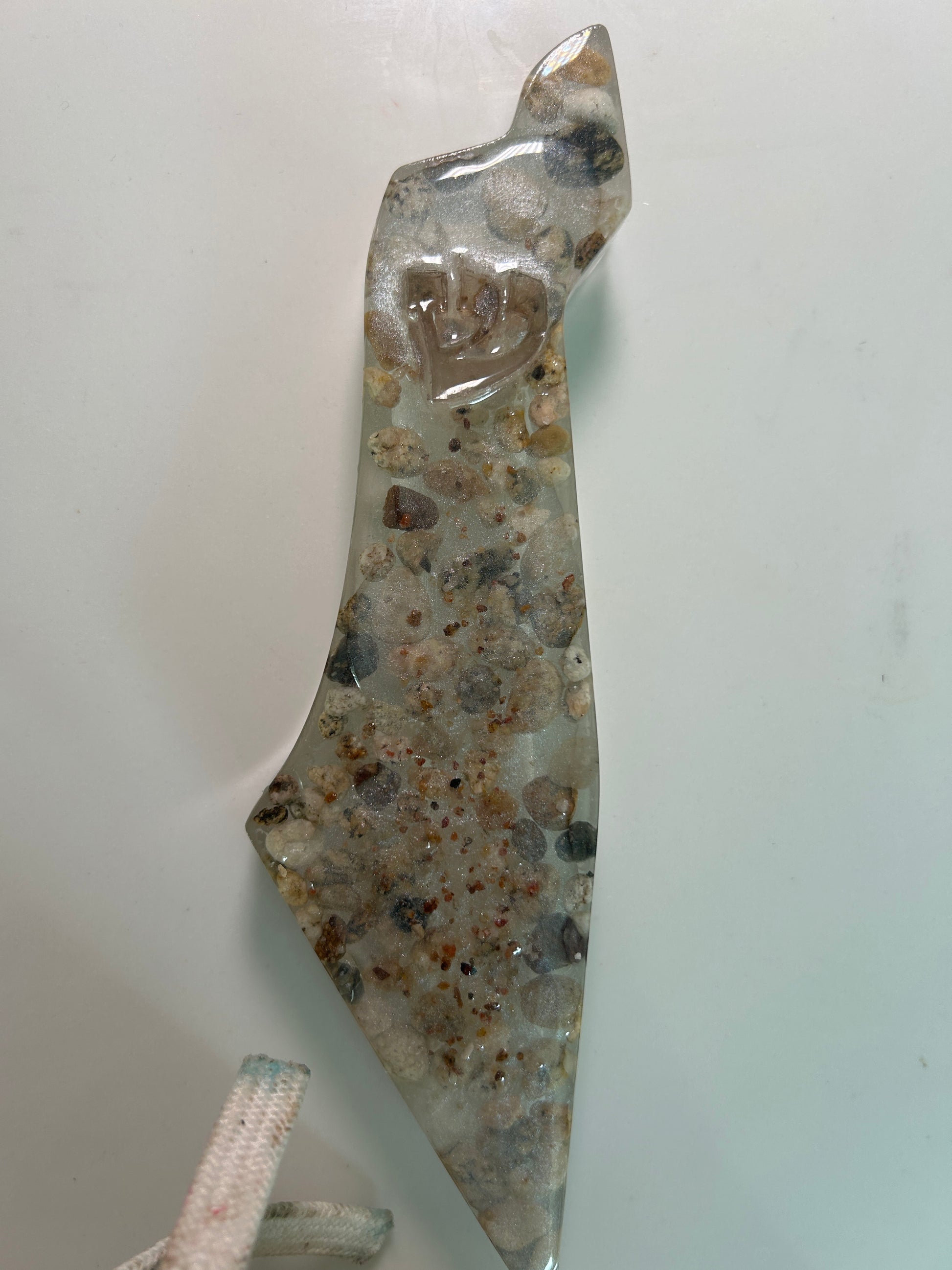 Elegant handmade Mezuzah Case in the shape of the Map of Israel. measuring 7 1/2" by 2" by 1/2", is crafted from Epoxy and river bubbles for a unique blend of durability and natural beauty. Designed to protect a 5" parchment scroll (not included), each piece features a distinctive, one-of-a-kind design. Available special order in your choice of color at no additional cost, this sophisticated case offers both protection and personalized style