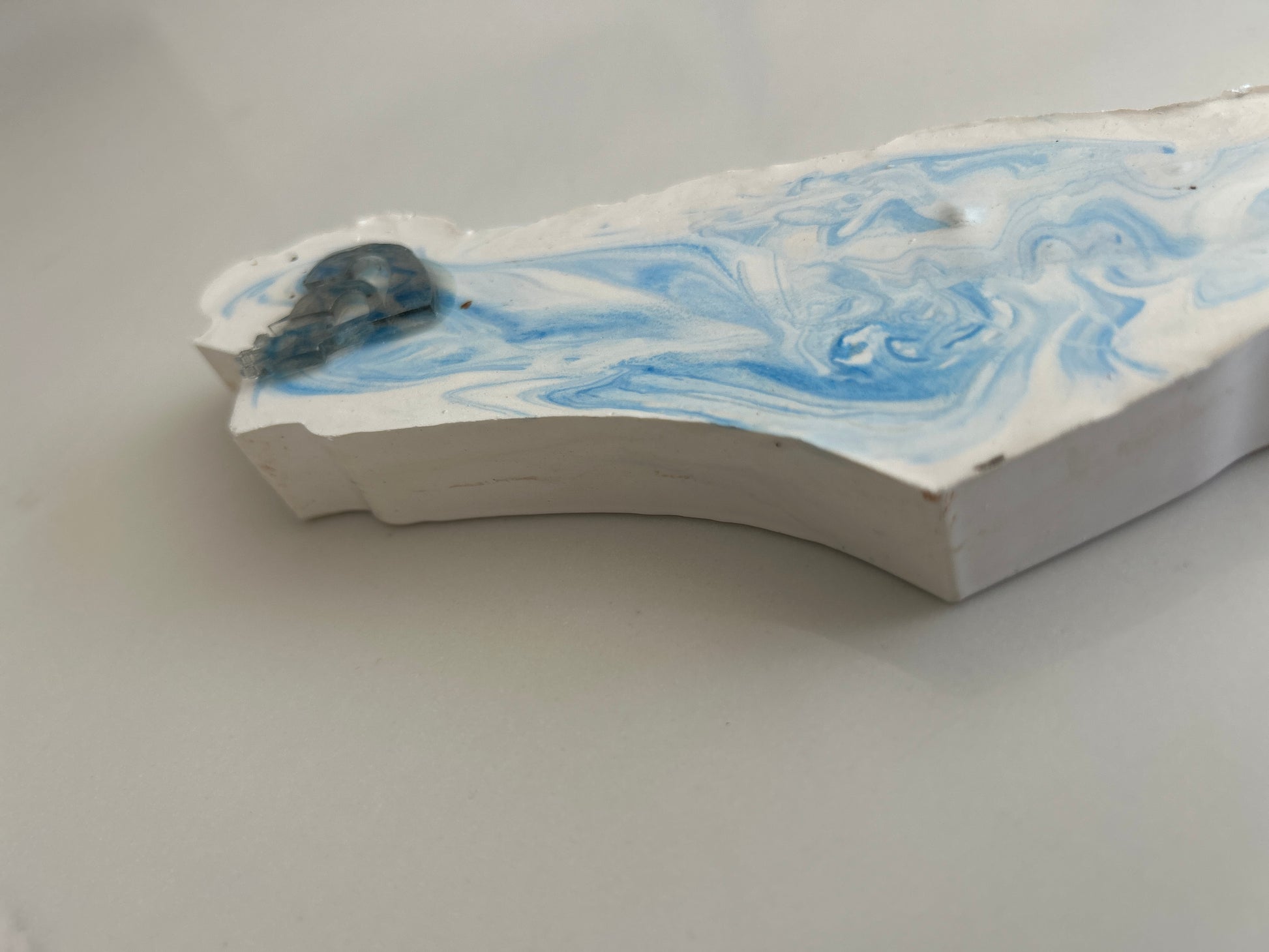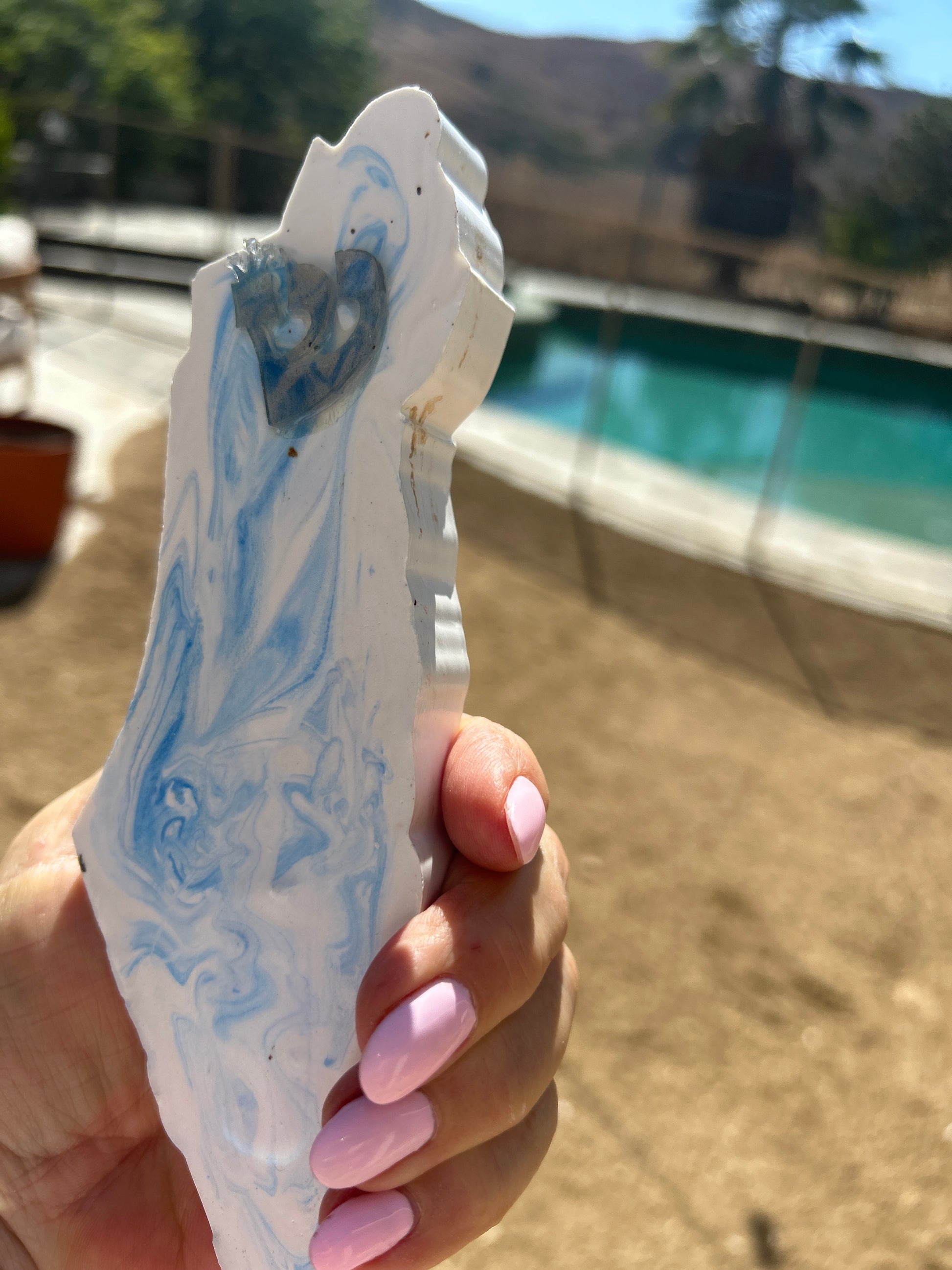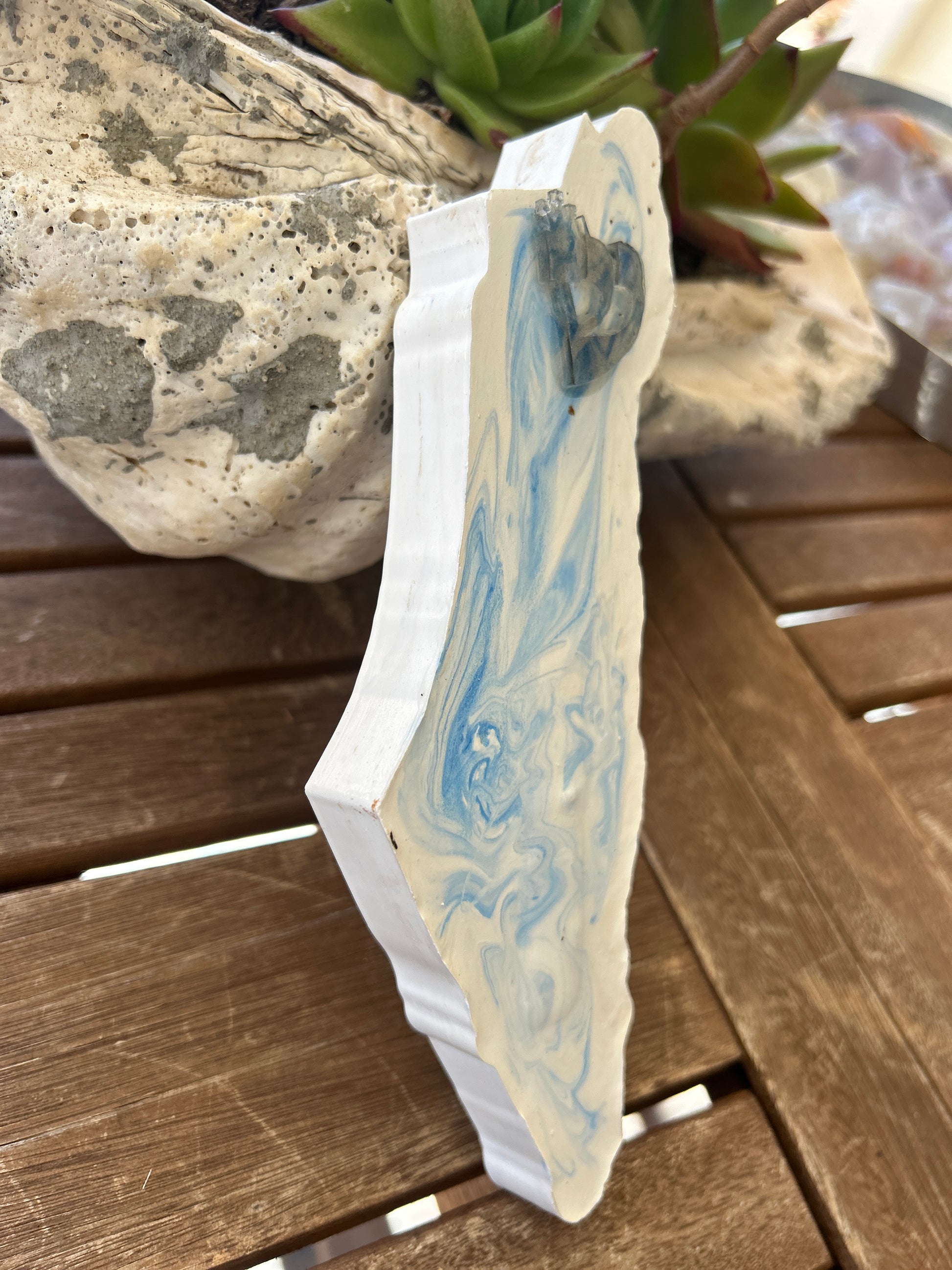 The Mezuzah Case blue marble, in the shape of the Map of Israel artfully blends durability with refined design. Made from sturdy polymer concrete. it measures 8" by 2 3/4" by 3/4" and is designed to protect a 5" parchment scroll (not included). Each handcrafted piece carries a unique character. Offered by special order with your choice of color at no extra charge, this elegant case brings personalized protection and meaningful style, with shipping included.