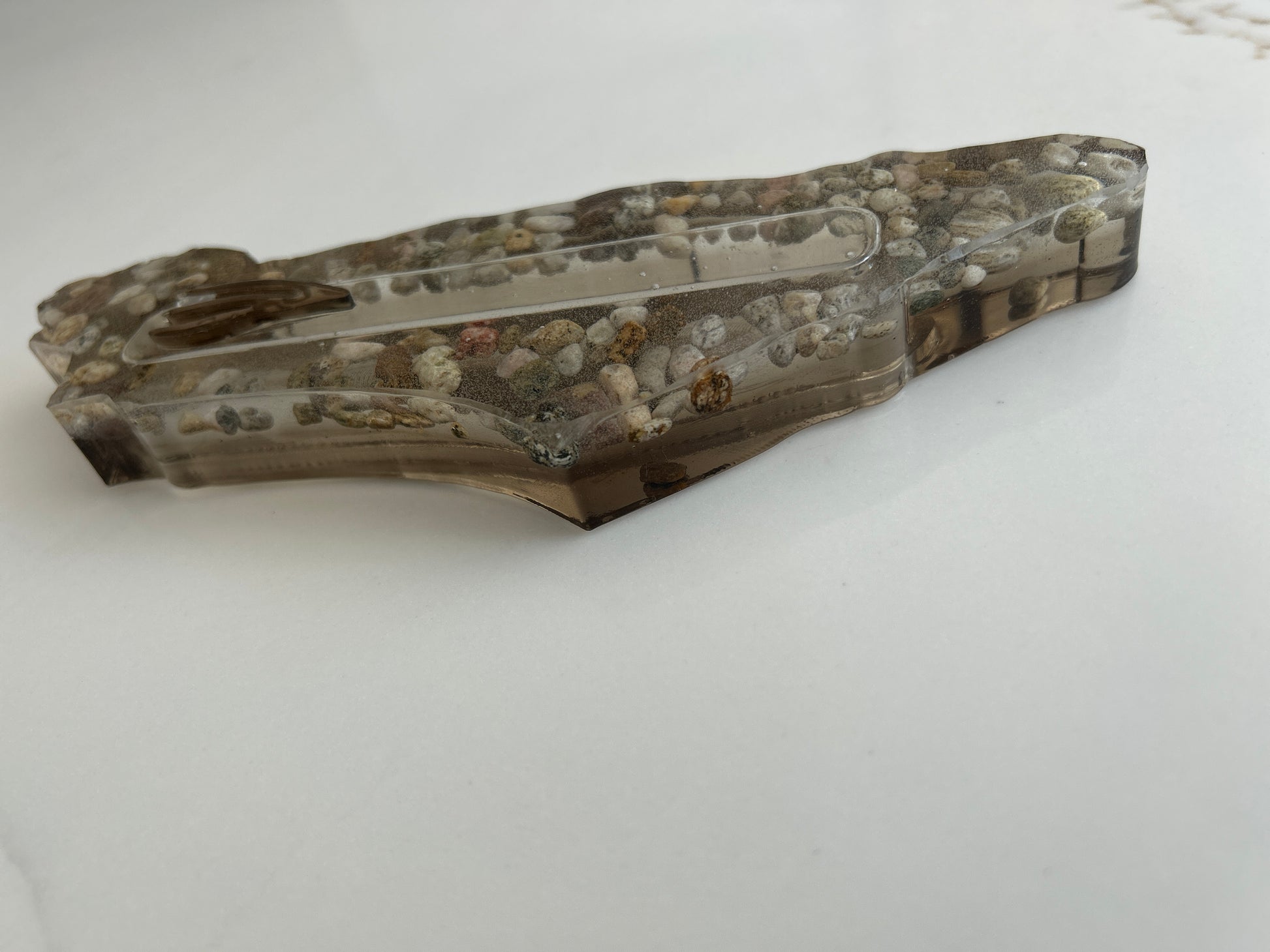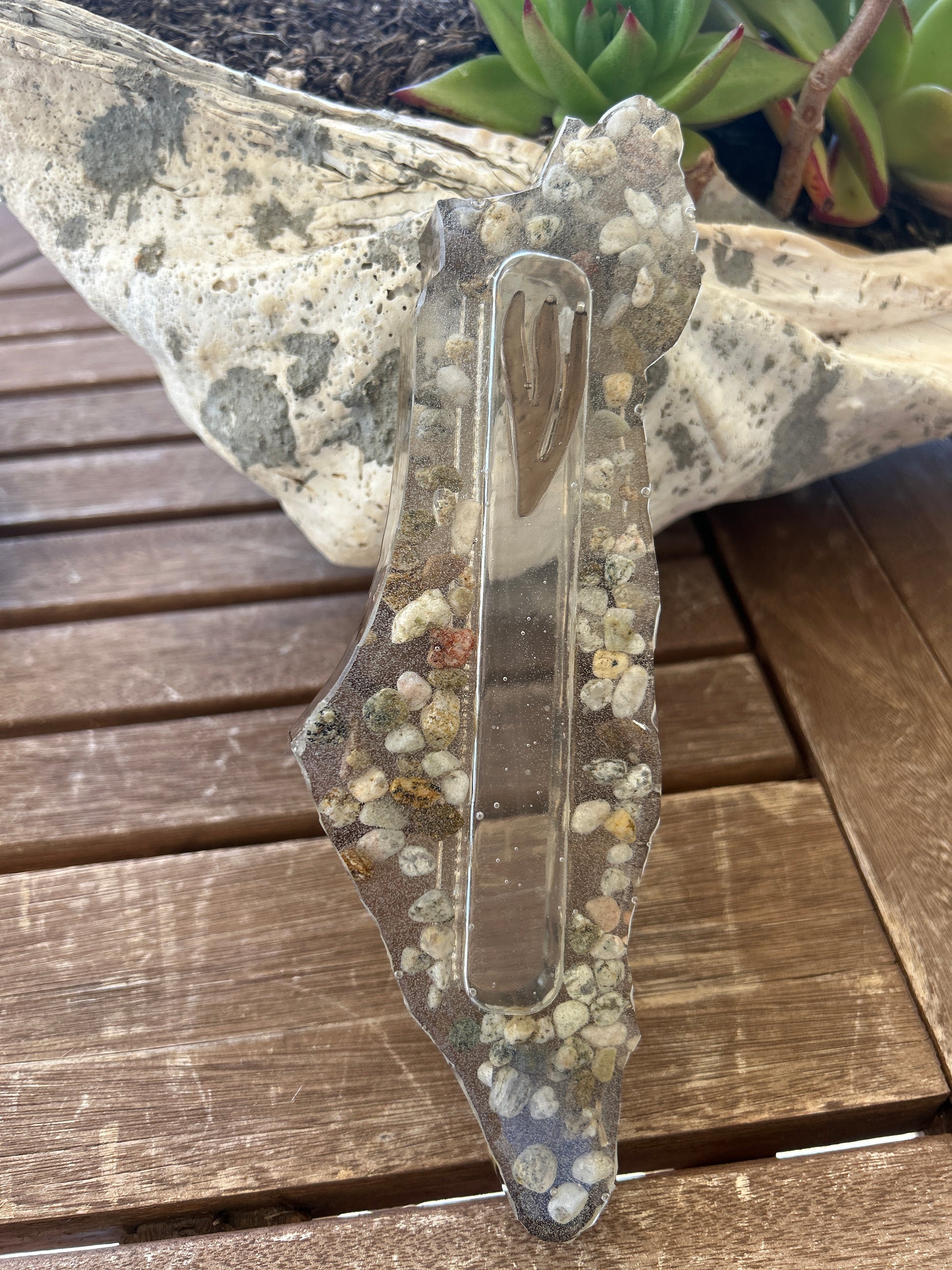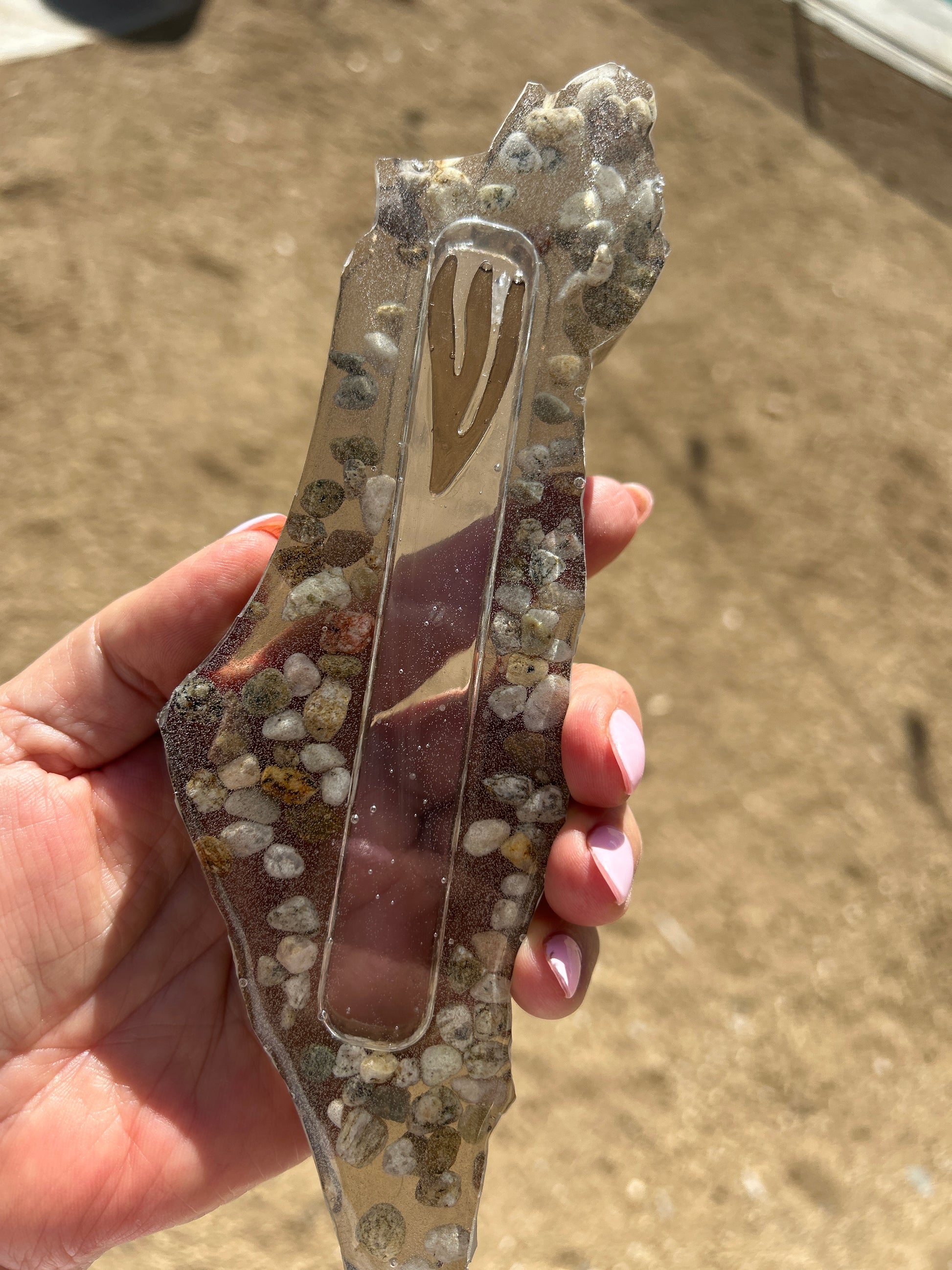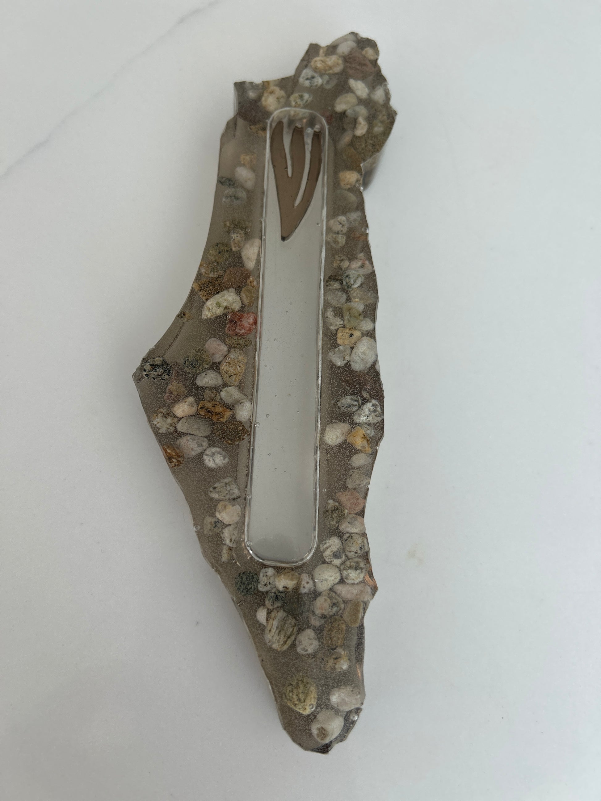 Mezuzah Case River Pebbles. This elegant handmade Mezuzah Case, measuring 8" by 2 3/4" by 3/4", is crafted from epoxy, glass and river bubbles.for a unique blend of durability and natural beauty. Designed to protect a 5" parchment scroll (not included), each piece features a distinctive, one-of-a-kind design. Available special order in your choice of color at no additional cost, this sophisticated case offers both protection and personalized style, with shipping included in the price.
