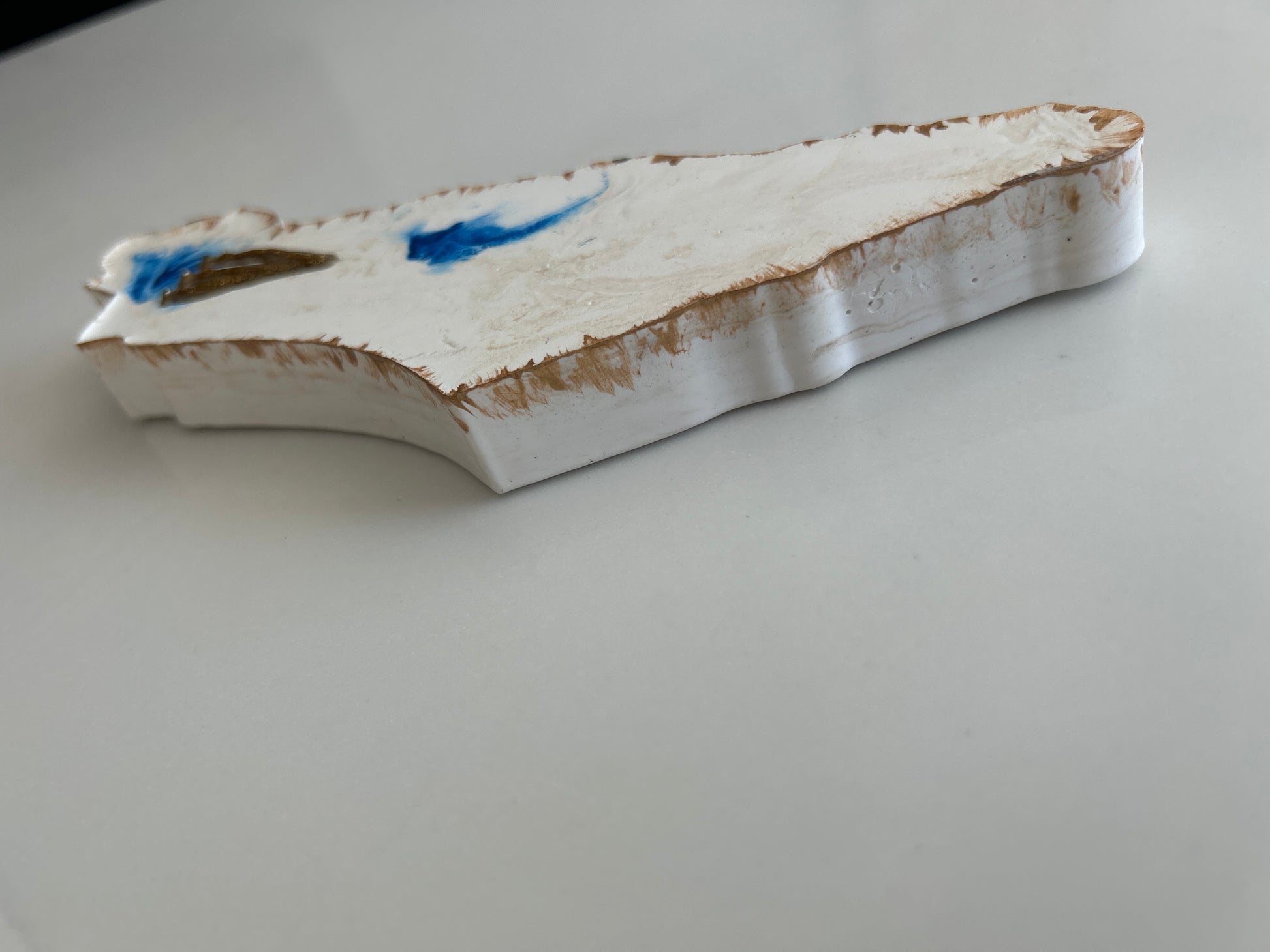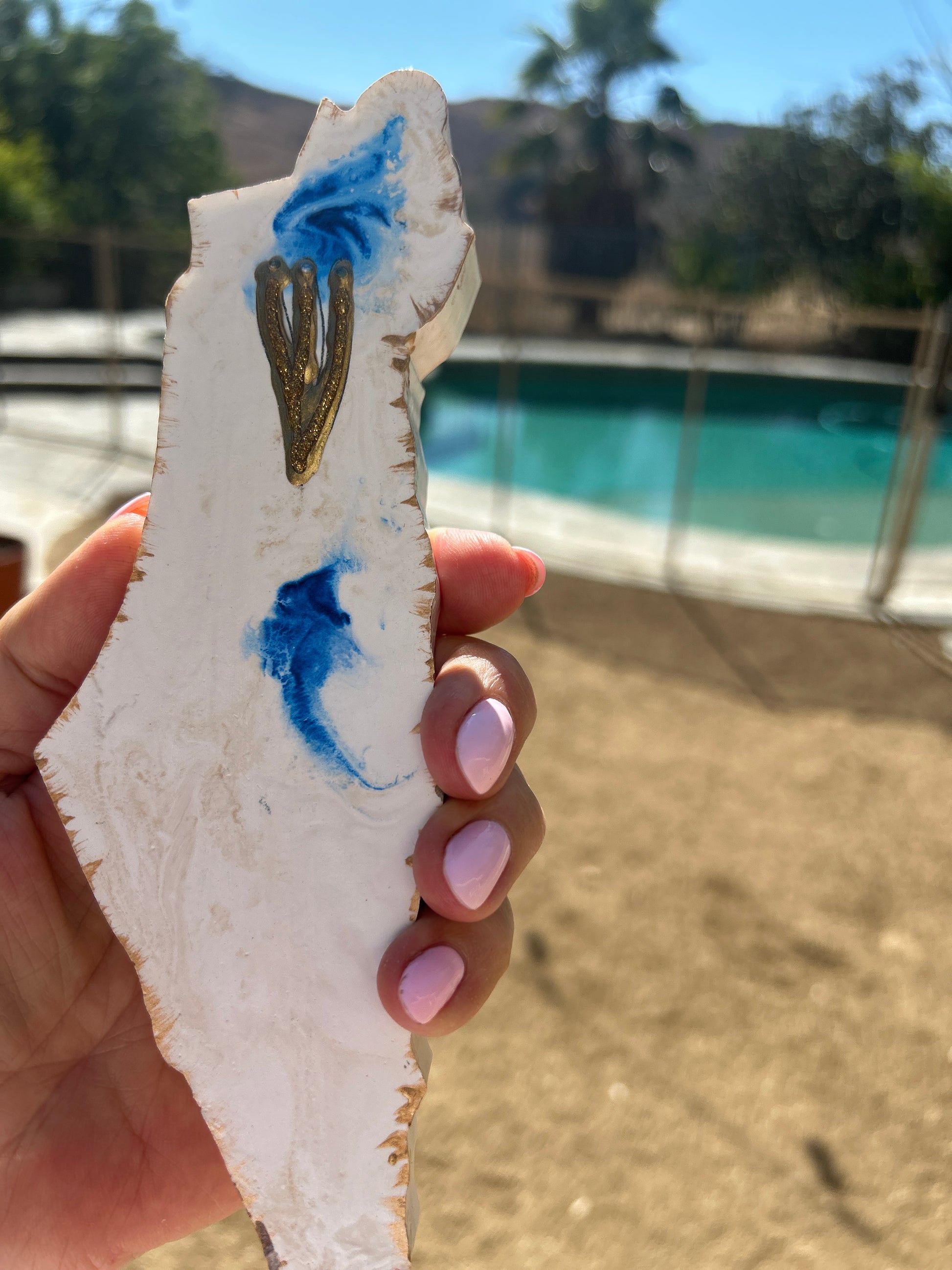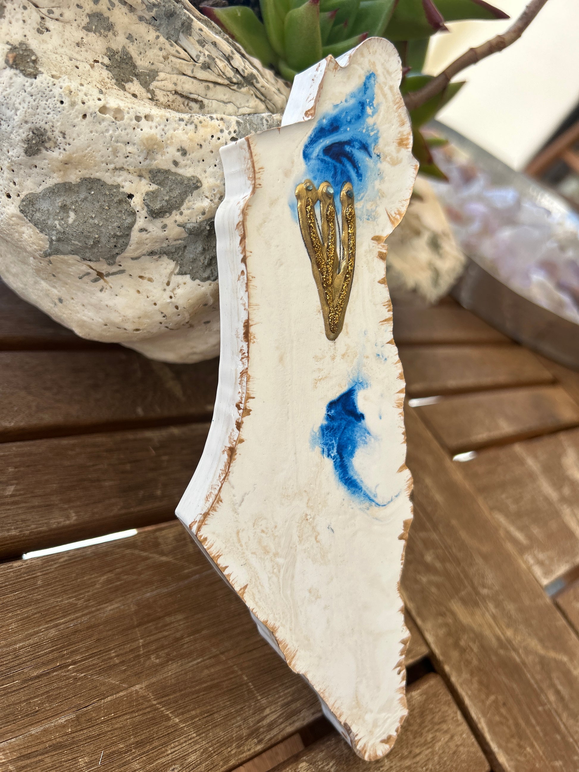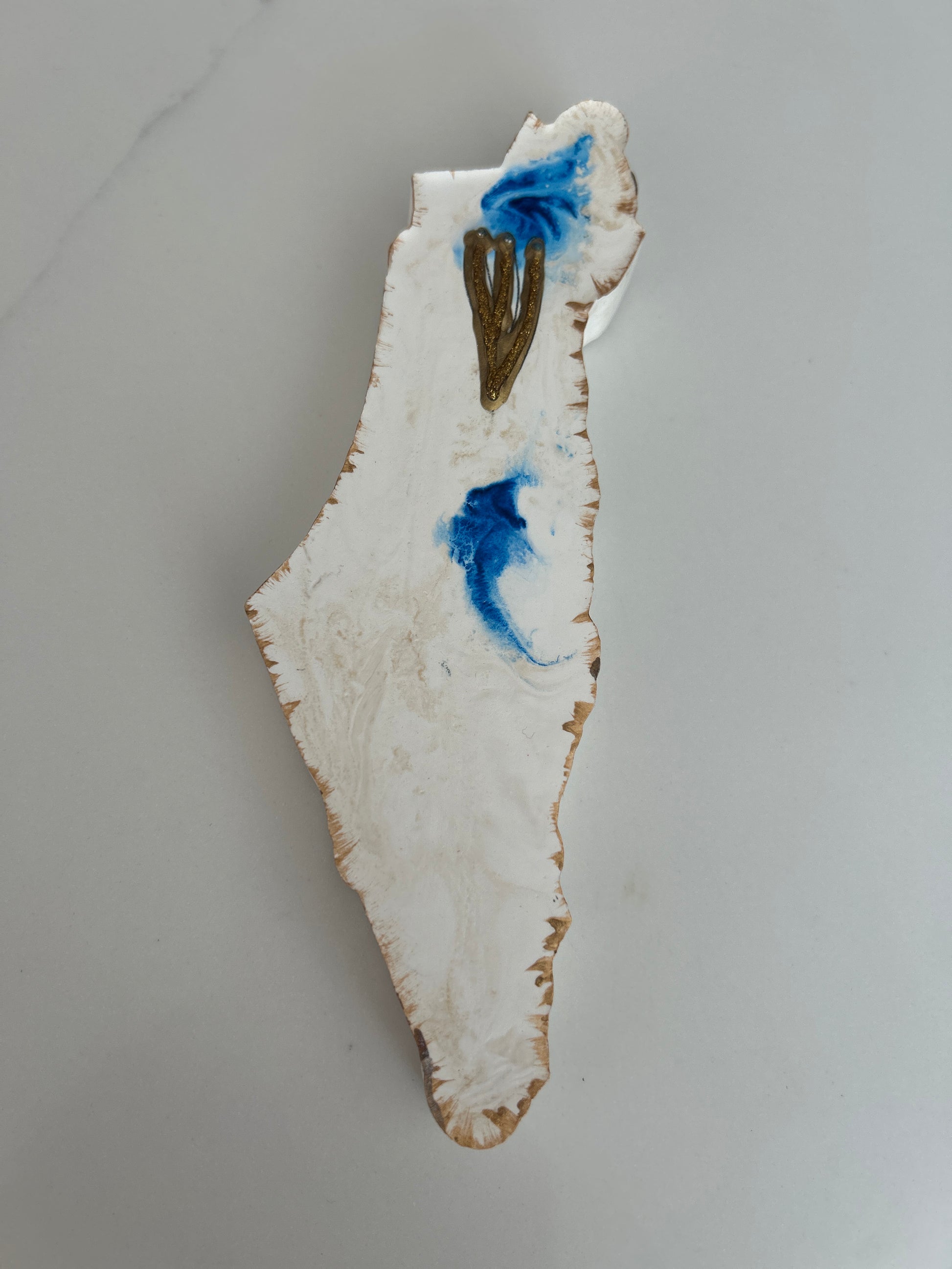 The Mezuzah Case marble gold & blue, in the shape of the Map of Israel artfully blends durability with refined design. Made from sturdy polymer concrete. it measures 8" by 2 3/4" by 3/4" and is designed to protect a 5" parchment scroll (not included). Each handcrafted piece carries a unique character. Offered by special order with your choice of color at no extra charge, this elegant case brings personalized protection and meaningful style, with shipping included.