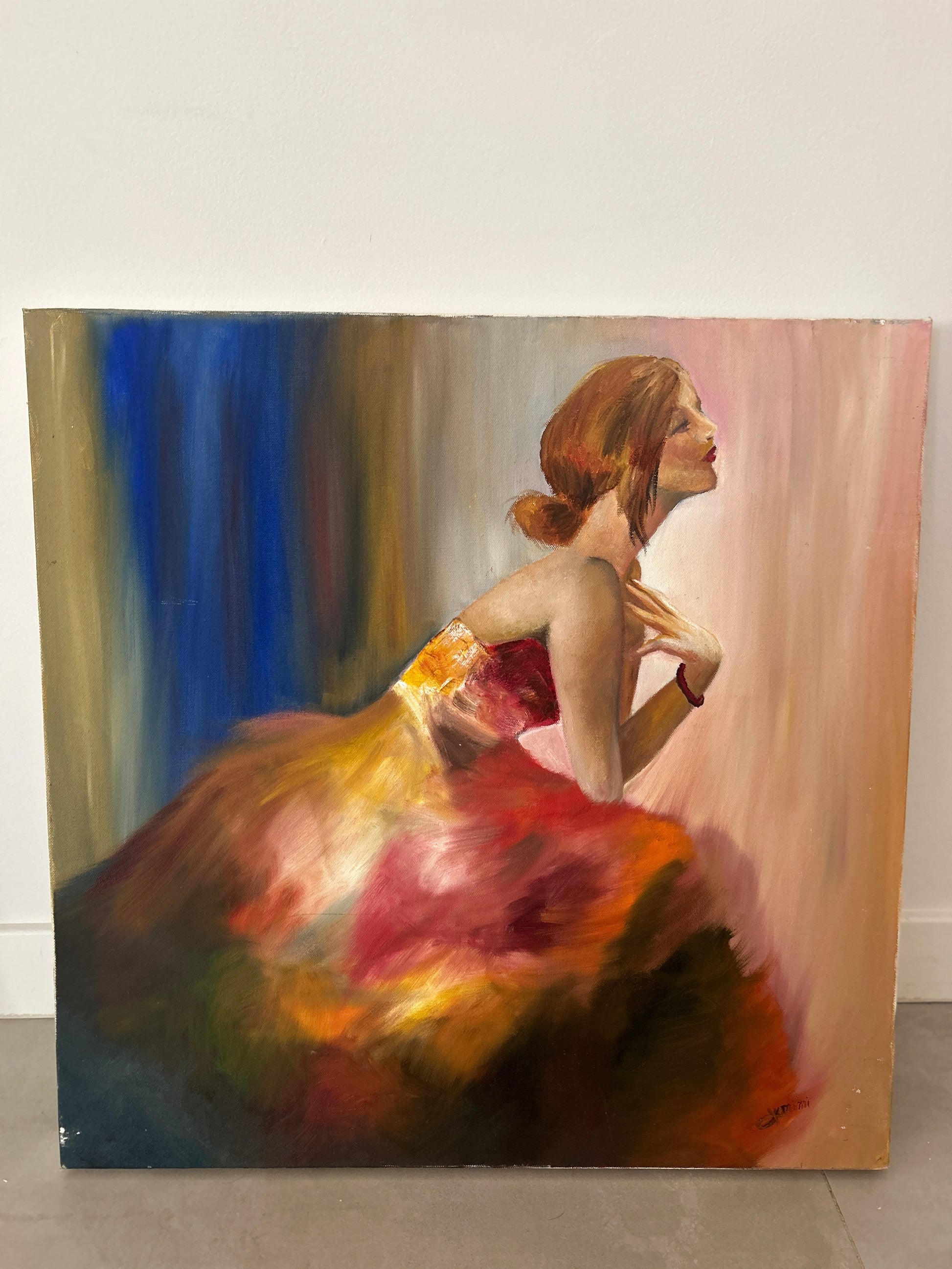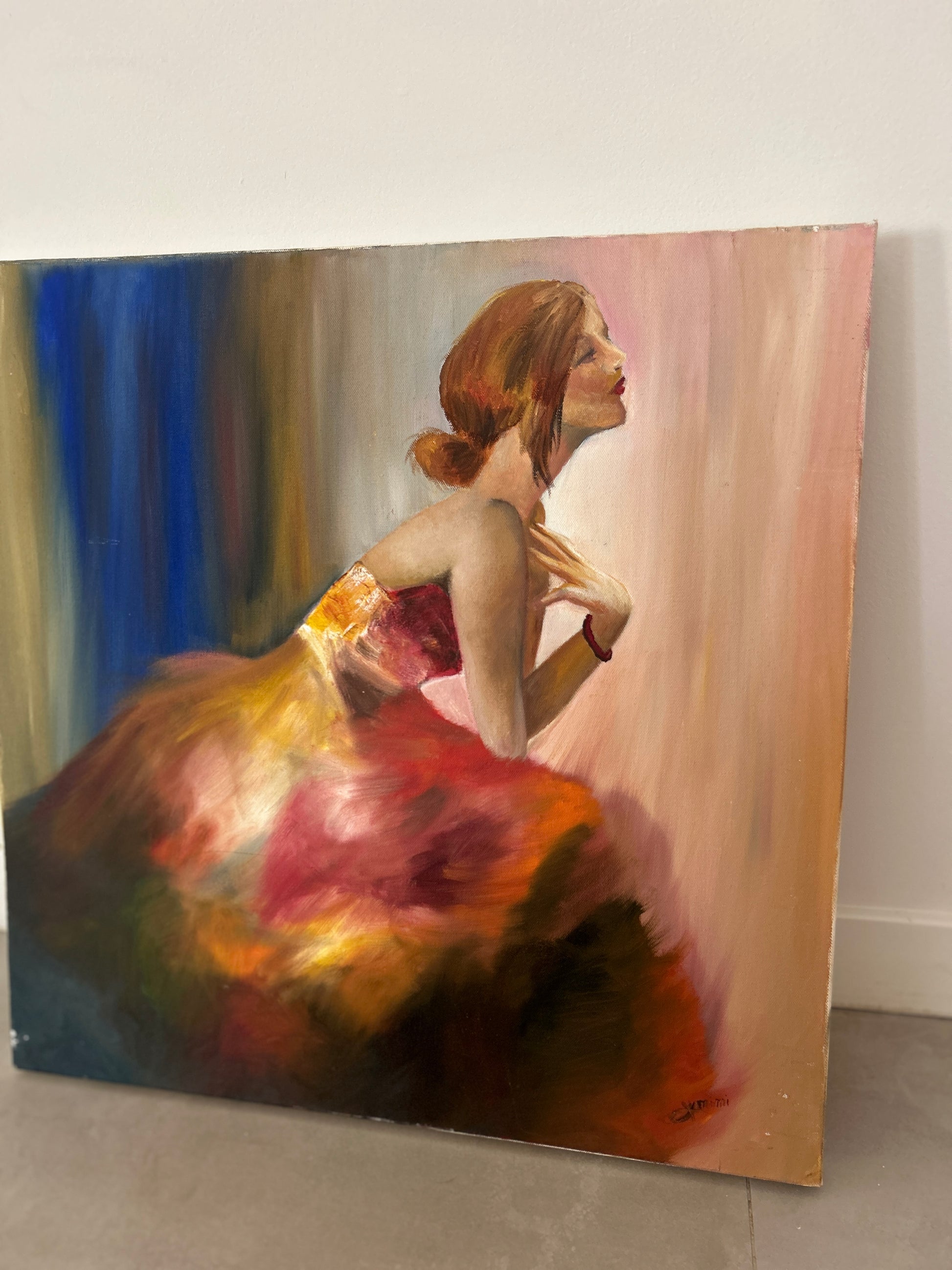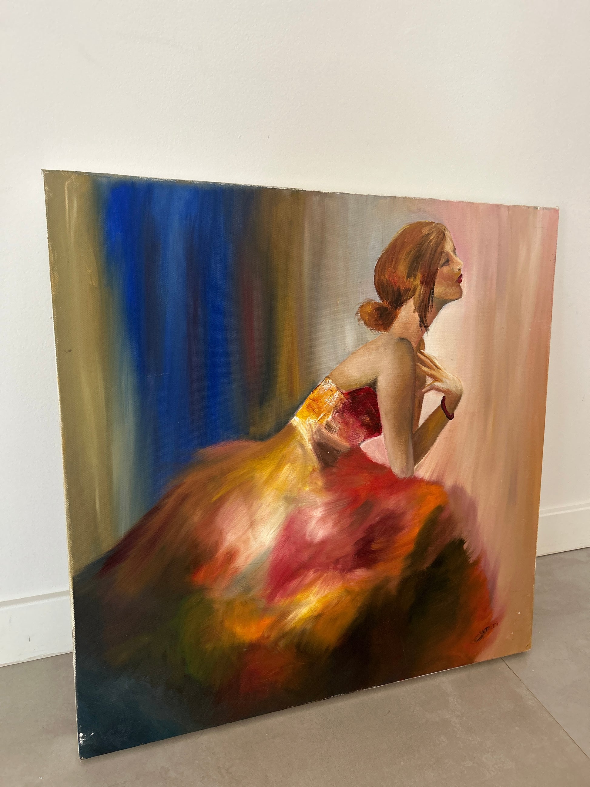 Acrylic painting on canvas titled "Elegant Thinking Woman." Measures 24"x24" and evokes a romantic, refined atmosphere. Price includes shipping.
