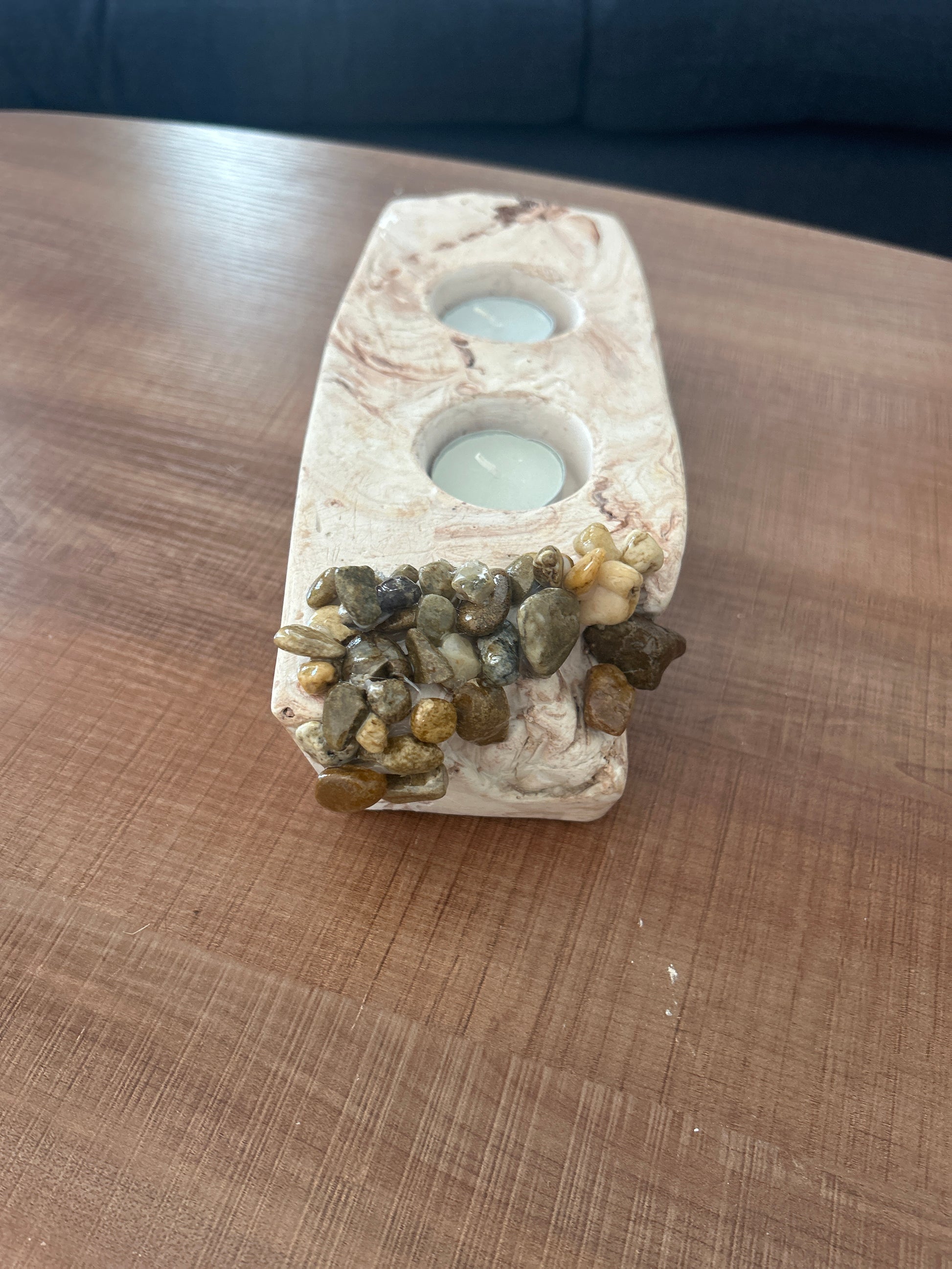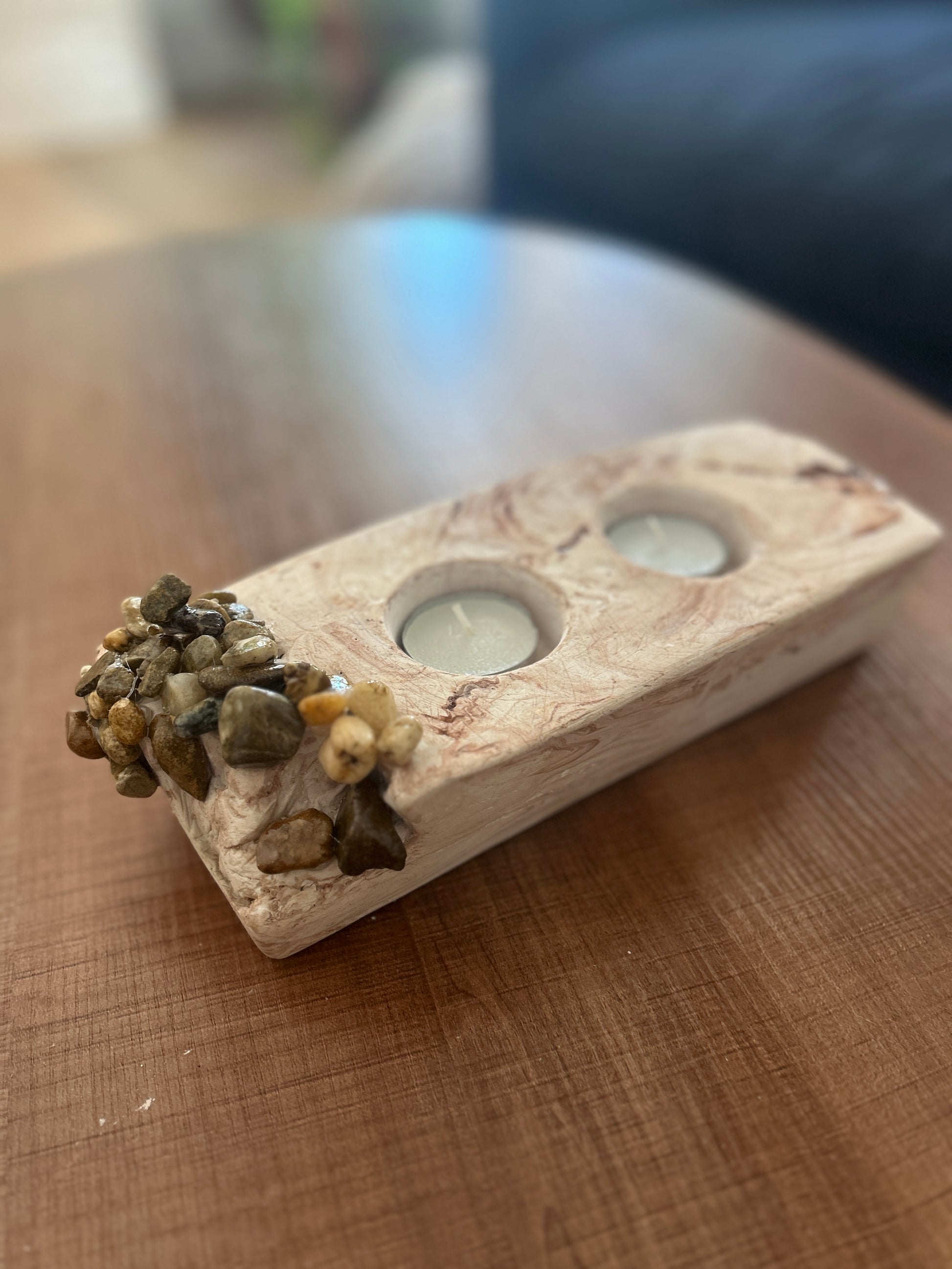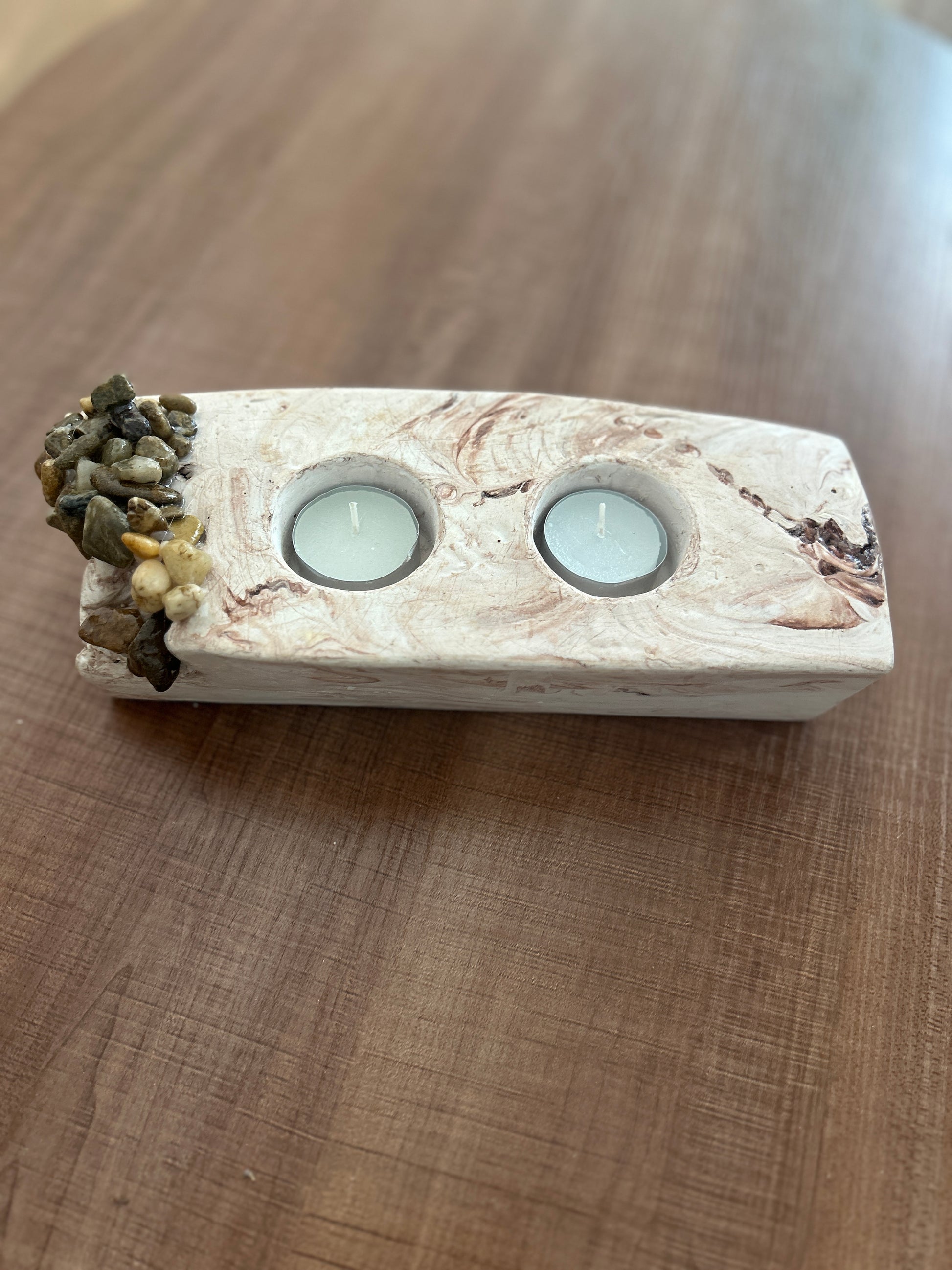 Shabbat Candle Lighting rectangle shaped candle combines a stone concrete blend with river bubbles, creating a refined decorative piece. it offers a soothing, gentle light ideal for cultivating a calm, nature-inspired atmosphere. Measuring 10"x4"x2", its sturdy design ensures lasting use while enhancing your space with understated elegance. Note: shipping is not included.
