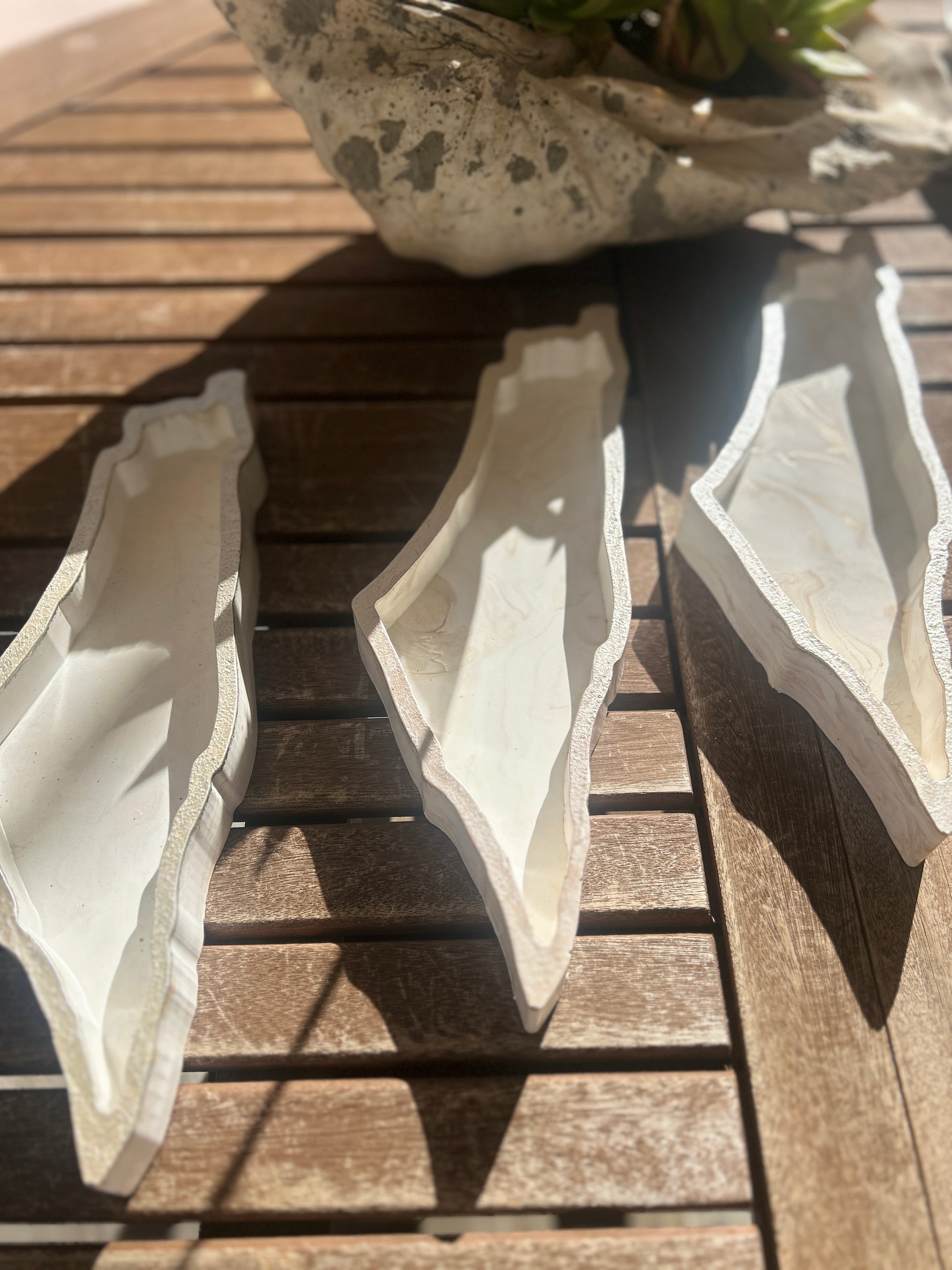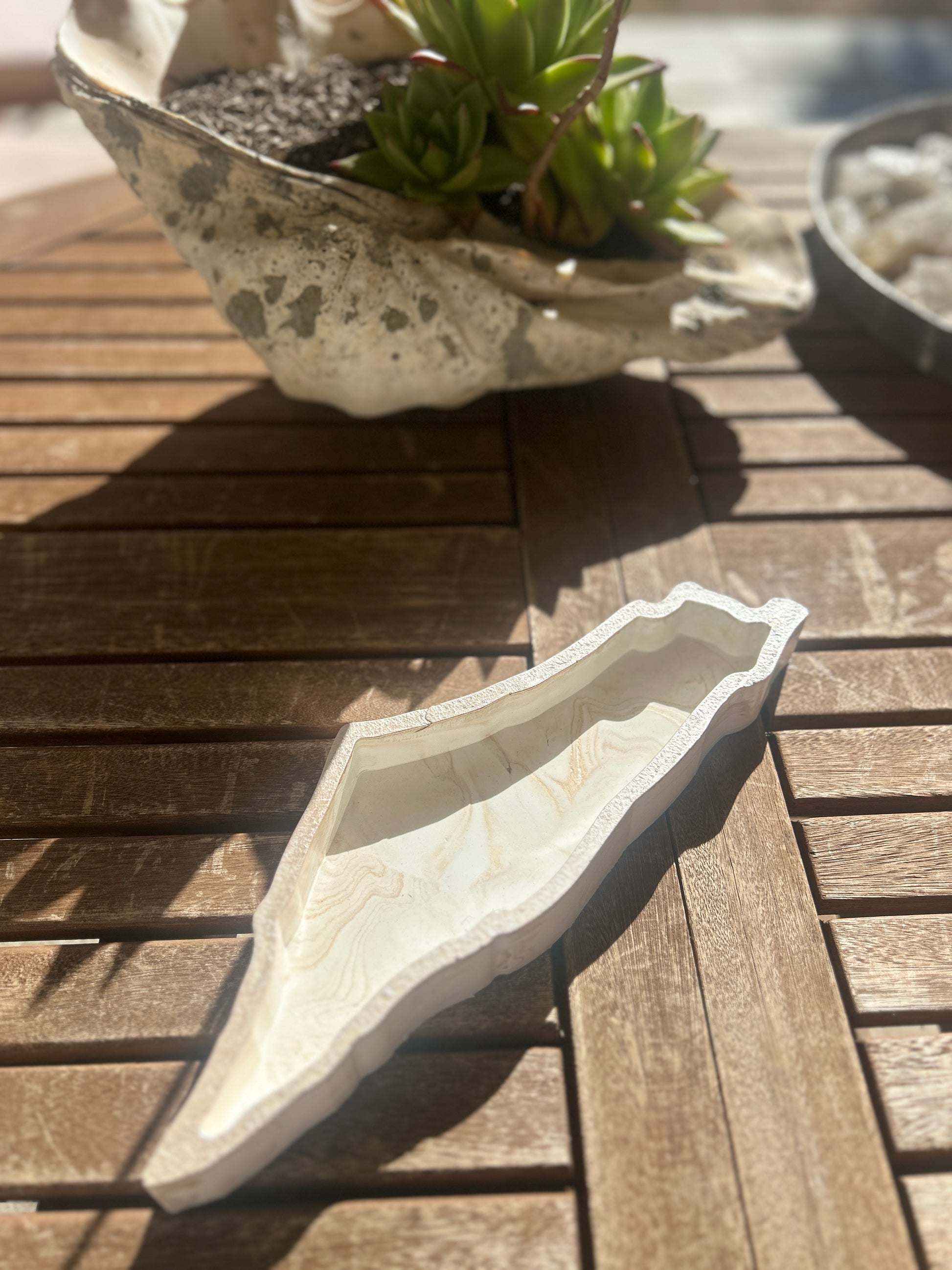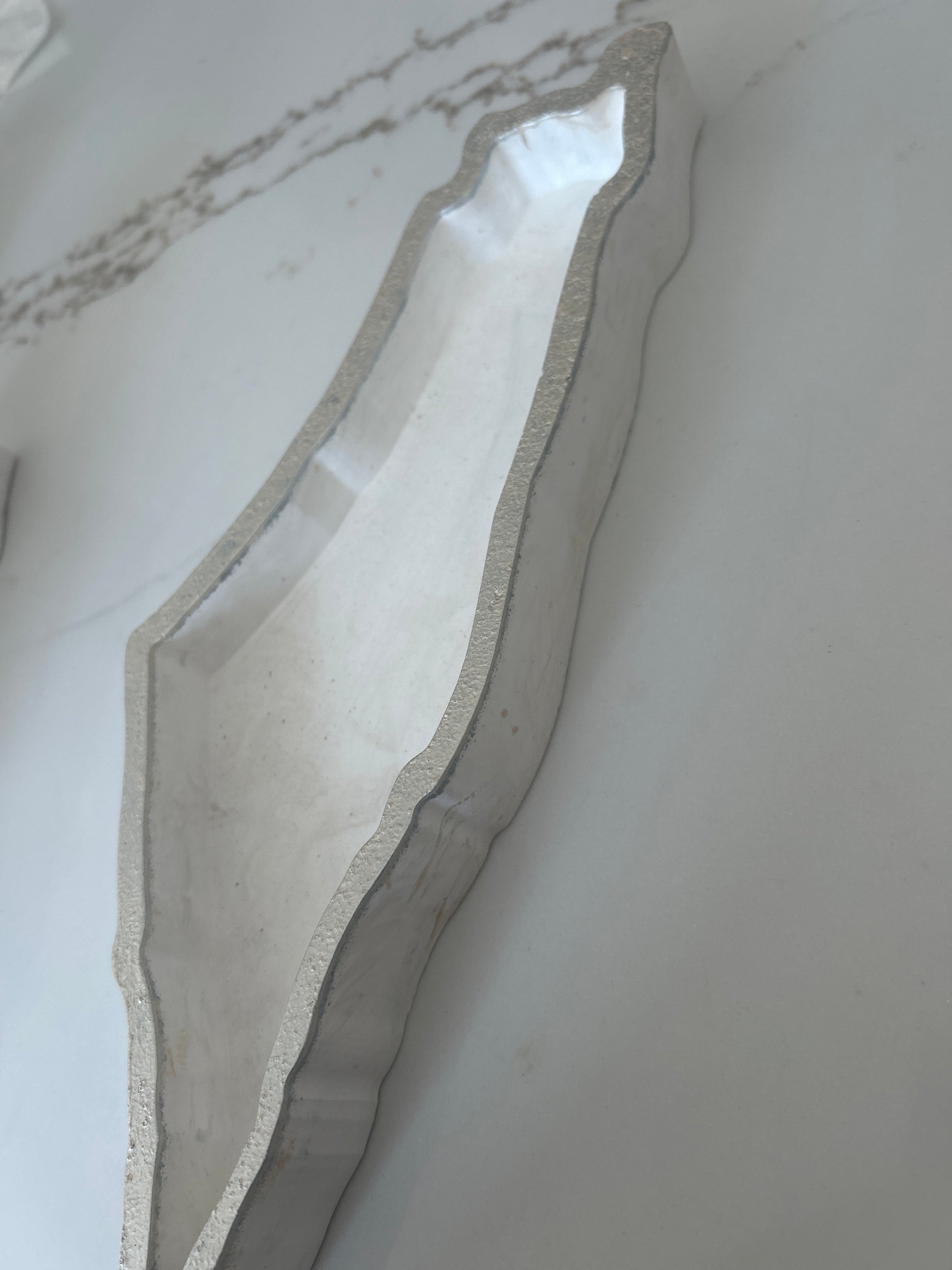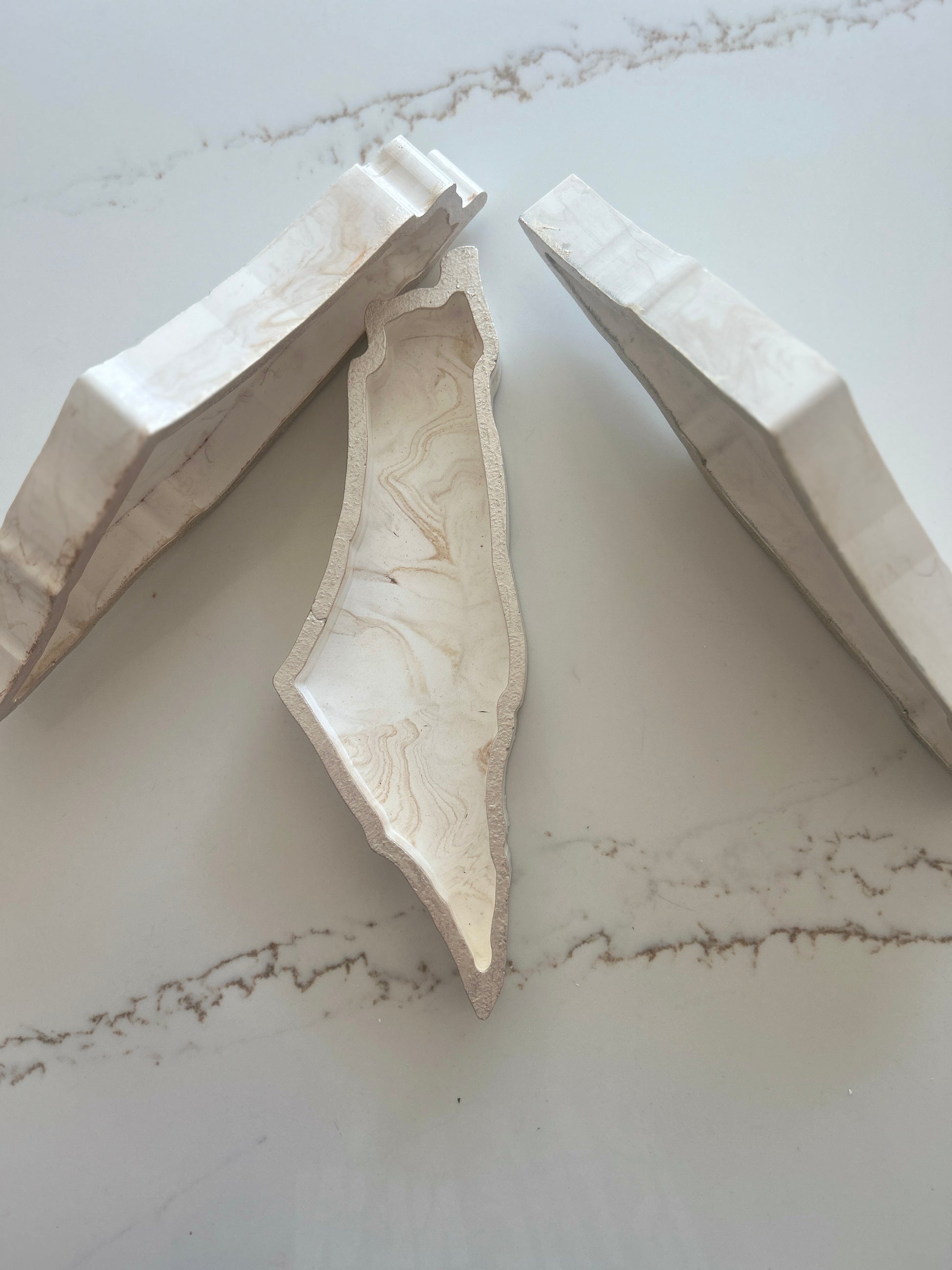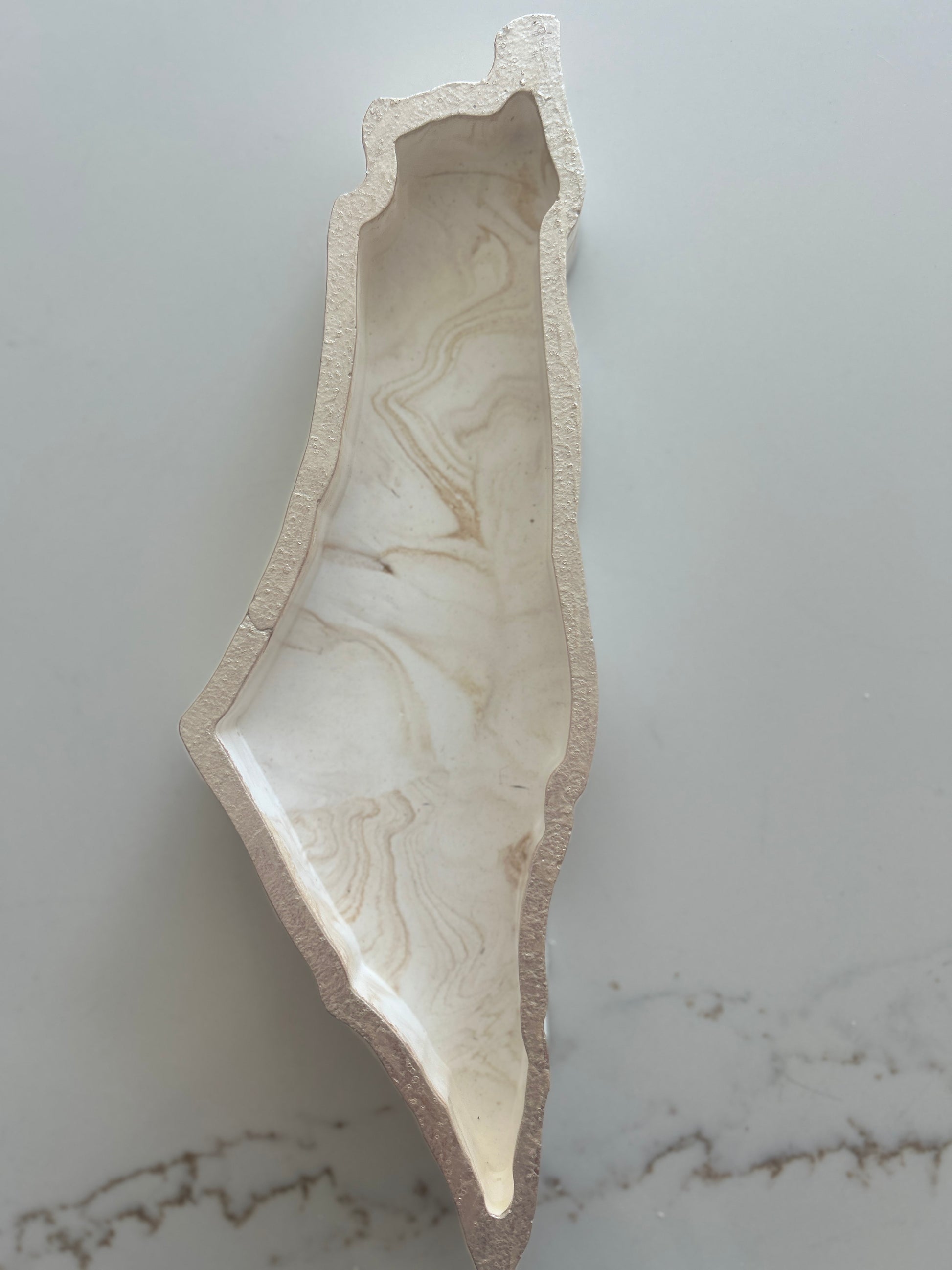 This elegant tray, inspired by the Map of Israel, combines artistry and function perfectly. Crafted from durable polymer with a refined white and opal finish, it features marble accents of gold, can be customizable at no extra cost with the color of your choice. Its 12" x 4" x 1" dimensions make it ideal for organizing jewelry, cosmetics, or enhancing your decor with a subtle, calming presence. This tray is a thoughtful gift for those who value both style and a meaningful connection to Israel, with shipping included. Available individually or as a set to suit your needs.