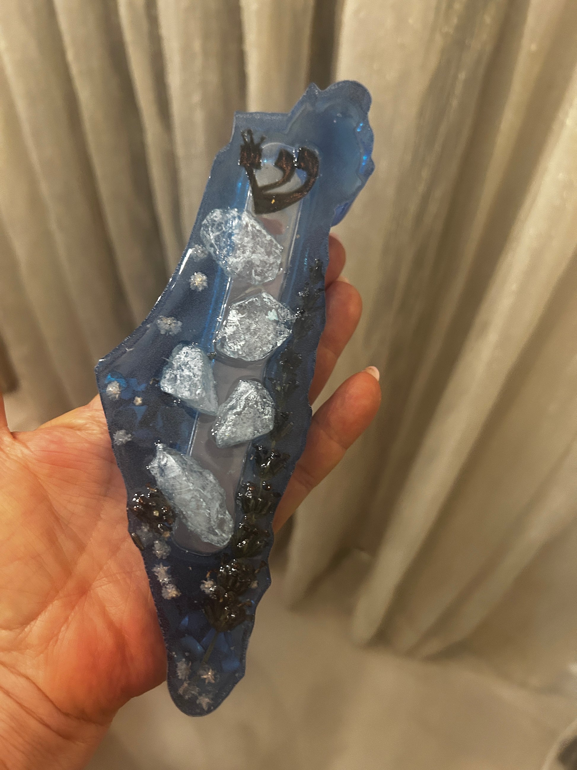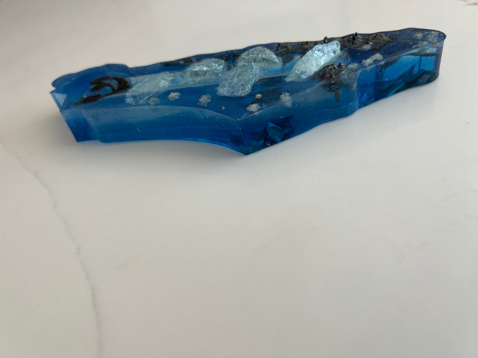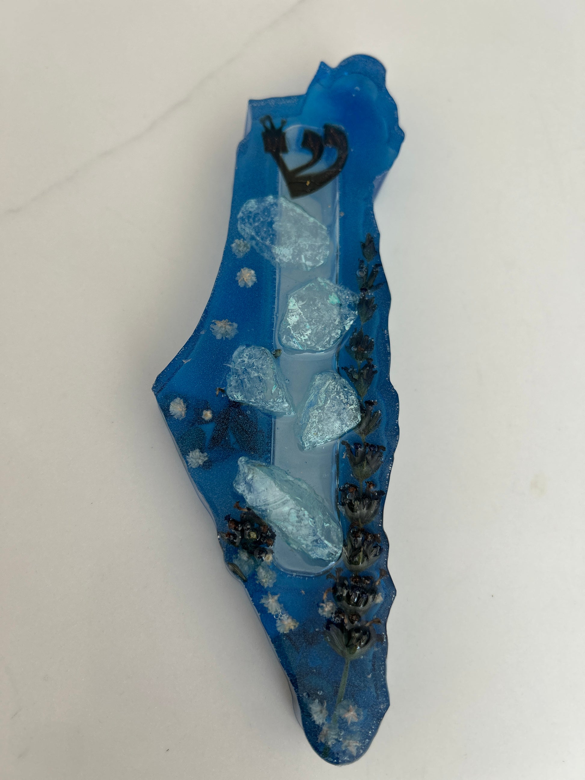 This elegant handmade Mezuzah Case, measuring 8" by 2 3/4" by 3/4", is crafted from epoxy, glass, and dried lavender for a unique blend of durability and natural beauty. Designed to protect a 5" parchment scroll (not included), each piece features a distinctive, one-of-a-kind design. Available special order in your choice of color at no additional cost, this sophisticated case offers both protection and personalized style, with shipping included in the price.