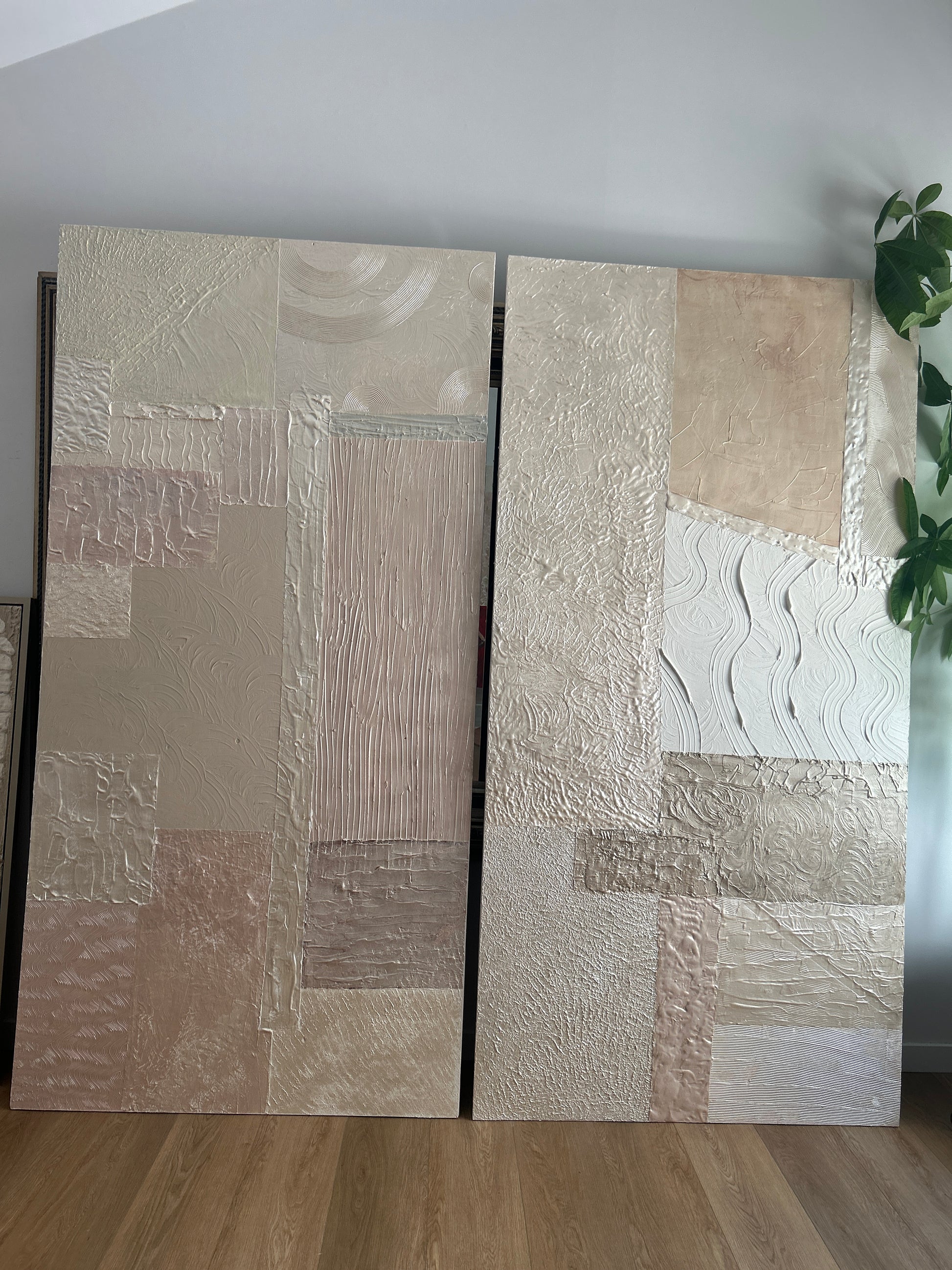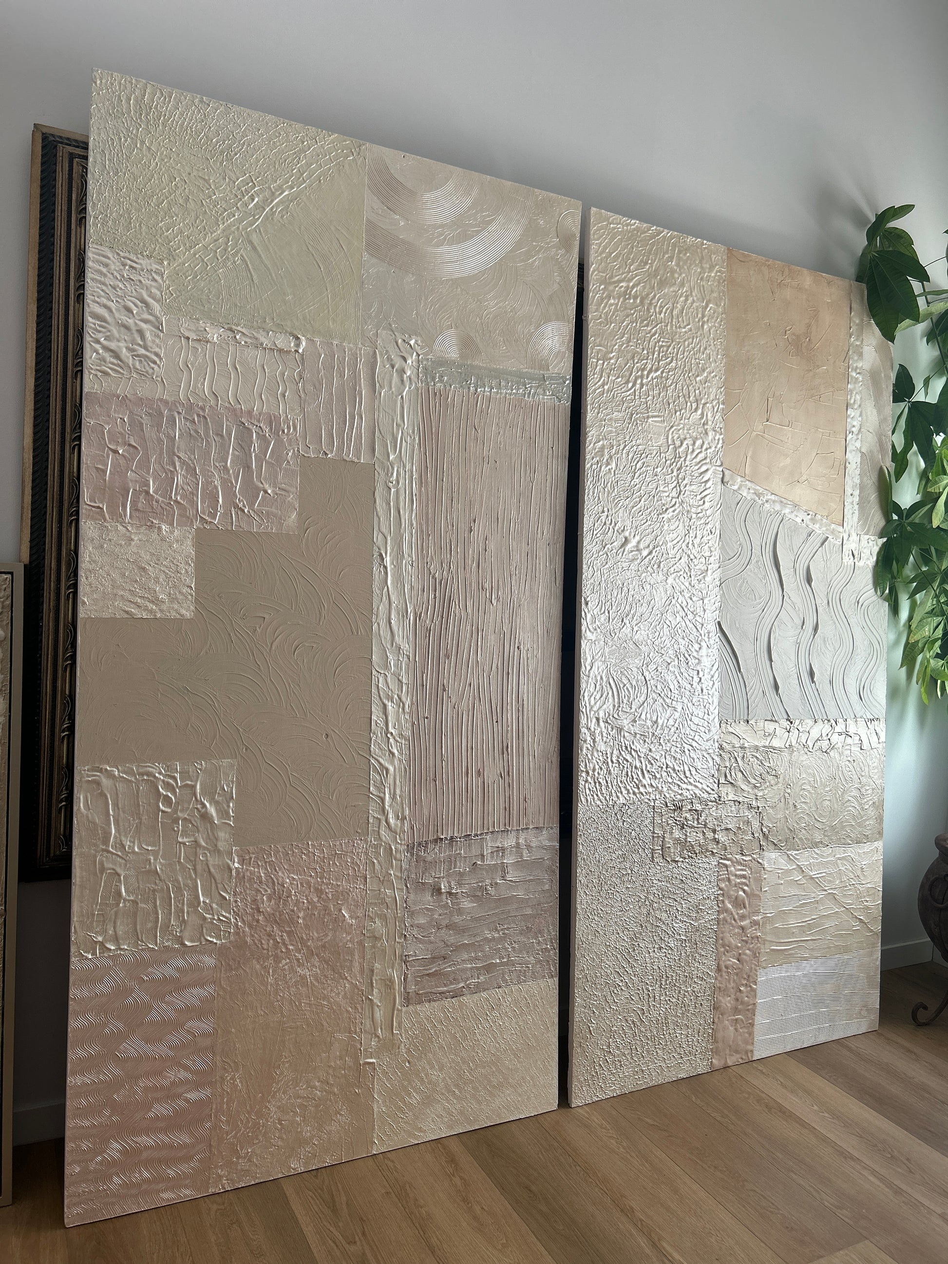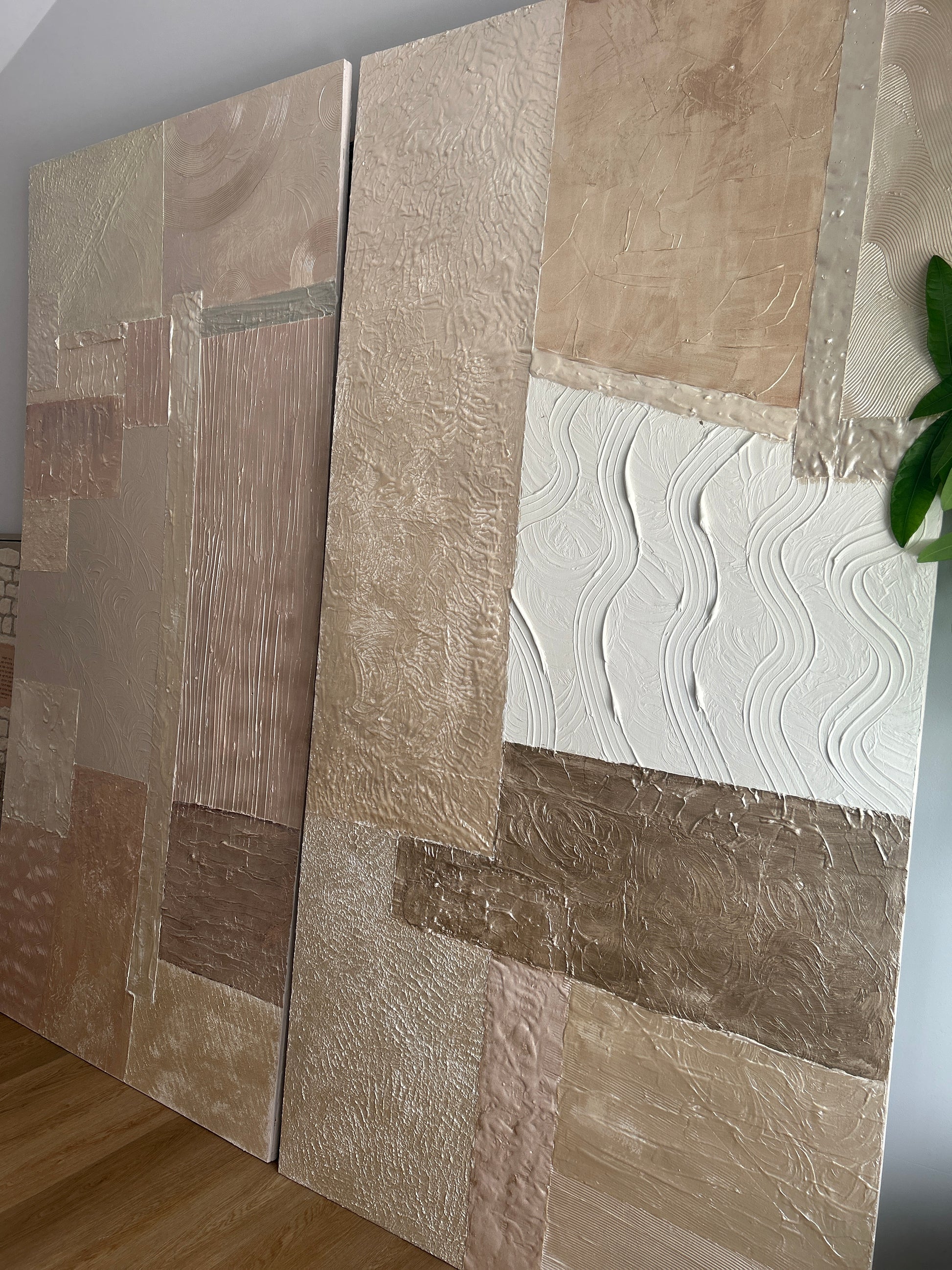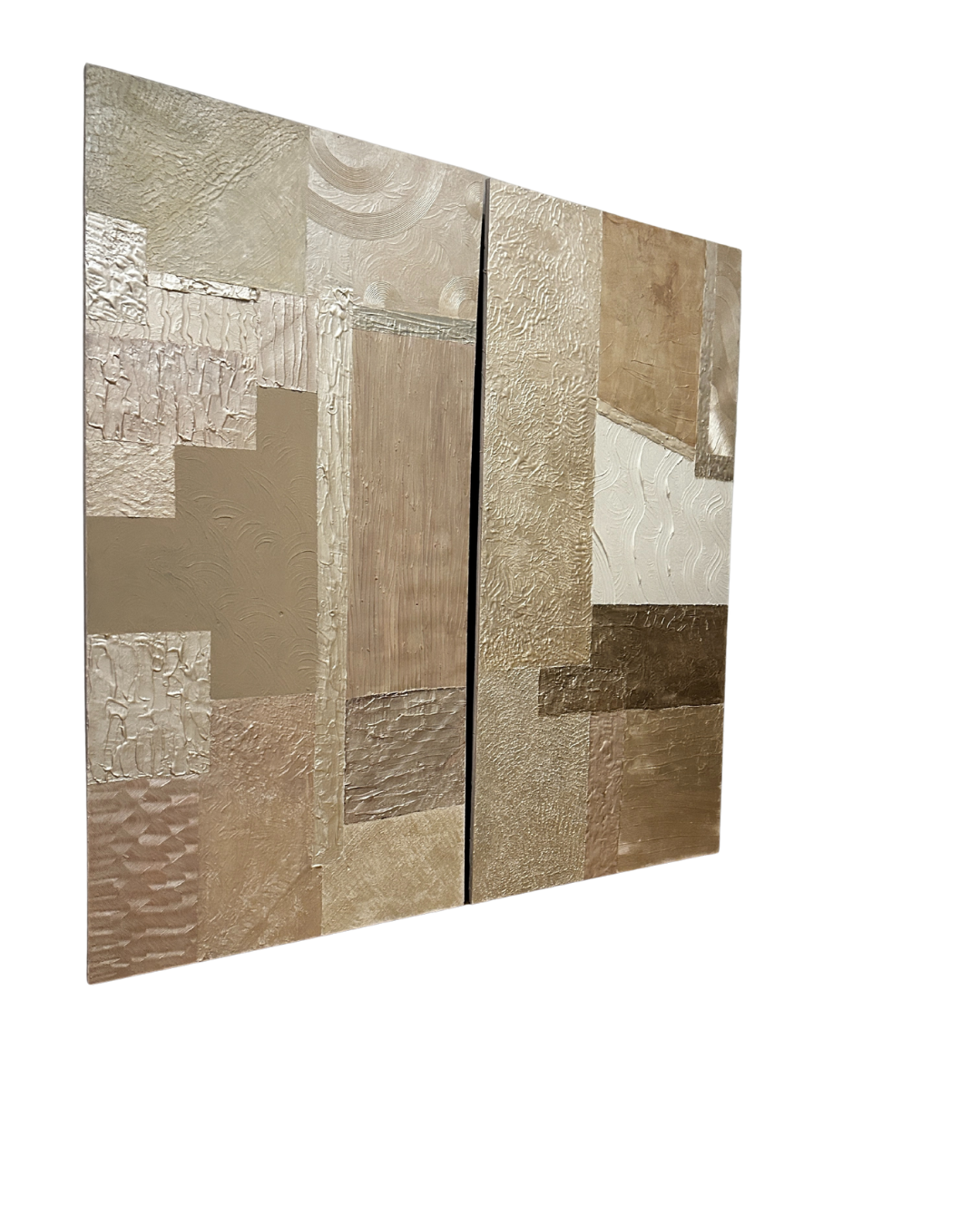 This set features two handmade abstract paintings crafted with plaster and acrylic on wood. Each piece measures 4' by 8', combining for a total display size of 8' by 8'. The artworks showcase metallic earth tone hues, embodying a contemporary abstract aesthetic.